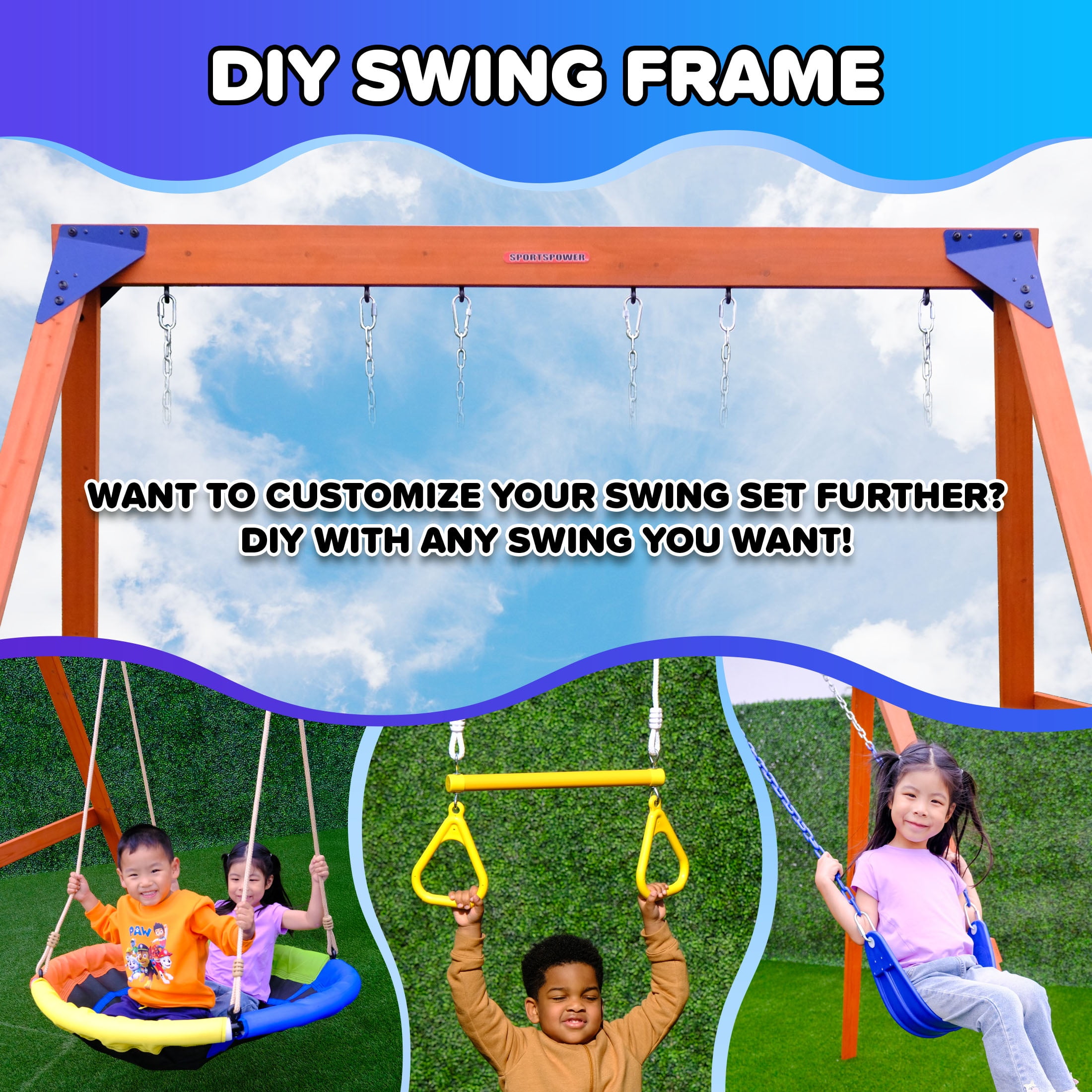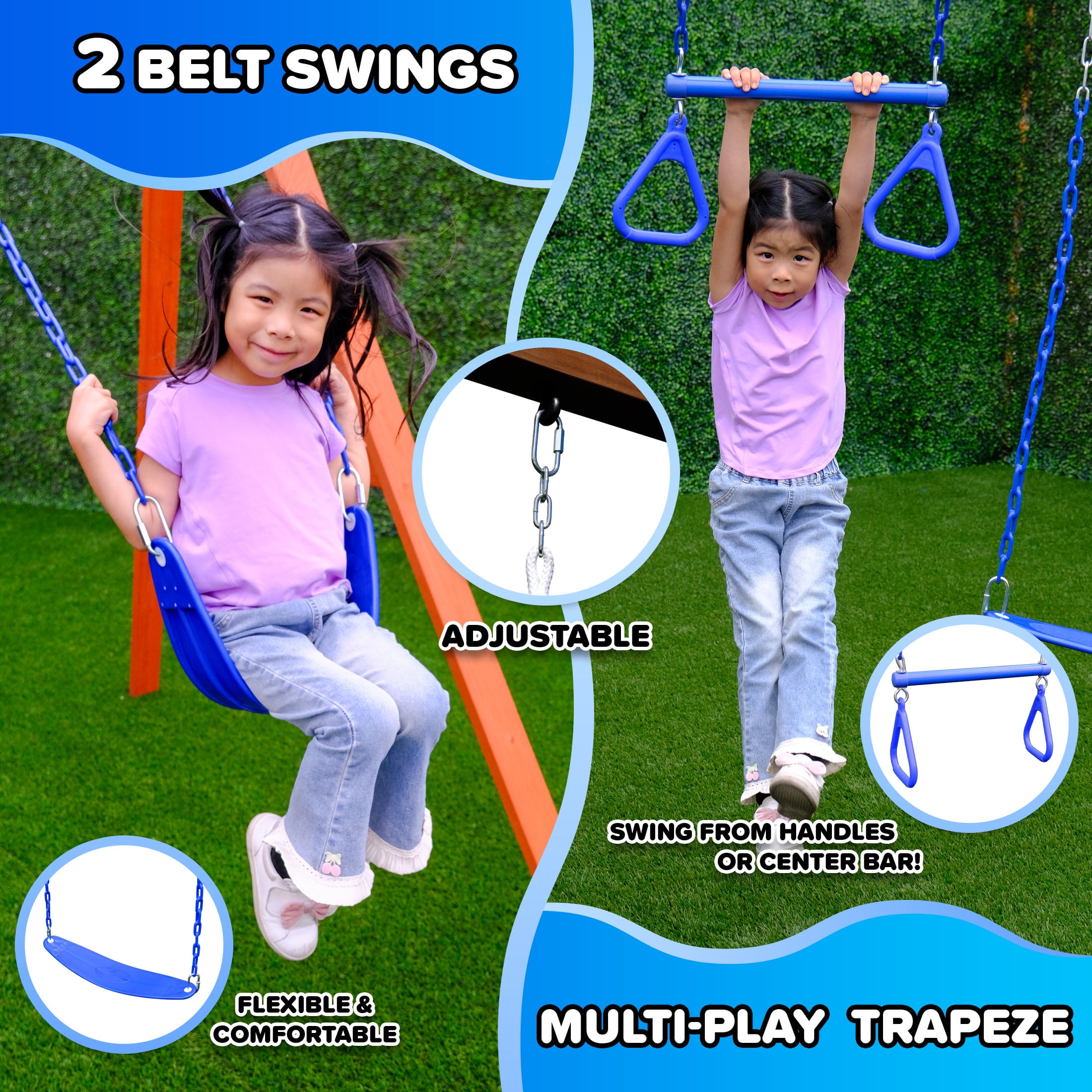 Sturdy frame constructed of heavy-duty wood, denser than other brands on the market Two sling swings with vinyl-coated chain One metal trapeze for acrobatic fun All three swings are adjustable to accomdate growing kids Accomodates up to 3 kids, from 3 to 8 years old Meets or exceeds all ASTM safety standards BONUS 4-PIECE ANCHOR KIT secures swing set to the ground for extra safety & stability