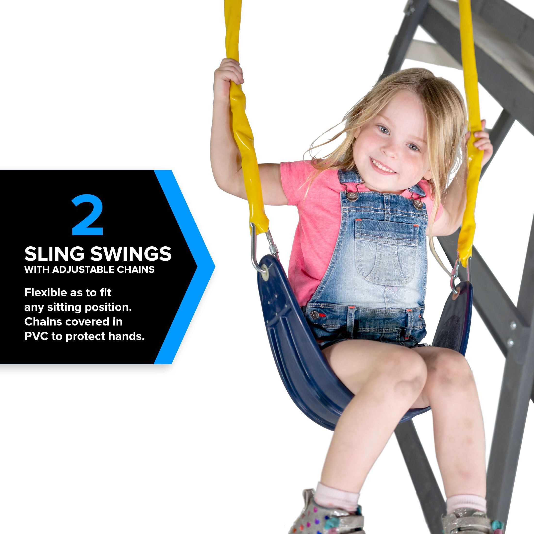 Sturdy wooden construction built with heavier and denser Northern Europe Scandinavian fir for a sturdier and safer design compared to competitor swing sets made from China Cedar wood Our Northern Europe Scandinavian Fir is sourced from sustainable forests Sturdy 8′ blow-molded slide Blow-molded standing swing Rock climbing wall with climbing grips Entrance handles help users safely enter the fort Sand box (sand not included) Meets or exceeds all ASTM standards BONUS: 4-piece anchor kit secures swing set to the ground for extra safety & stability