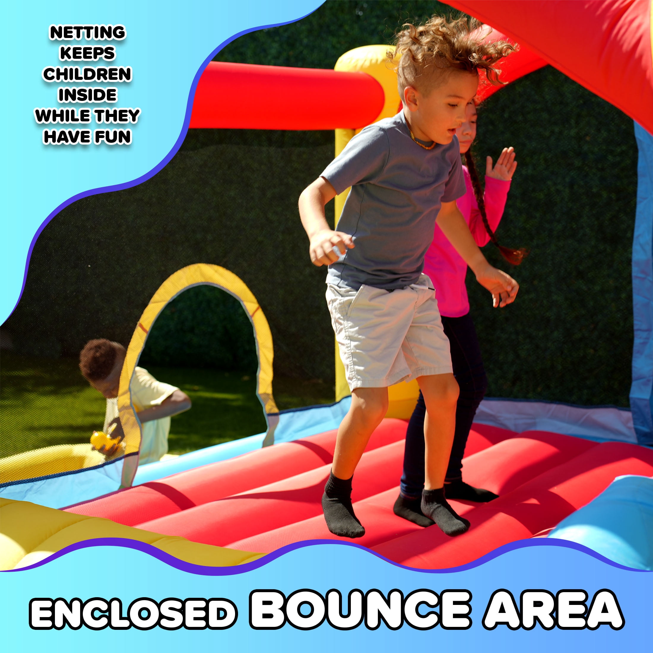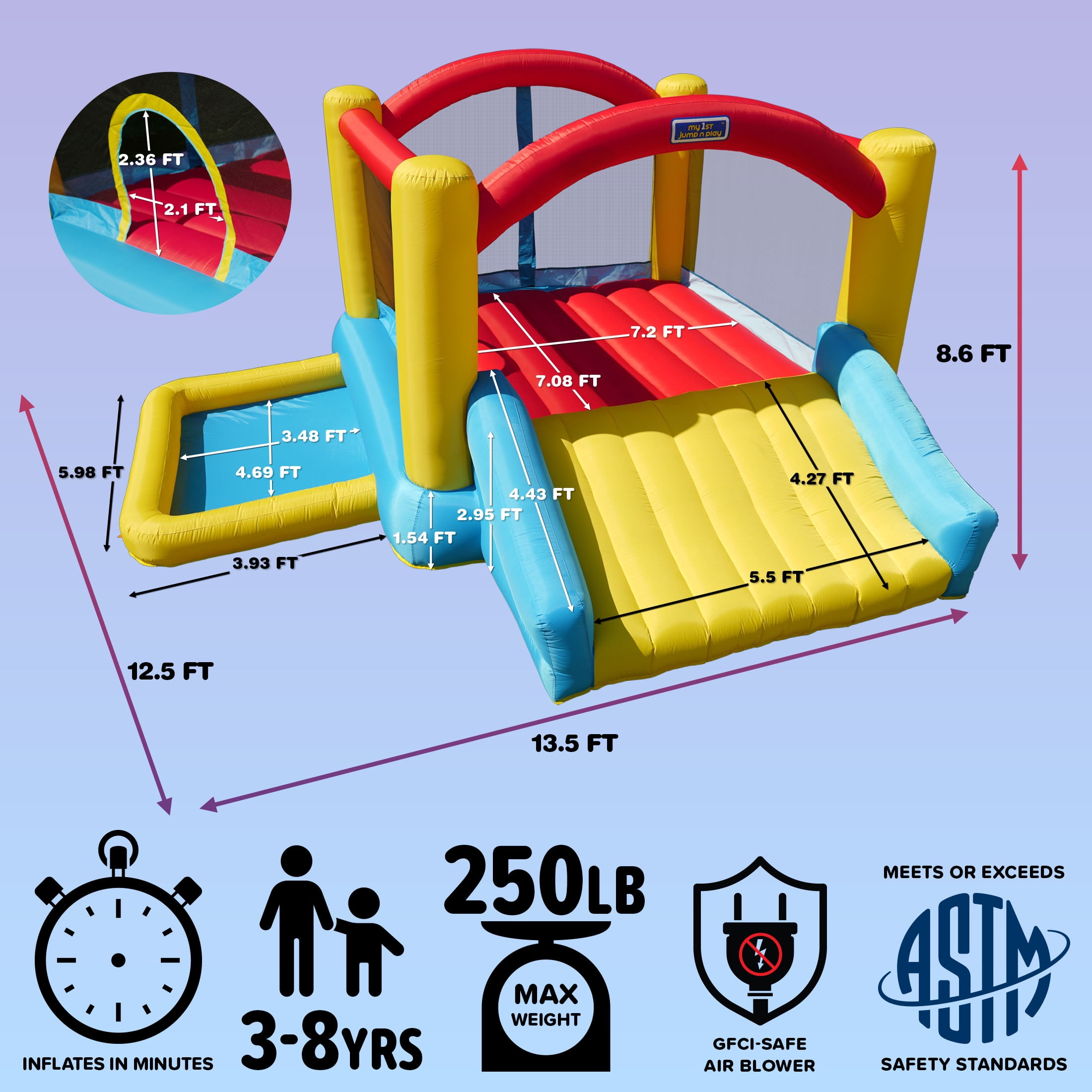 BOUNCE & BALL PIT – Combines classic bouncing fun with an attached ball pit for added play value and excitement SAFE ENTRY SLIDE – Features a large, cushioned slide for safe and stylish entry and exit for kids ages 3–8 BUILT TO LAST – Made of durable polyester with double-stitched seams for reliable use season after season SECURE SETUP – Includes 6 ground anchors to keep the inflatable stable during energetic play INFLATES FAST – Heavy-duty blower sets up the bounce house in just minutes; includes lifetime warranty FULL SET INCLUDED – Comes with blower, stakes, repair kit, and storage bag for easy maintenance and portability