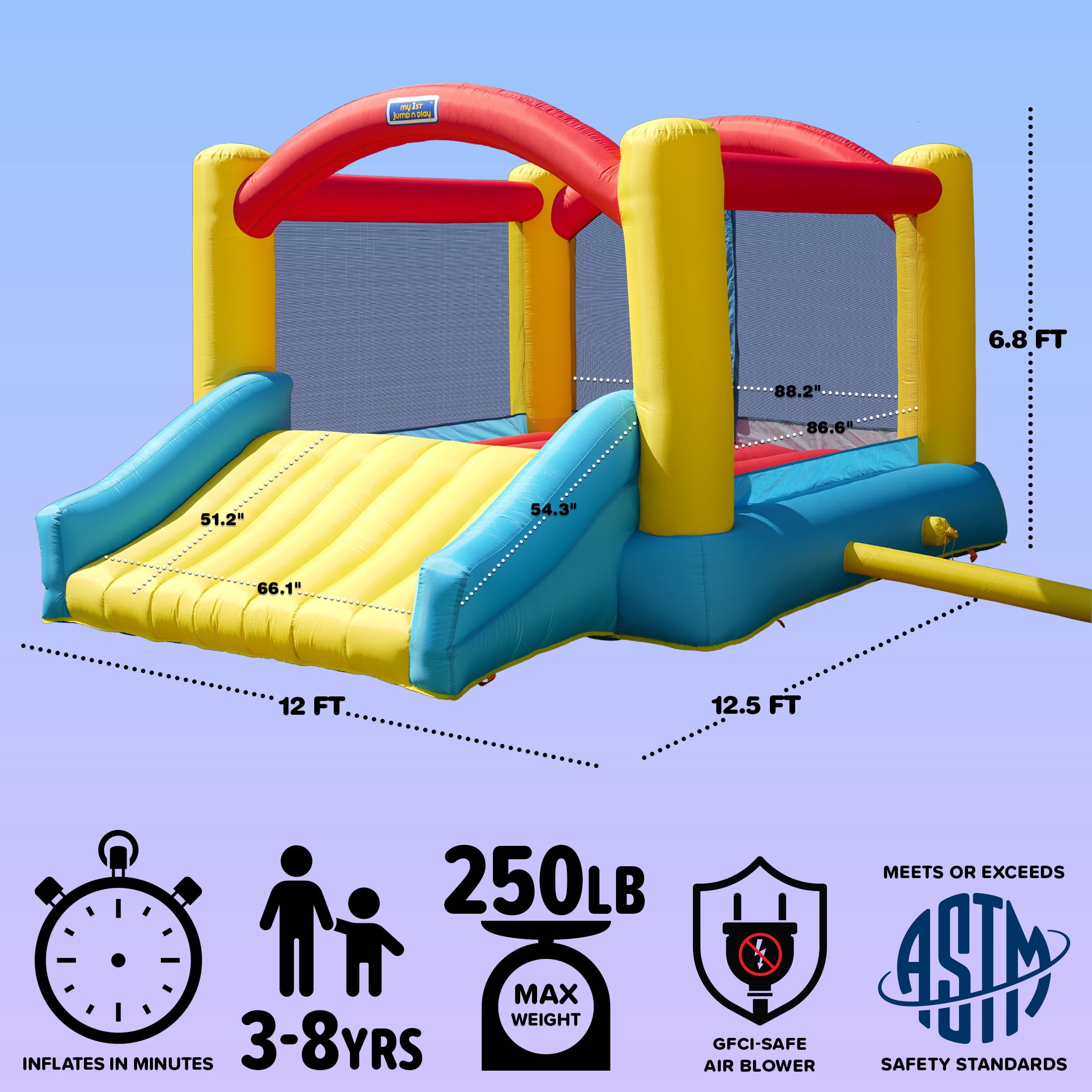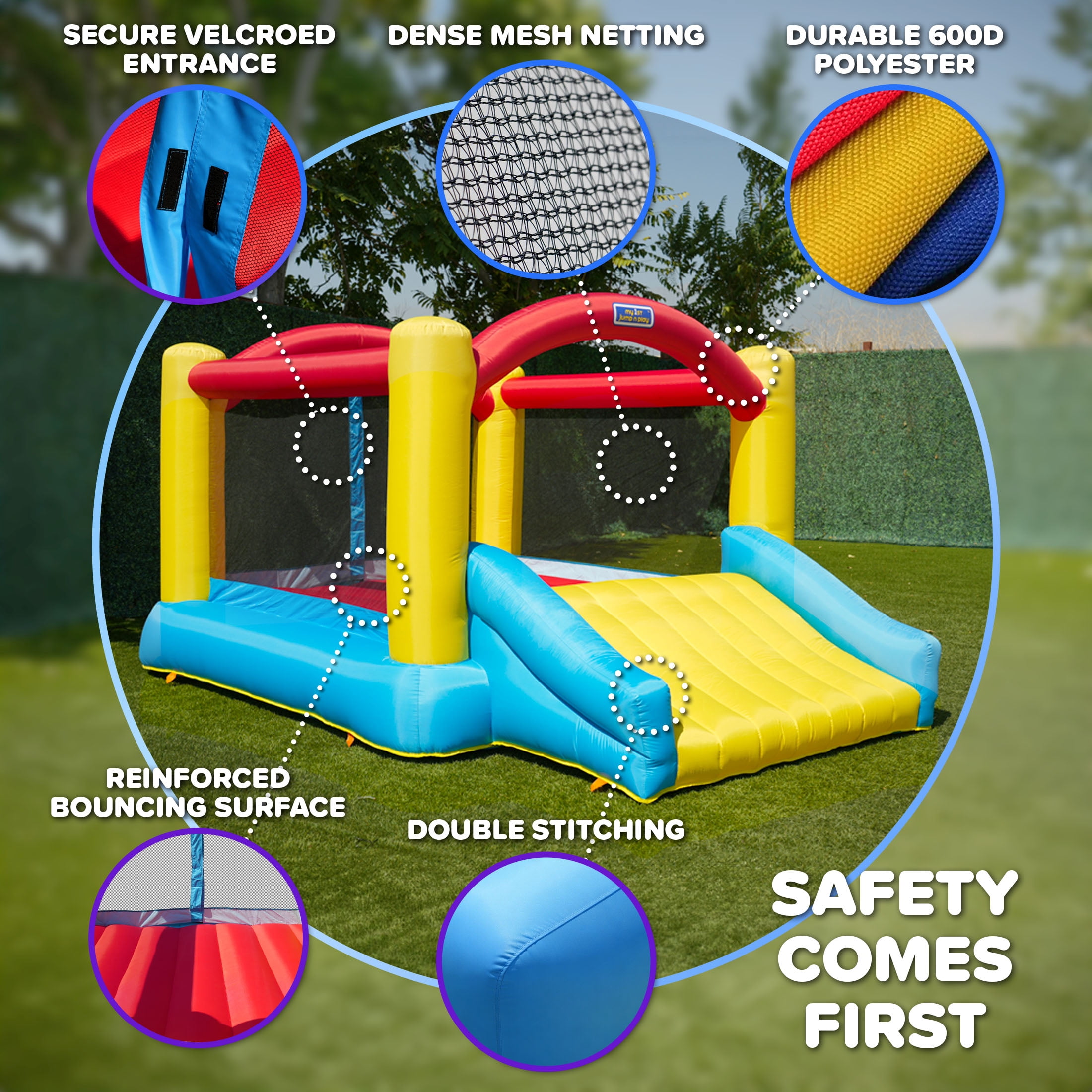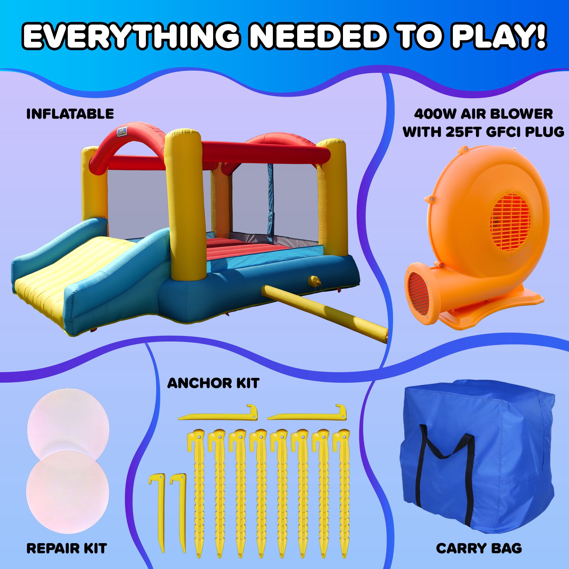 BOUNCING FUN – Kids ages 3–8 will love hours of jumping, laughing, and sliding in this colorful inflatable LARGE ENTRY SLIDE – Cushioned, air-filled slide provides a fun and safe way to get in and out of the bounce area BUILT TO LAST – Made from tough polyester with double-stitched seams for long-lasting backyard use SECURE DESIGN – Includes 6 ground anchors for extra stability and safety during high-energy play QUICK SETUP – Heavy-duty blower inflates the bounce house in minutes and includes a lifetime warranty FULL SET INCLUDED – Comes with blower, stakes, repair kit, and carry bag—perfect for birthdays and outdoor events