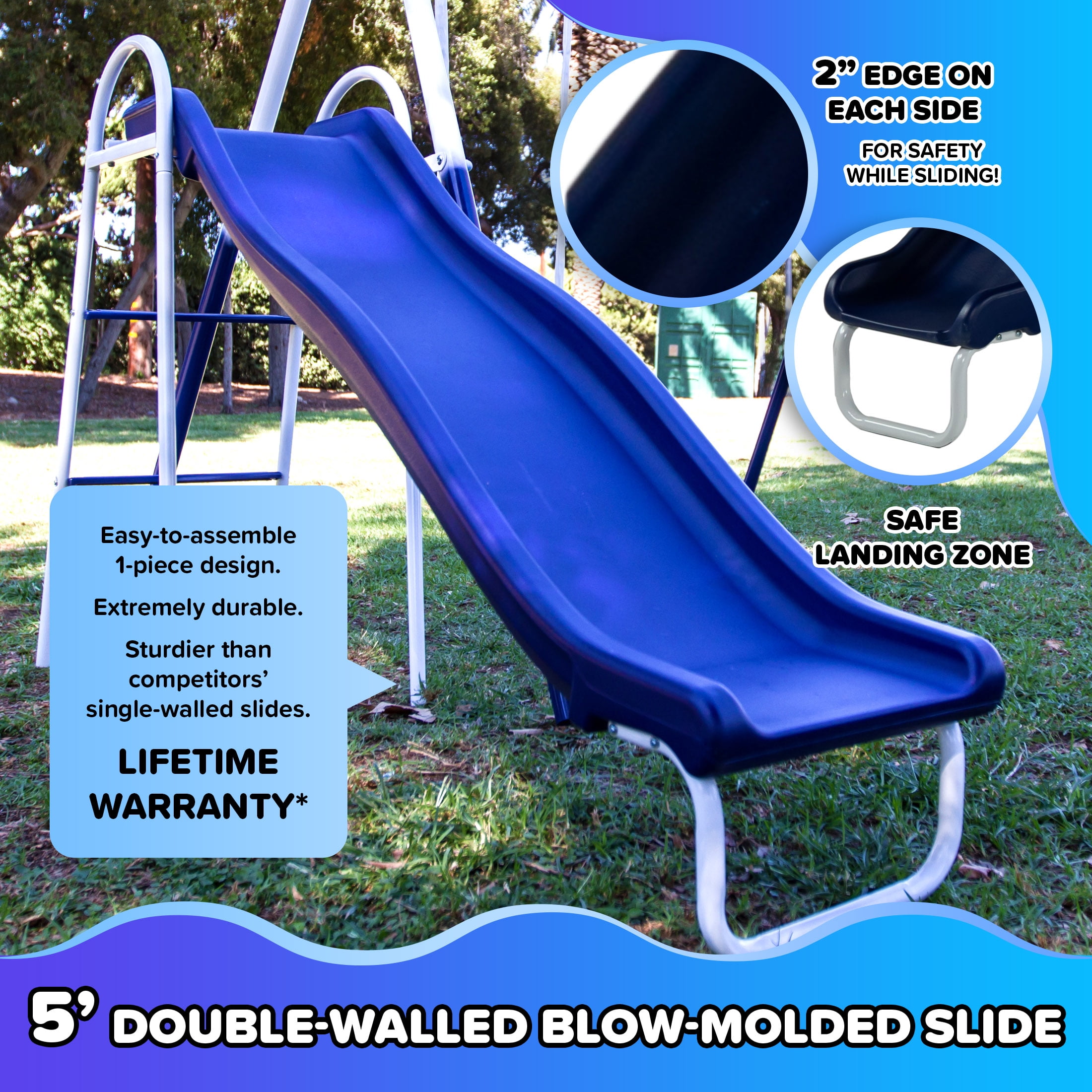 BONUS 4pc anchor kit secures swing set to the ground for extra safety and stability This swing set offers loads of swinging, sliding, and trapeze fun for young children Features a 5-foot slide, 2 swings, and a trapeze Powder-coated paint finish lets the playset stand up to sour weather Maximum weight limit of 100 pounds per user with a maximum of 4 users; total maximum weight capacity of 400 pounds Best for kids 3 to 8 years old Assembly required Color: Blue and green