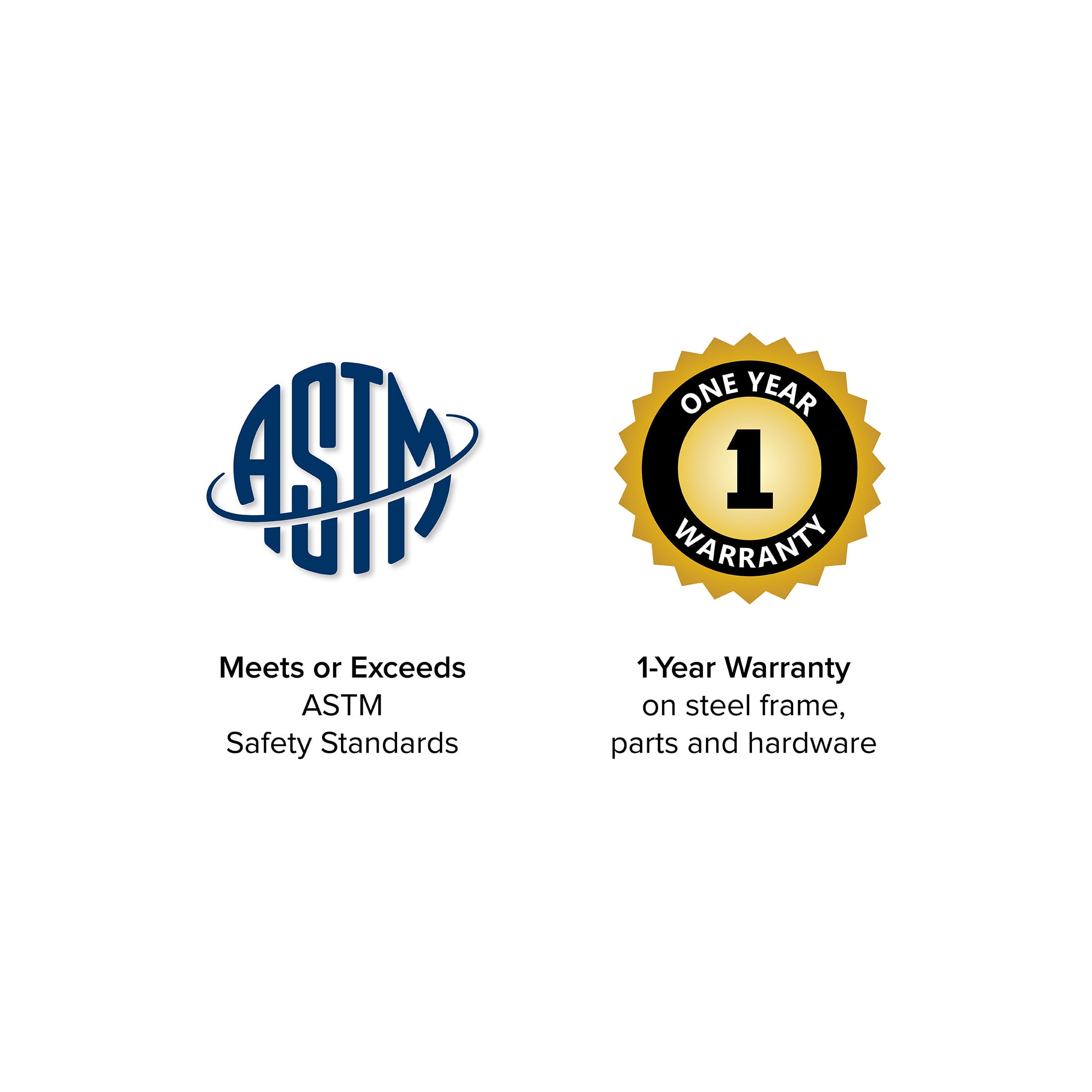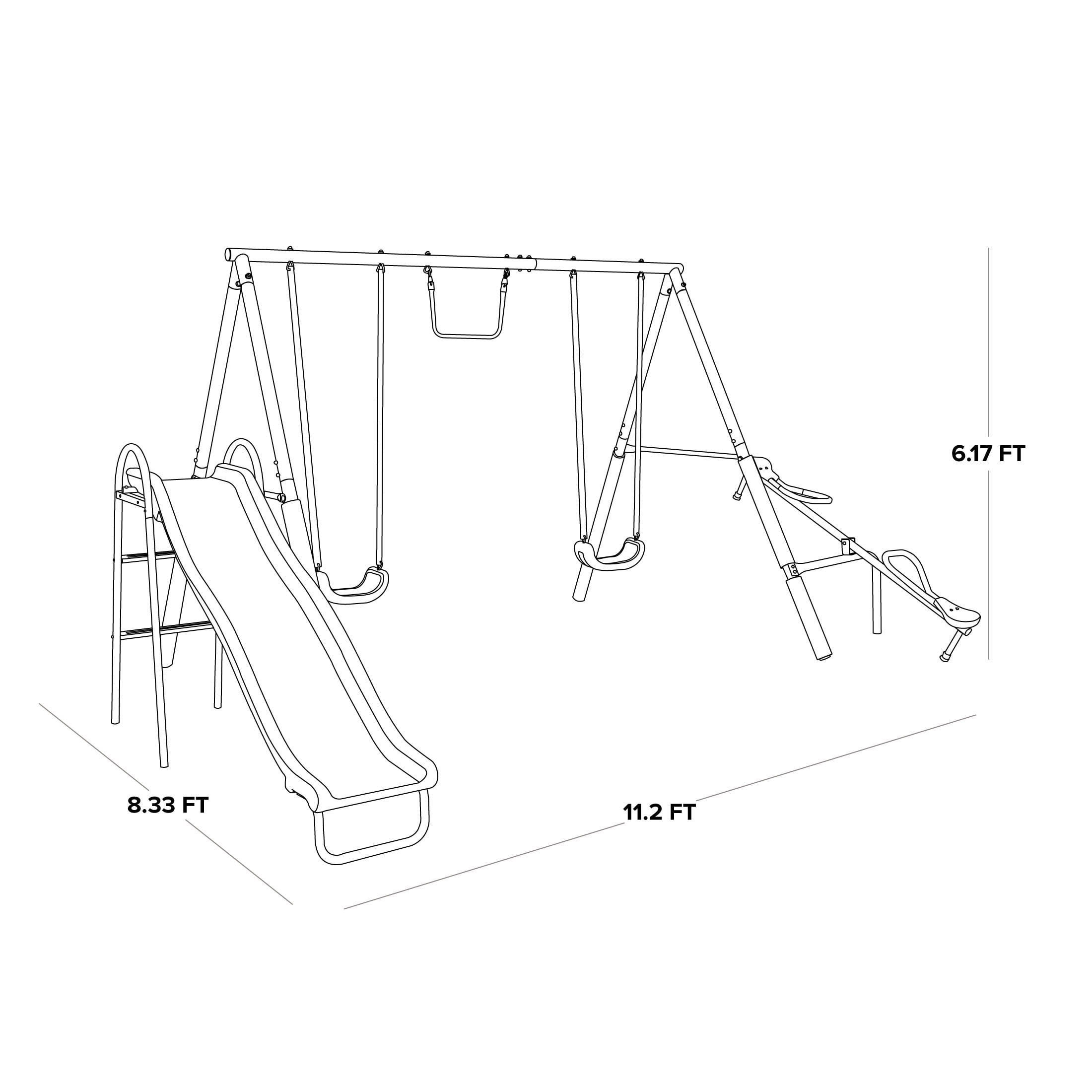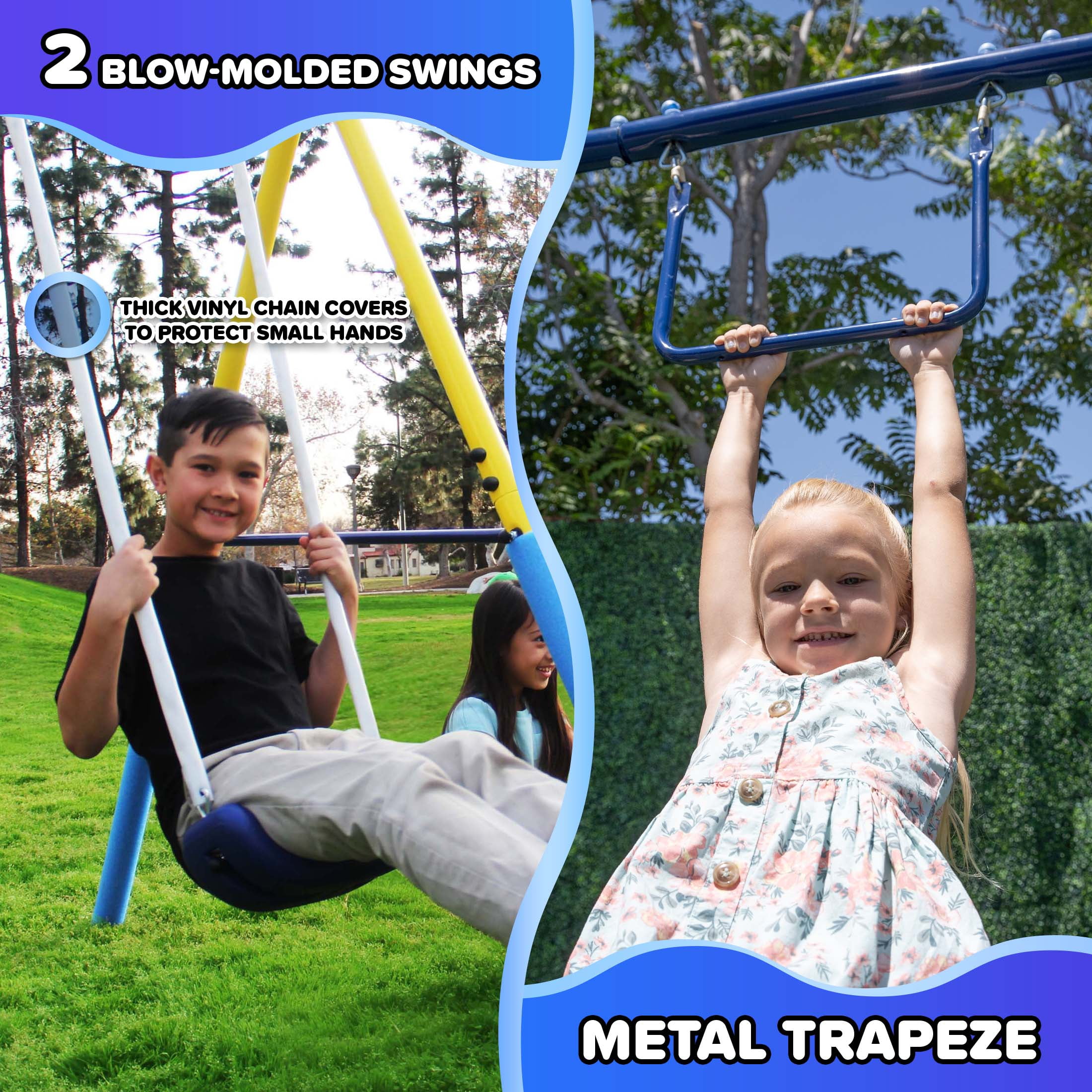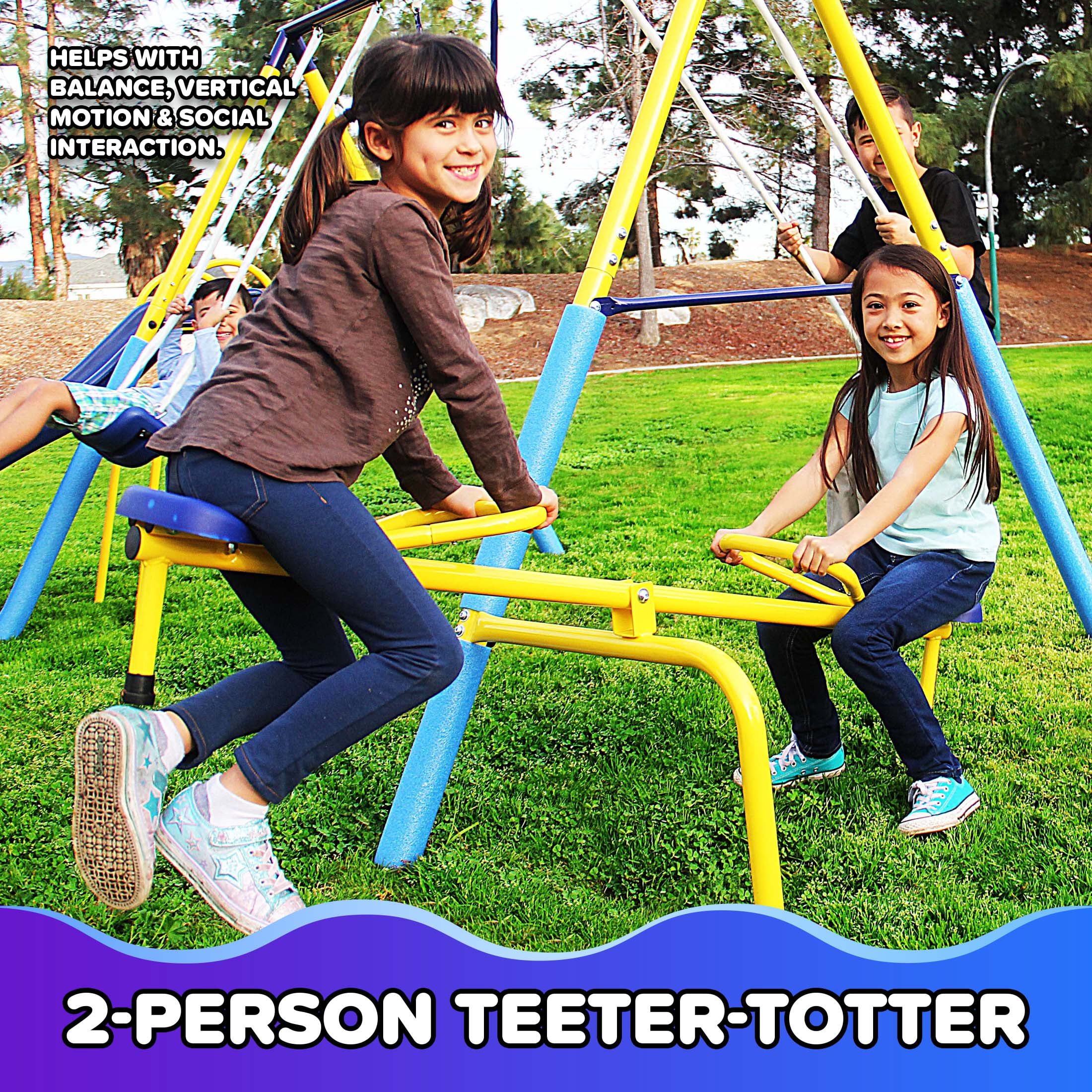 Crafted with heavy-duty 2-inch powder-coated steel tubes for more durability Two blow molded swing seats with safe vinyl chain covers to protect hands Large and durable 6-foot (72 inches) blow-molded slide Metal trapeze bar for acrobatic fun Teeter totter with molded plastic seats and sturdy grip handles As many as 6 kids (maximum 100 lbs each) can have fun together Meets or exceeds all ASTM safety standards 4-piece anchor kit secures swing set to the ground for extra safety & stability