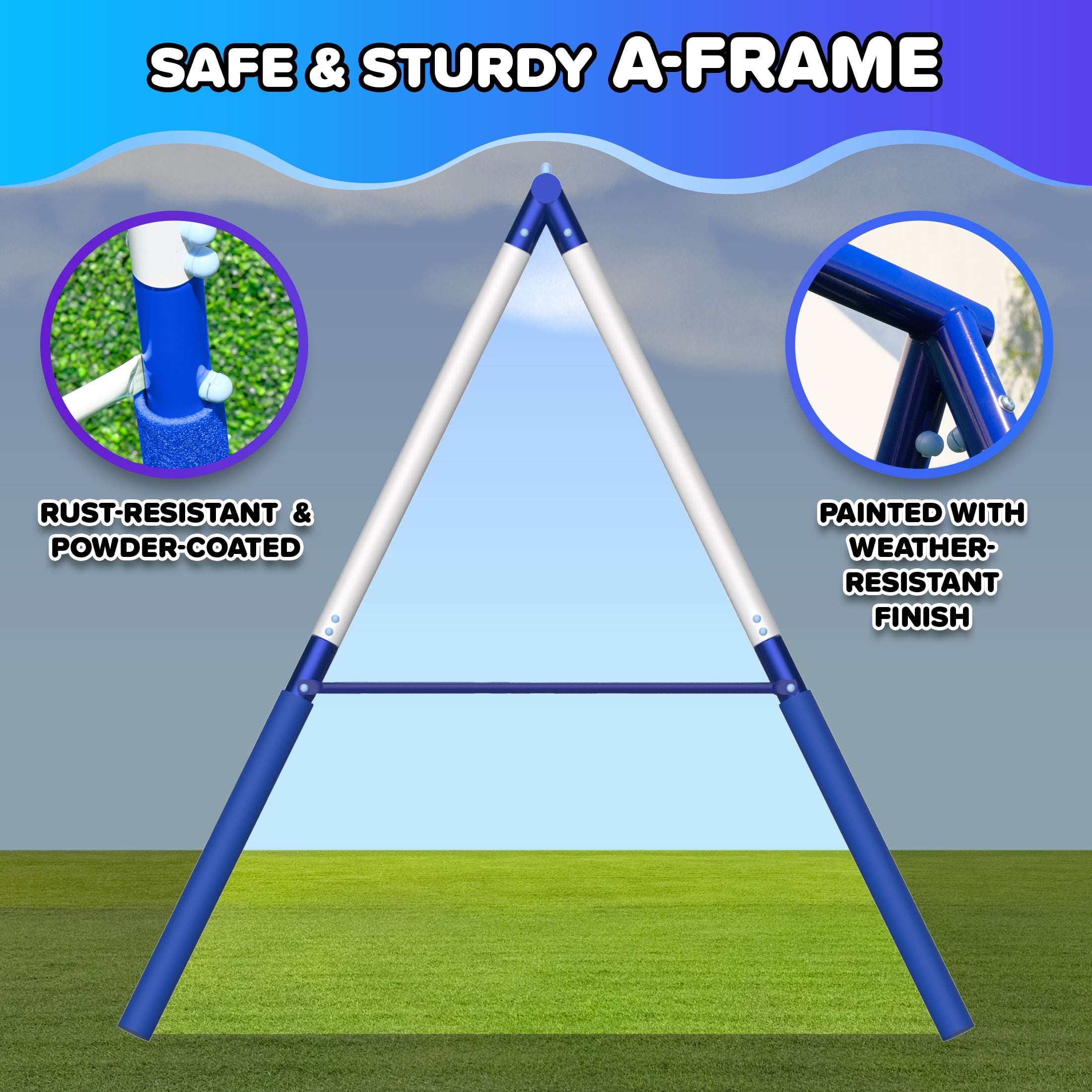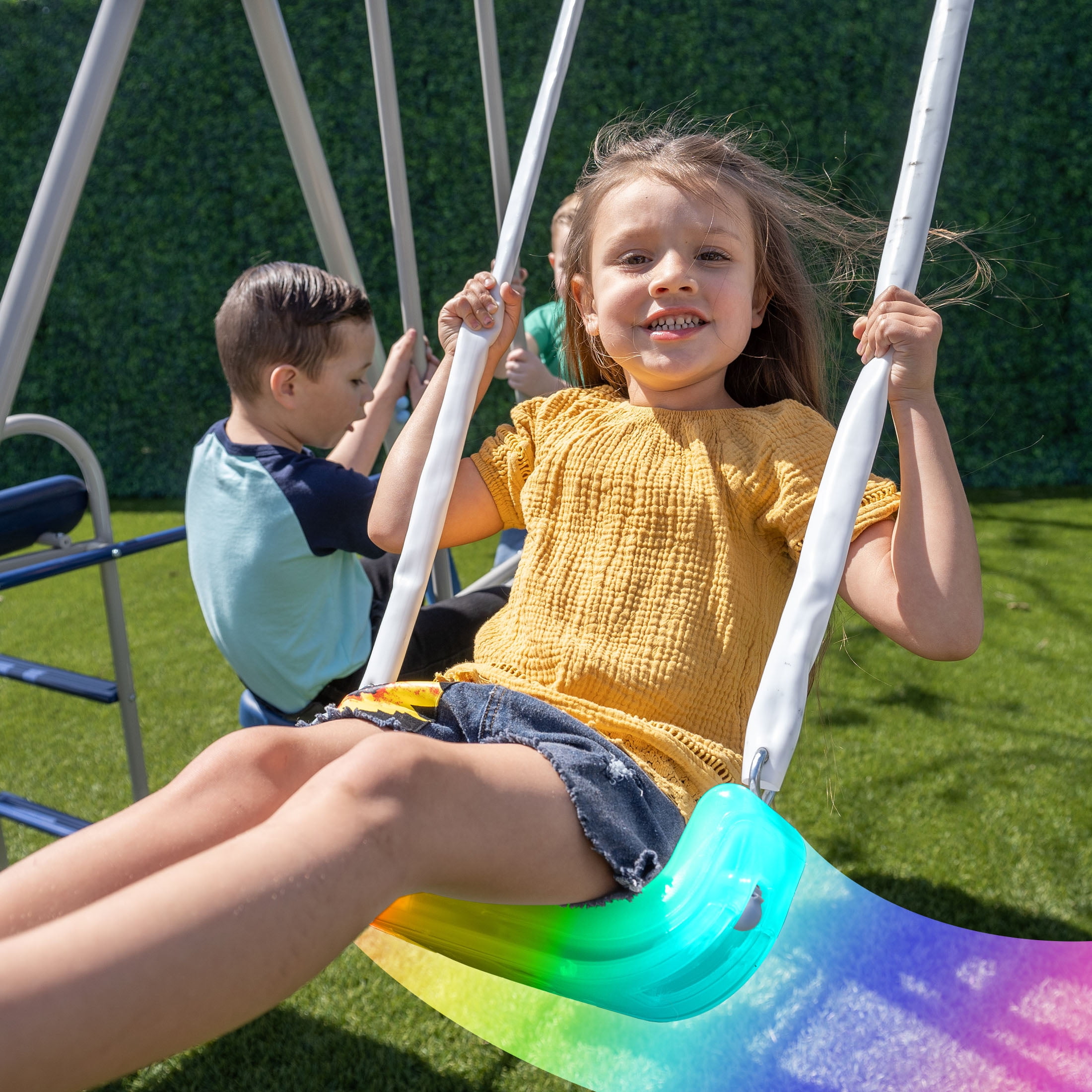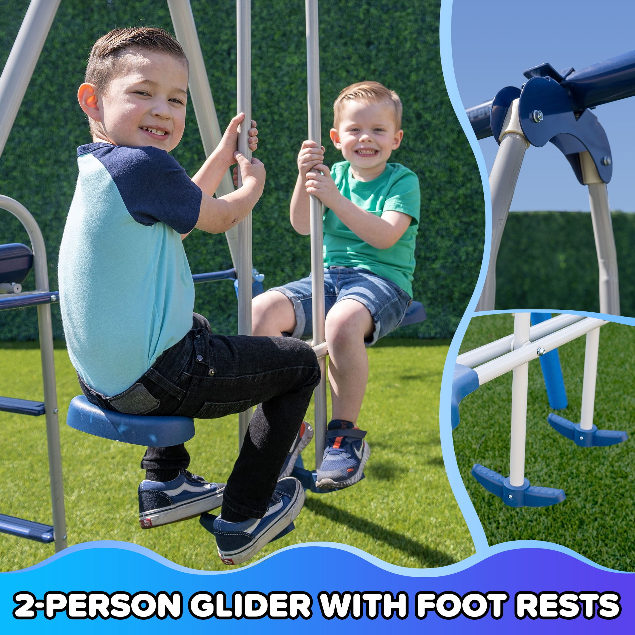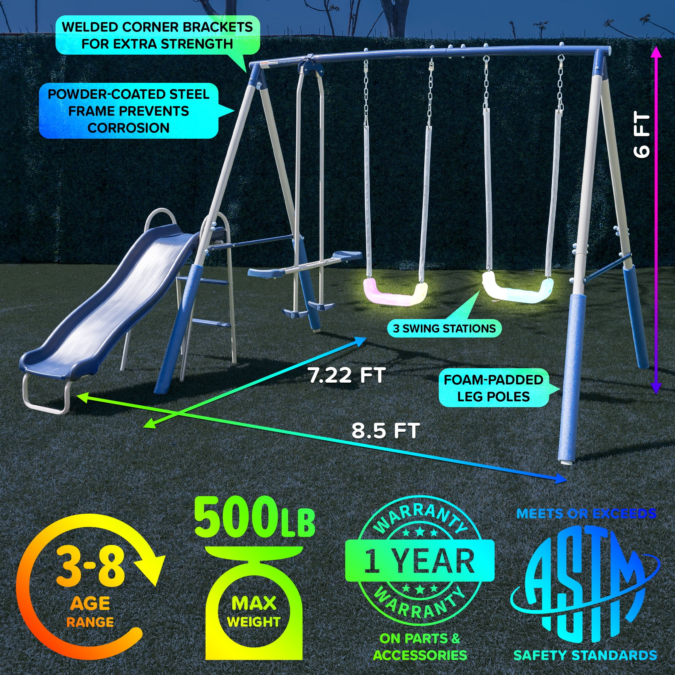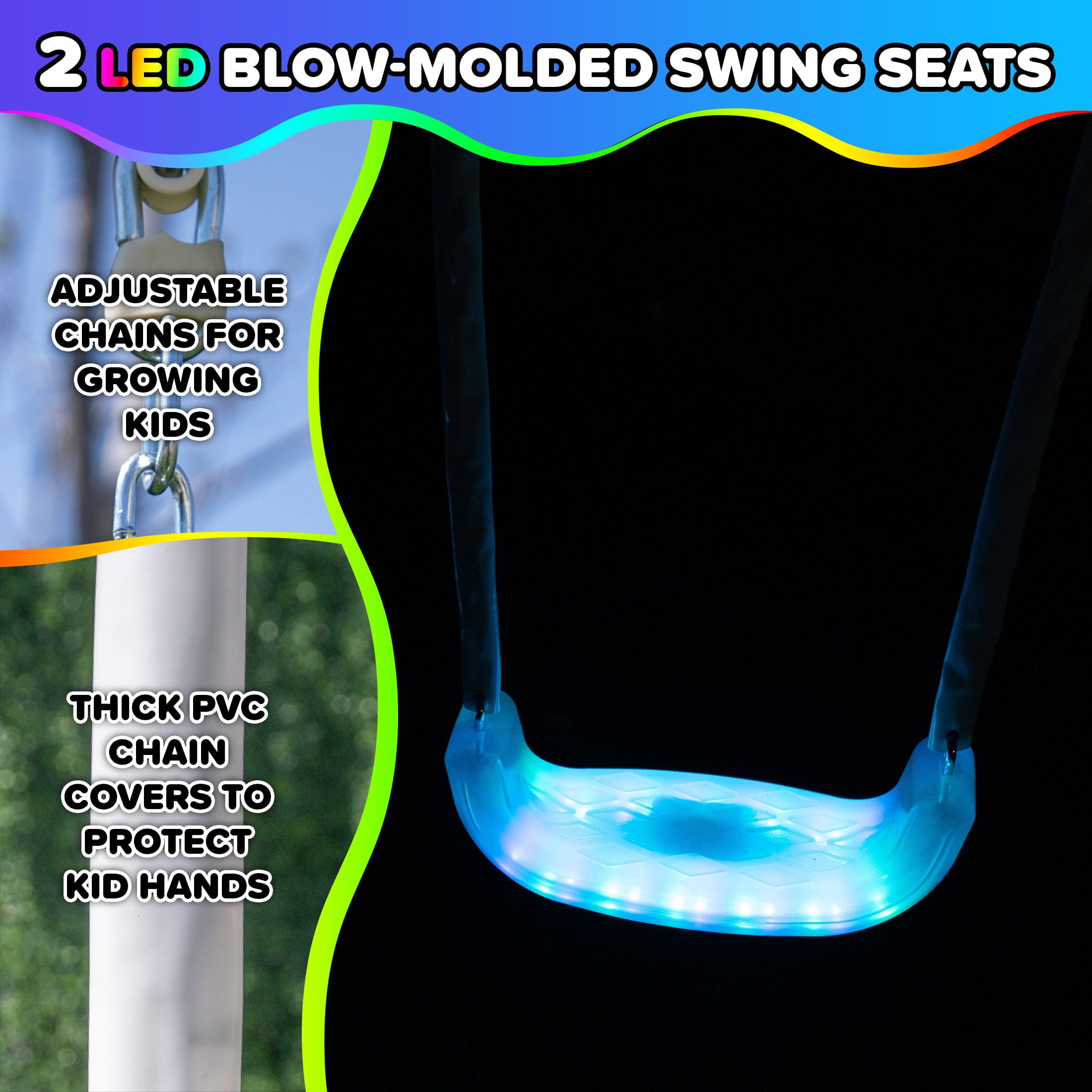 2 LED double-walled blow-molded swing seats LED swings require 3 AA batteries (batteries not included) 2-person glide ride with footrests for extra stability 5ft. large and durable one-piece blow-molded wavy slide for easy assembly Adjustable swings chains to accommodate growing heights Chains are covered with vinyl to protect children’s hands Frame legs are foam-padded for extra safety As many as 5 kids (maximum 100 lbs each) can have fun together Meets or exceeds all ASTM safety standards 4-piece anchor kit secures swing set to the ground for extra safety & stability
