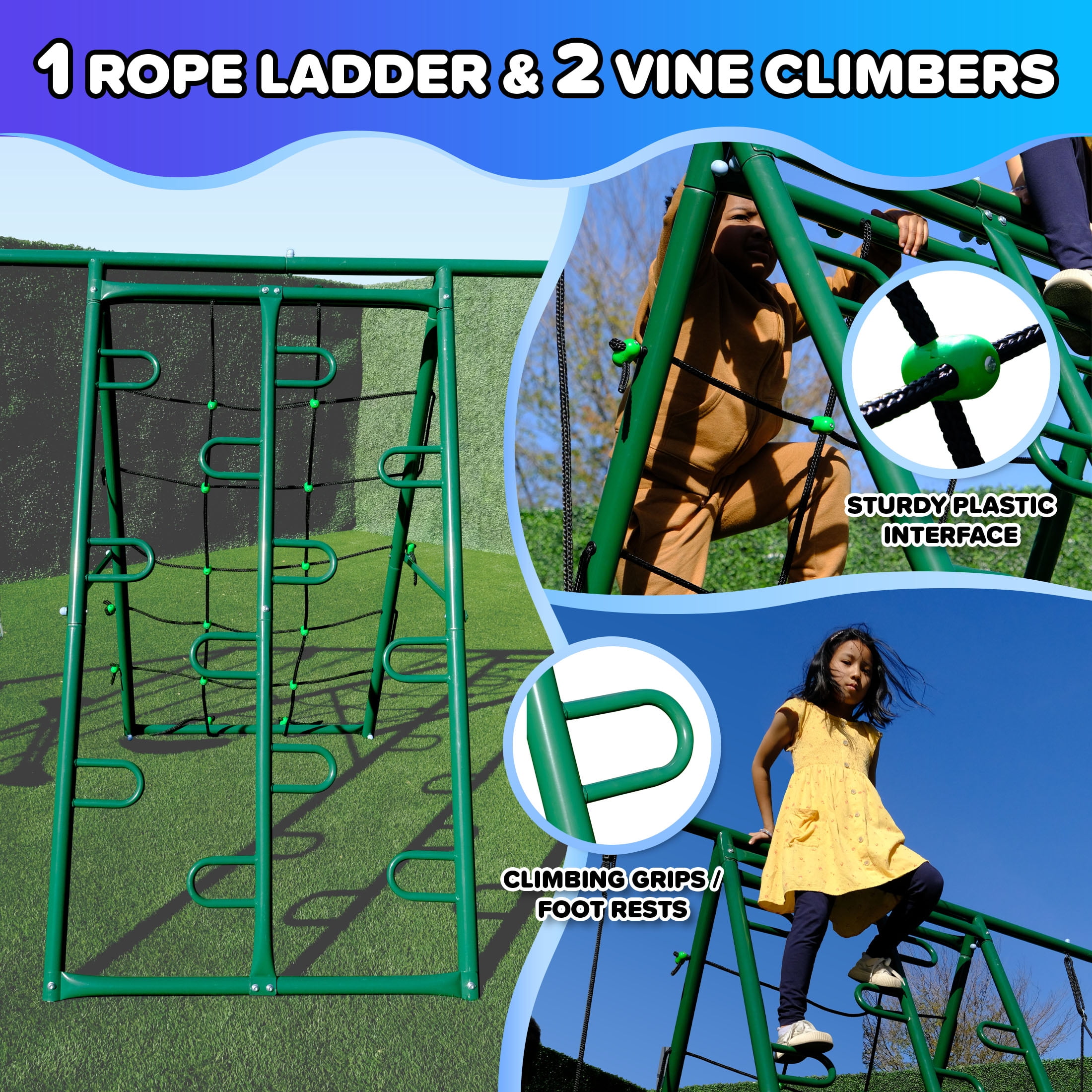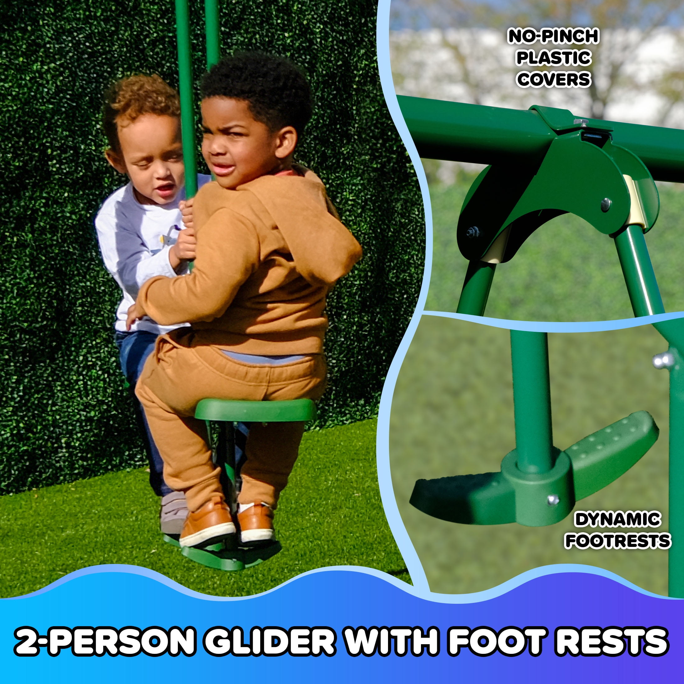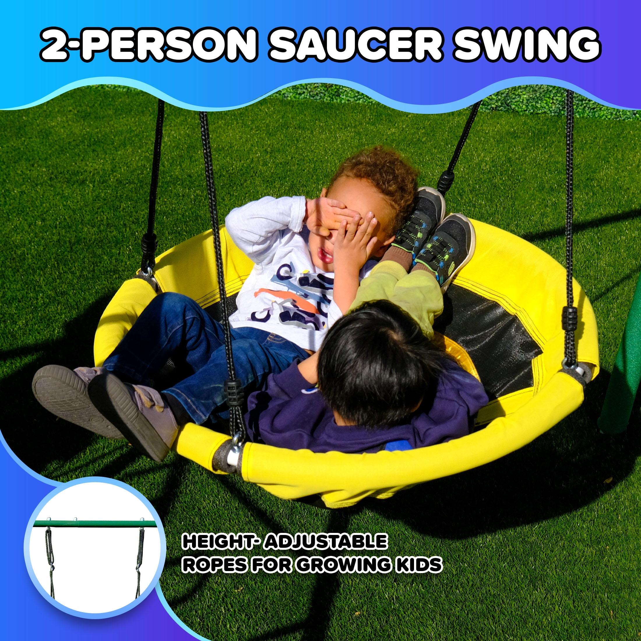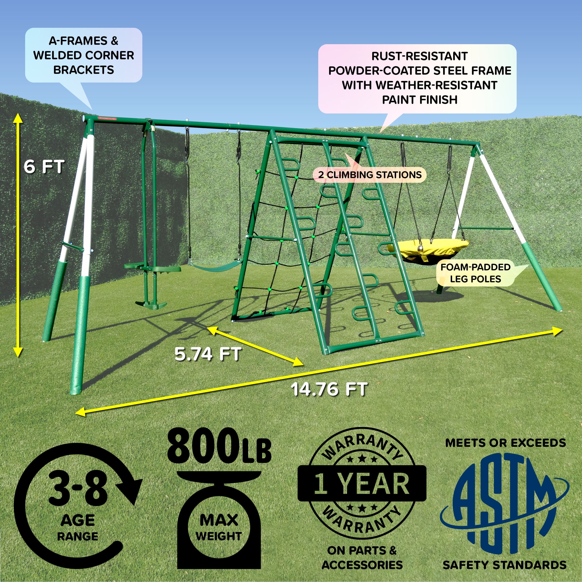 Crafted with heavy-duty weather-resistant 2″ powder-coated steel tubes for durability Sling swing with adjustable rope chains 32″ flying saucer swing with reinforced inner webbing, safely holds up to 2 kids 2-person glider swing with footrests Climbing net 2 side-by-side sets of climbing steps Meets or exceeds all ASTM safety standards Up to 8 kids an play on it at once, max weight 100 lbs. each