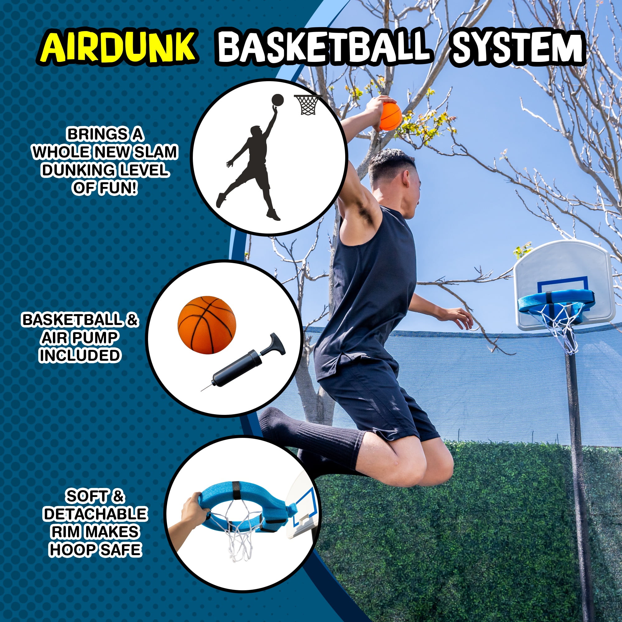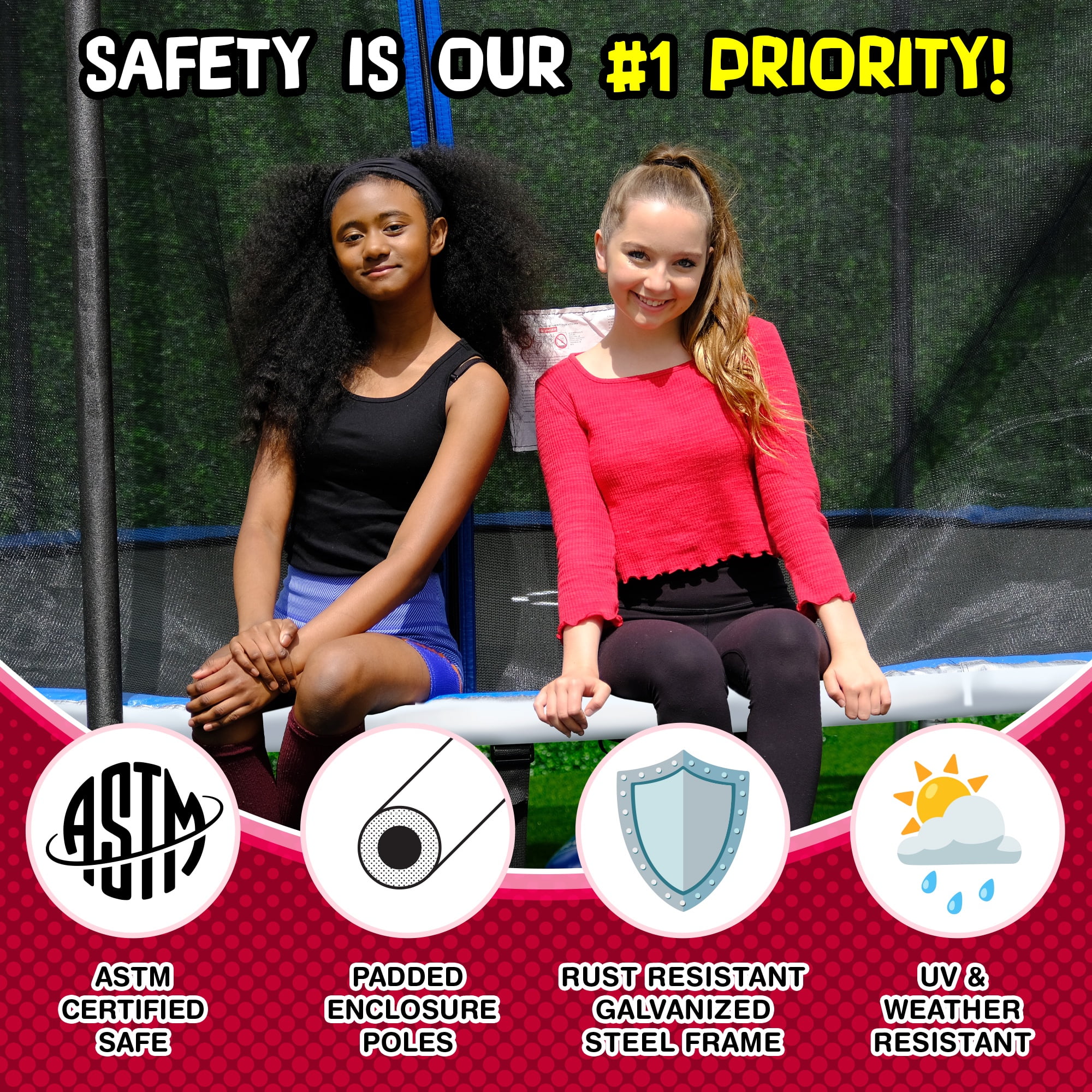 Rust-resistant galvanized steel frame Trampoline park quality jump mat withstands over 5000 hours of UV testing UV-resistant polyethylene enclosure netting to prevent falling out Foam padded spring cover to prevent impact, contact and entanglement Patented double welded plates leg weld to reinforce joints and prevent bending/breaking Steel “W-leg” design for stability DunkZone basketball system Water anchors to secure trampoline in place Disclaimer: Only one user at a time. Adult supervision required at all times.