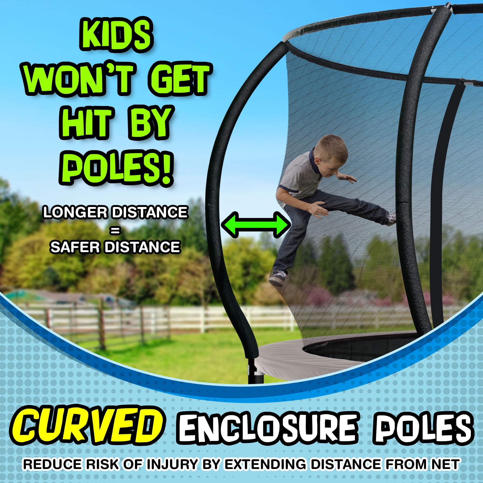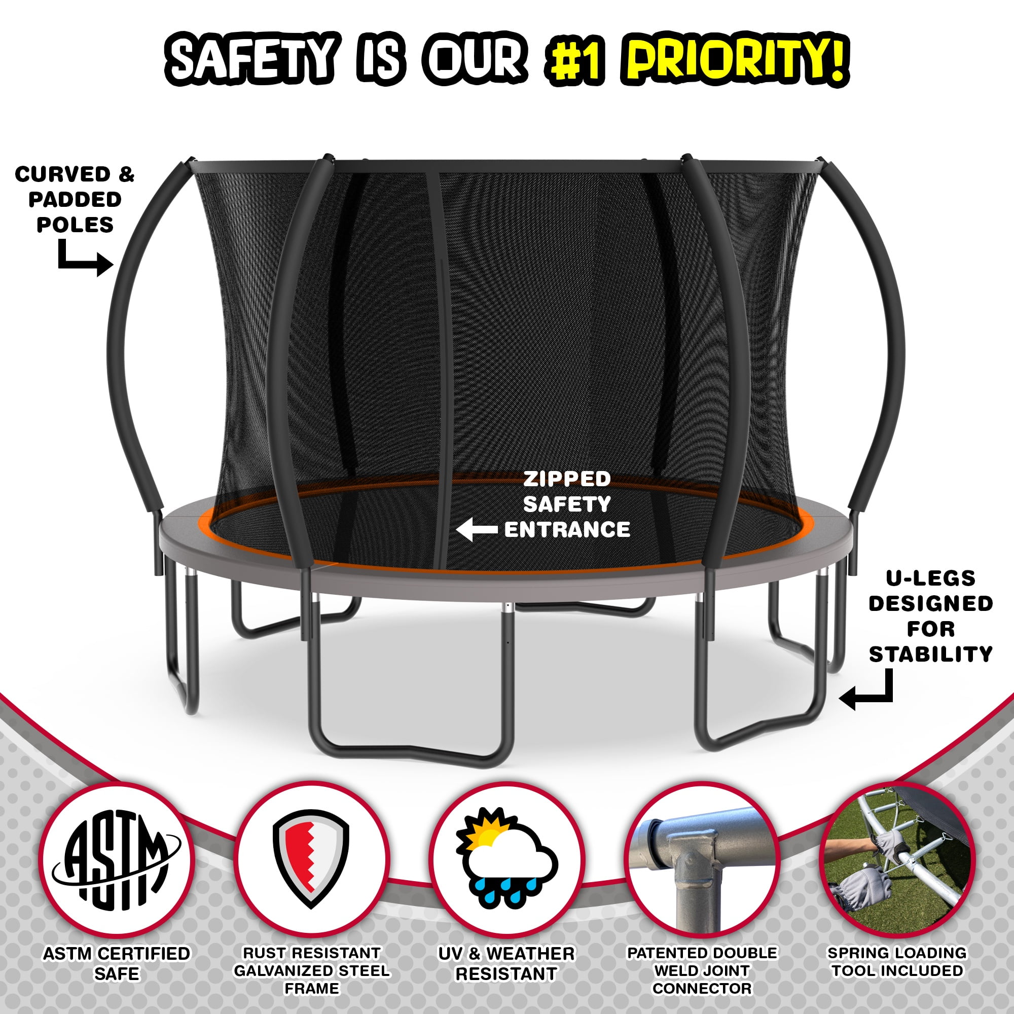 Galvanized steel frame with powder-coated legs helps prevent rust from forming, providing long quality use UV-resistant trampoline park quality jump mat and polyethylene enclosure netting withstand over 5000 hours of UV testing Foam-padded spring cover prevents impact, contact, and entanglement Patented double-welded plate design reinforces joints for additional support W-leg design for extra stability Enclosure ring and curved poles add tension and prevent net from sagging Meets or exceeds ASTM standards RECOGNIZED QUALITY: