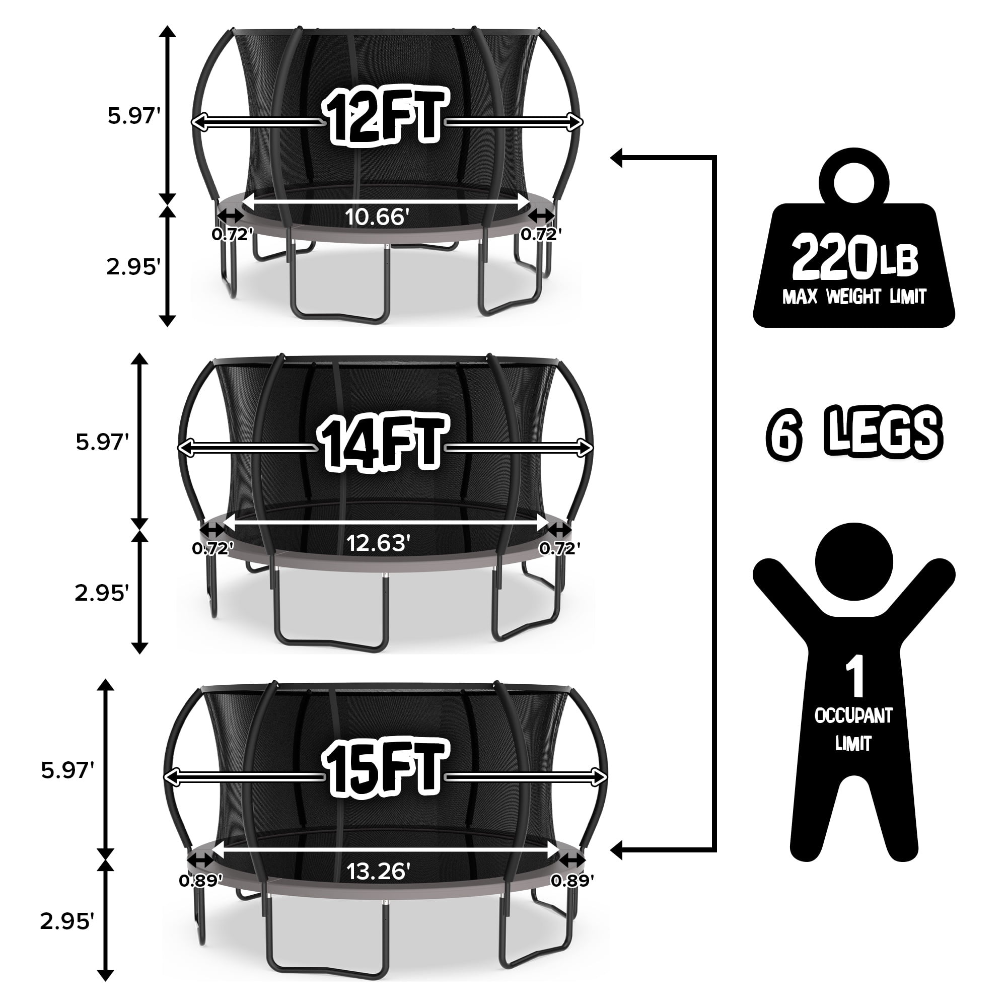 TruJump designed a trampoline that your whole family will love and enjoy! This all-new 12-foot trampoline and enclosure combo is perfect for a decent-sized backyard. TruJump prioritizes safety and encourages kids to go out and exercise more! Protected by a classic 6-pole enclosure, kids can soar to new heights of backyard fun while staying safe inside the trampoline. This trampoline features a 220 lb. weight capacity and an ultra-durable, UV-resistant jump mat built to trampoline park quality standards. The thick-walled, double-galvanized steel frame ensures long-lasting performance. This 12-foot trampoline can handle any exercise routine in your backyard.