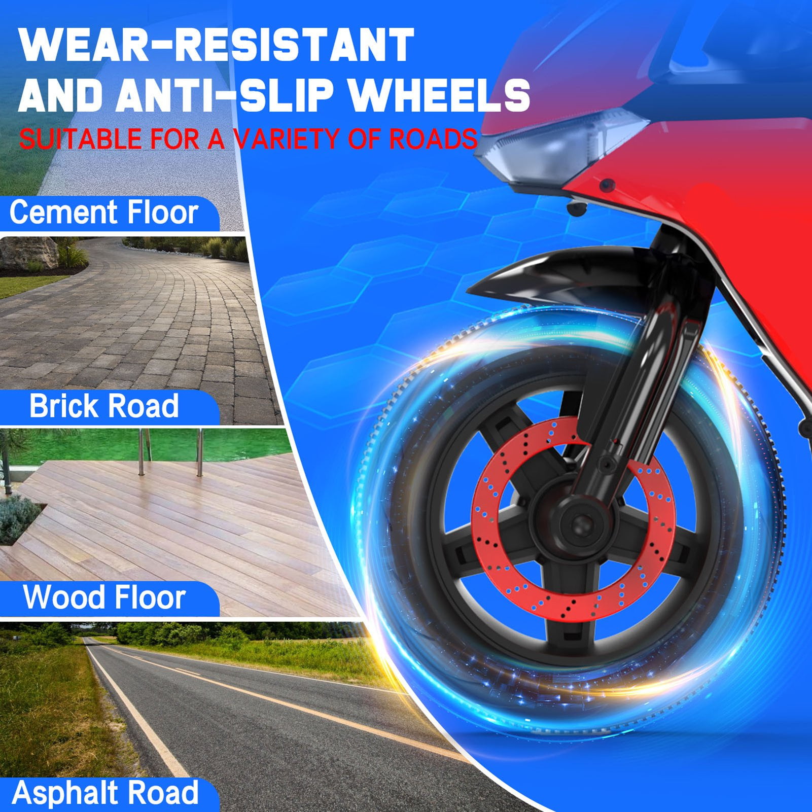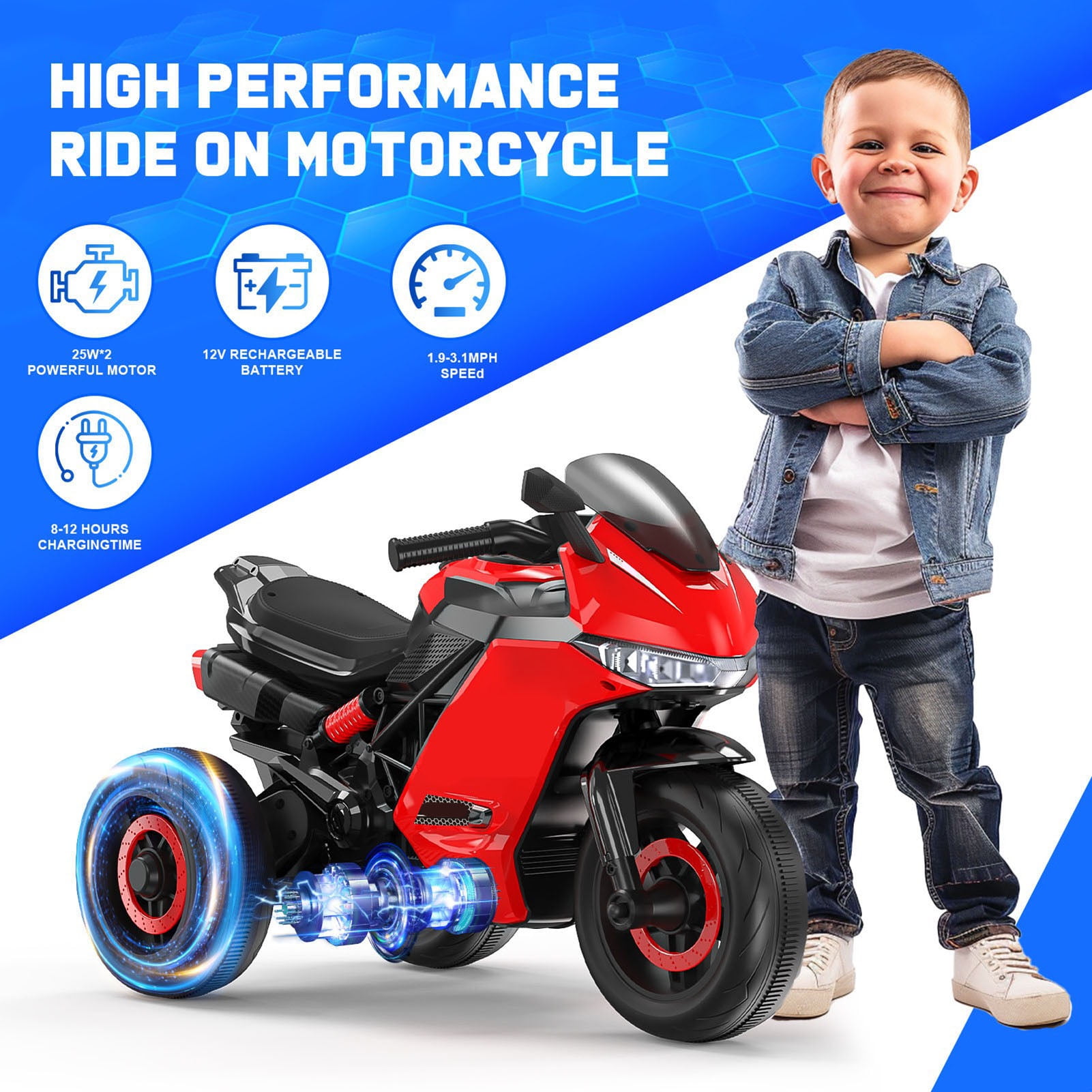 SPPTTY Electric Motorcycle with 3 Wheels not only adds fun to children’s childhood but also develops their hand-eye coordination and motor skills, and builds self-confidence and courage in joy and laughter, which is conducive to children’s growth.Children’s Ride-on motorcycle toy is also the best gift for children on birthdays, Thanksgiving, Christmas, New Year, Children’s Day, and other holidays. This 12V battery powered motorcycle is made of high quality and durable PP material, elevated seat cushion, and safe speed to ensure the safety and stability of children’s riding. The three-wheel design makes the kid’s motorcycle easy to maneuver and balance perfect for children 3-6 years. Easy to maneuver and control, the ride-on motorcycle gives children a sense of motion control and helps them learn to drive the vehicle with features like a forward/reverse switch, high/low-speed options, and an intuitive accelerator pedal.A bright headlight illuminates the road ahead, and the sleek simulated exhaust adds a touch of cool. But that’s not all – built-in music, nursery rhymes, horn sounds, and an MP3 player for endless fun and surprises as you listen to music or learn while riding. The powered ride-on motorcycle is great for outdoor and indoor play, 12V battery Enjoy longer rides. Specifications: Color: White / Blue / Red Recommended Age: 3-6 years Material: PP and metal Battery Type: 12Volt 4.5AH Motor Type: 25W *2 Maximum User Weight: 66 Lbs Net Weight: 15.5 Lbs Speed: 1.9 – 3.1 MPH Charging Time: 8-12 hr. Music Function: USB Port/ Built-in music Overall Size: 32.5″ x 16.5″ x 21.5″ (L x W x H)