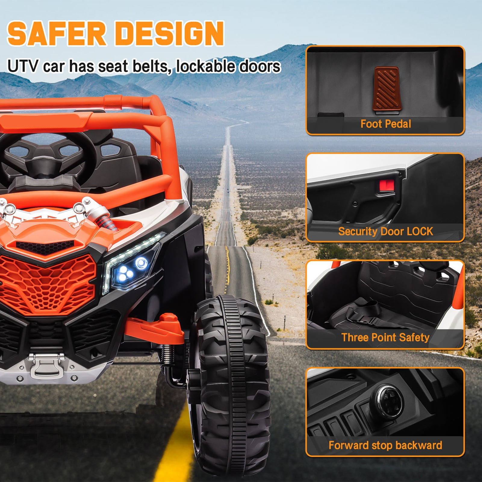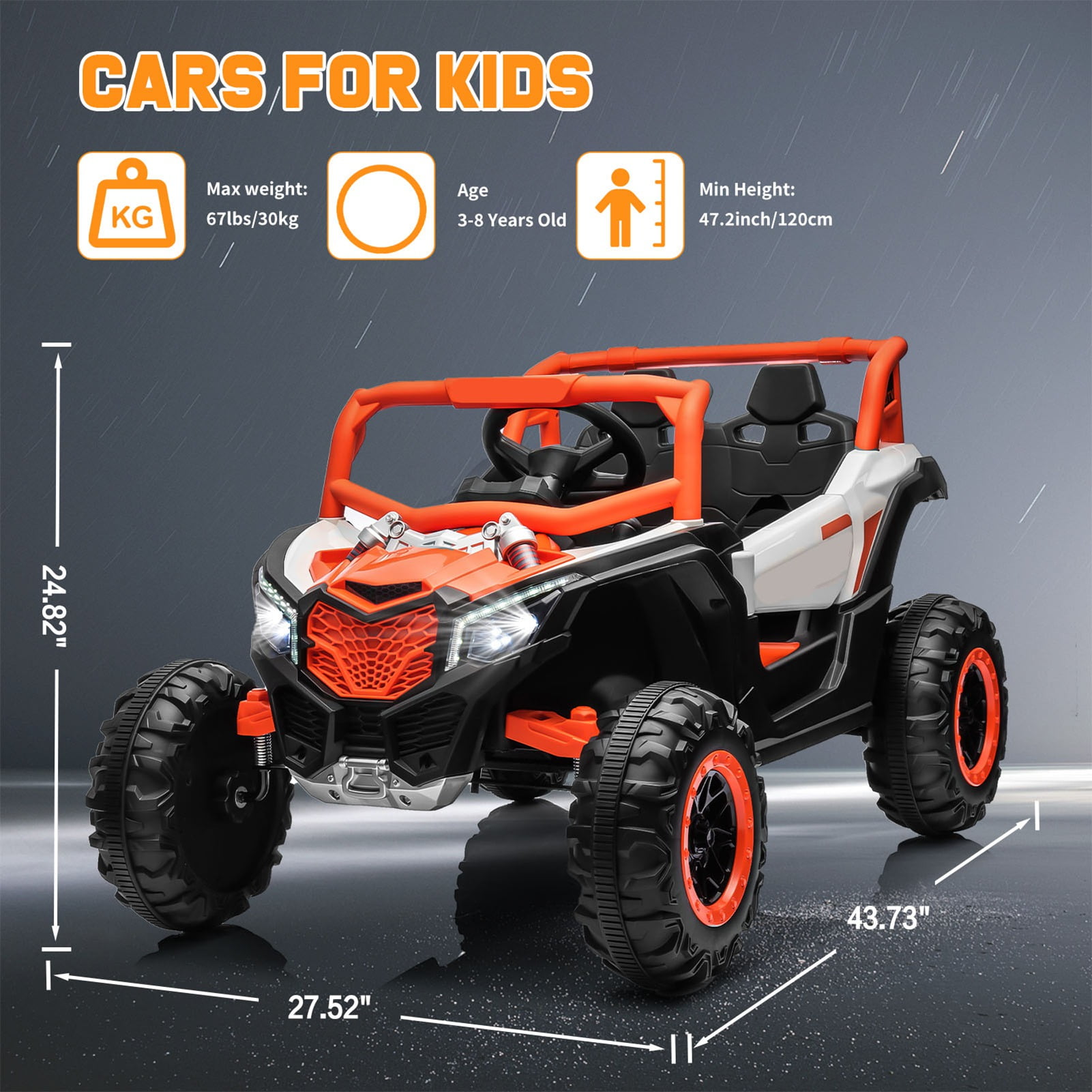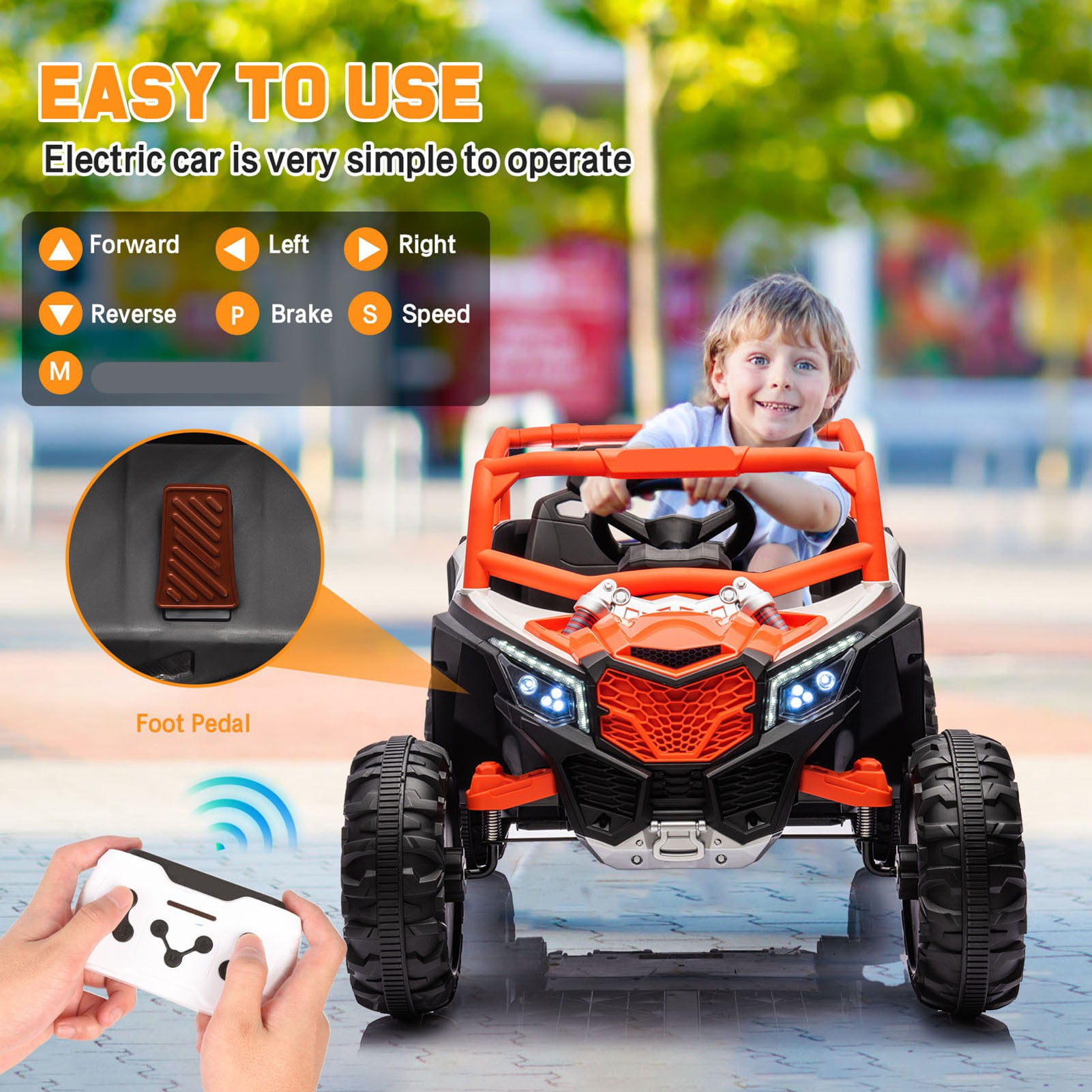 NEW RELEASE 12V Ride On Toys Car NEW RELEASE 12V Electric Go Kart SPPTTY 24V Ride On UTV: A Joyful Adventure for Every Child Empower Your Child with Endless Fun and Learning:SPPTTY’s 24V ride ons are designed to be more than just toys; they are companions that grow with your child, fostering independence, visual thinking, and spatial intelligence. Whether indoors or outdoors, these kids ride on vehicles provide endless joy and adventure. Children can enjoy a realistic driving experience with authentic pedals and a steering wheel, making every playtime an exciting journey. Tailor-Made for Young Explorers:This UTV electric car is specifically designed for children aged 3-8, making it perfect for both boys and girls. The 24V kid car is available in both 2WD and 4WD driving modes, ensuring versatility and adaptability to different terrains. Equipped with USB, AUX, and Bluetooth music options, this ride on toy allows your child to enjoy their favorite tunes while they drive. Advanced Features for Maximum Enjoyment: Powerful Performance: With 2 * 390W motors, the UTV provides robust and reliable performance. Comfortable Ride: Spring shock absorbers and oversized tires ensure a smooth and comfortable ride. Entertainment On-the-Go: An MP3 player and built-in speakers let your child listen to music, enhancing the overall experience. Extended Playtime: The battery offers up to 2-3 hours of continuous fun, keeping the adventures going longer. Safety and Parental Control: Remote Control: Parents can control the direction of the vehicle using a remote, adding an extra layer of safety and allowing for parent-child interaction. Secure Seating: A built-in 3-point harness and locking doors keep your child secure. Realistic Features: Functional lights and a horn add to the realism and excitement, while also serving as safety features. Speed Control: The UTV is designed to operate at safe speeds of up to 3 mph, ensuring a fun yet controlled driving experience. A Gift That Keeps on Giving:The SPPTTY 24V Ride On UTV is not just a toy; it’s an investment in your child’s development and happiness. It’s the perfect gift for birthdays, holidays, or any special occasion. Watch your child’s face light up as they embark on countless adventures, creating memories that will last a lifetime. Specifications: Item Name: Ride on Car Color Option: Black/Orange/Pink/Red Battery Type: 24V10A Number of Motors: Two Motors Charge Time:8-12 Hrs Run Time:2-3 Hrs Charger: UL (24V/800MA) Speed:1.86-3 Mph Car weight: 44 lb Maximum User Weight:100 lb RC Mode: 3 Speeds Manual Mode: 2 Speeds Accessible Overall Dimensions: (43.73 x 27.52 x 24.82)”(L x W x H) Package Includes: 1x Charger 1x Ride on Car 1x Remote Control 1x Manual