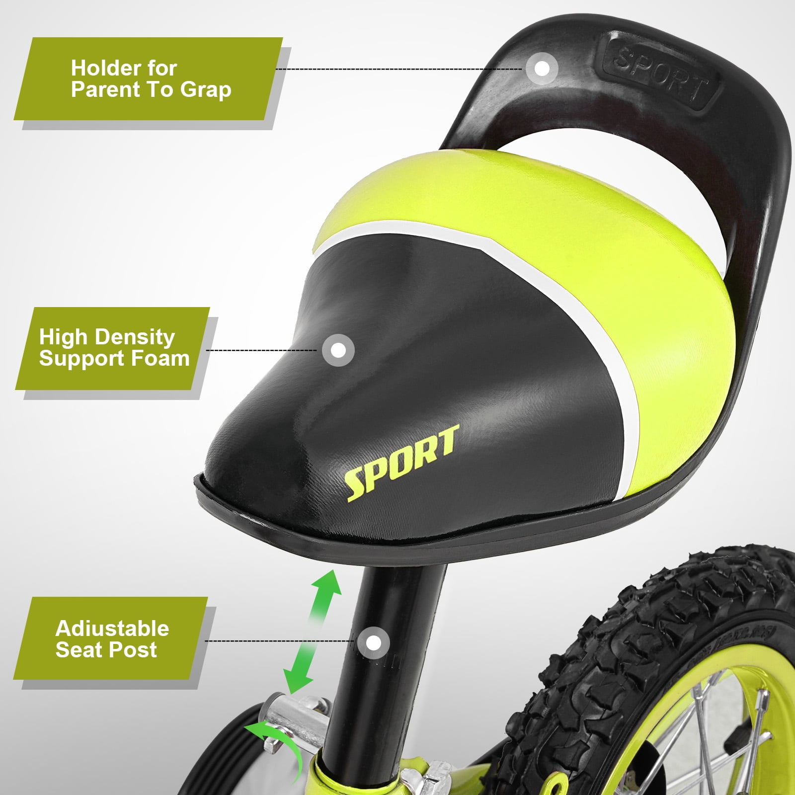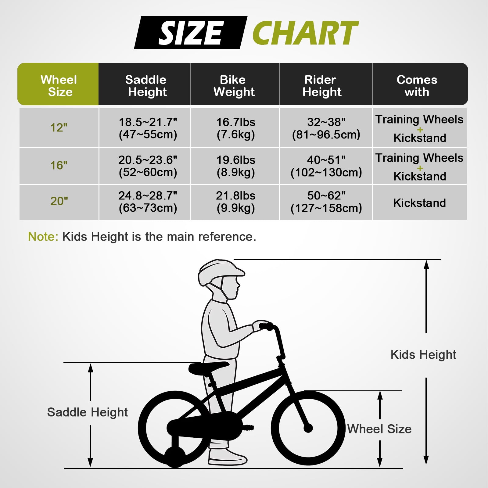 Safer riding – Safe grips and handbrake, Front caliper brake and rear coaster brake offer double safer, Wide 2.2” pneumatic tires add more stability, Sturdy steel frame,Crank, Non-slip resin pedal,Chainguard. Specifically for Kids – bike has sealed bearing for smooth pedaling.The optimized geometry is designed to work perfectly without training wheels. Fully adjustable seat and handlebar will give extra space when kids grow taller. Better Way to Learn – Kids naturally pedal back to adjust the pedals’ positions while learning to ride, and a coaster brake will get in the way.With kids specified two-hand brake bikes and short pull brake lever, kids can learn to bike without being held back by a coaster brake and still have equivalent braking power. Easy Assembly – The bike comes 85% pre-assembled, with an elaborated instruction manual and all tools needed in the box.It is easy enough to put together in 20 minutes. More size options – 12,16,20 Inch available.Use our easy-to-follow size chart, you’ll find a perfect size for your little beloved.Note: Please take the kids height into consideration.