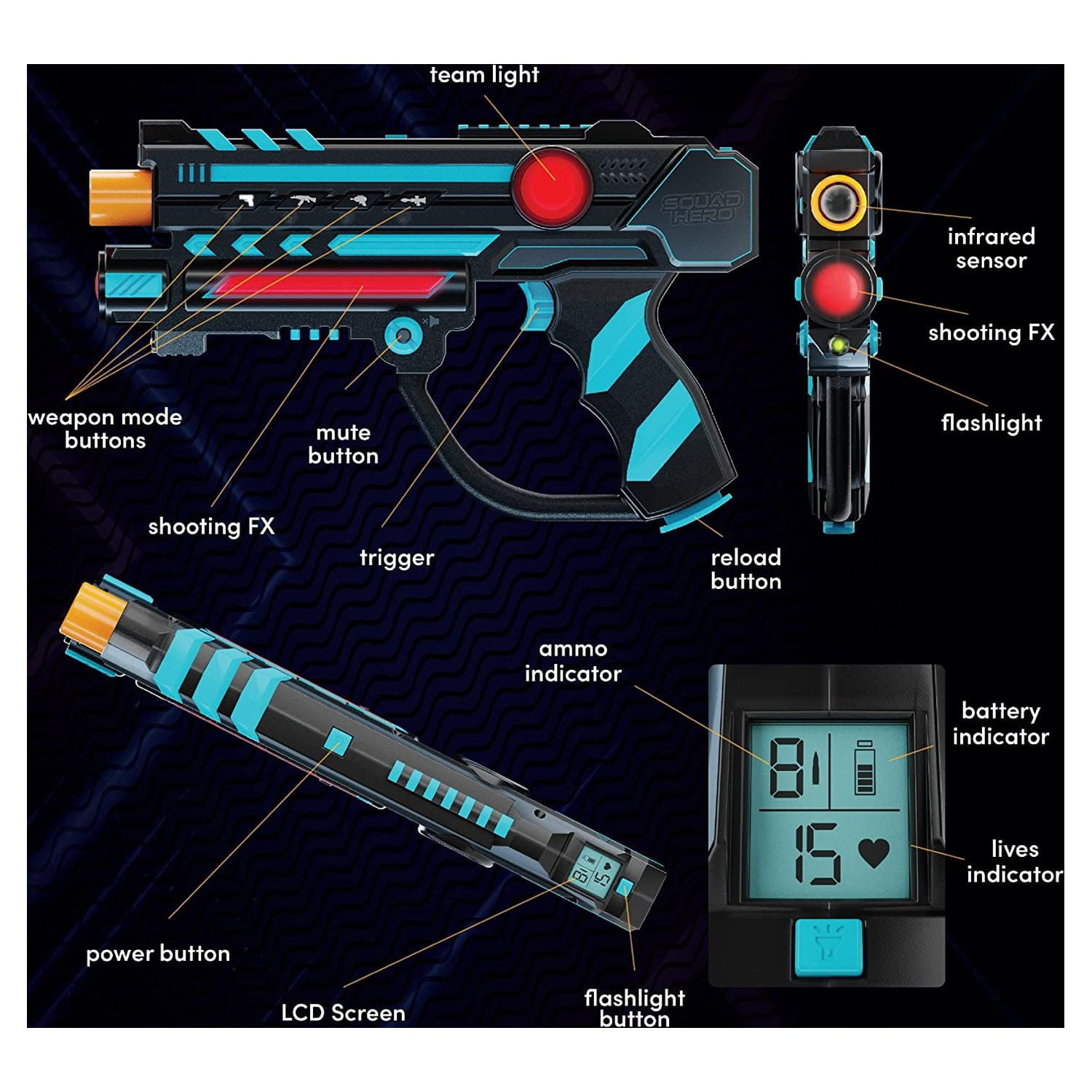 360° Combat: Engage in immersive combat with a trio of target zones – the chest, back, and the gun – leaving your opponents with nowhere to hide. Utilizing Herosync and LCD HUD technologies, forget the hassle of keeping track of scores. Your gear syncs seamlessly, displaying vital information on LCD screens located on vests and guns, ensuring you stay in the game without relying on distracting lights or audio cues. Rechargeable Gear: Bid farewell to constantly changing batteries during gameplay. The guns and vests in this set are fully rechargeable. With the inclusion of a cutting-edge charging station, recharging all your equipment simultaneously has never been easier. Enjoy approximately eight games on a single charge. The Apex of Laser Tag Innovation: Prepare for an epic battle for supremacy! Gear up with your vest, arm yourself with a weapon, monitor your ammunition, and transform your backyard or basement into an advanced laser tag battleground. Engage in a thrilling game of strategy – run, conceal, maneuver, aim, and eliminate adversaries to emerge victorious! This set includes four guns, each with front and back vests, and a charging station. Unparalleled Advanced Features: Select from four distinct weapon modes (Pistol, Automatic, Laser, and Rocket), tailor your gameplay with adjustable lives-per-game settings, employ Stealth Mode, opt for Team or Solo play, utilize the night flashlight, enjoy a staggering 150-foot range, benefit from child-safe infrared emissions, and expand your arsenal limitlessly with compatibility across all Squad Hero Laser Tag sets. Experience the ultimate in high-tech, heart-pounding laser tag action with BattleAction Laser Tag!