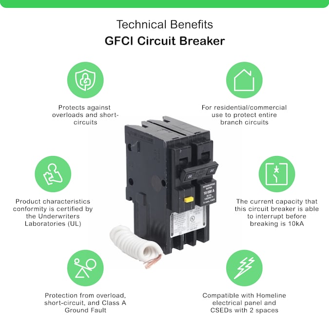 - Square D breaker protects from overload, short-circuit, and GF
