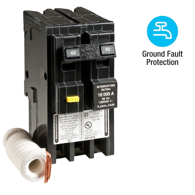 - Square D breaker protects from overload, short-circuit, and GF