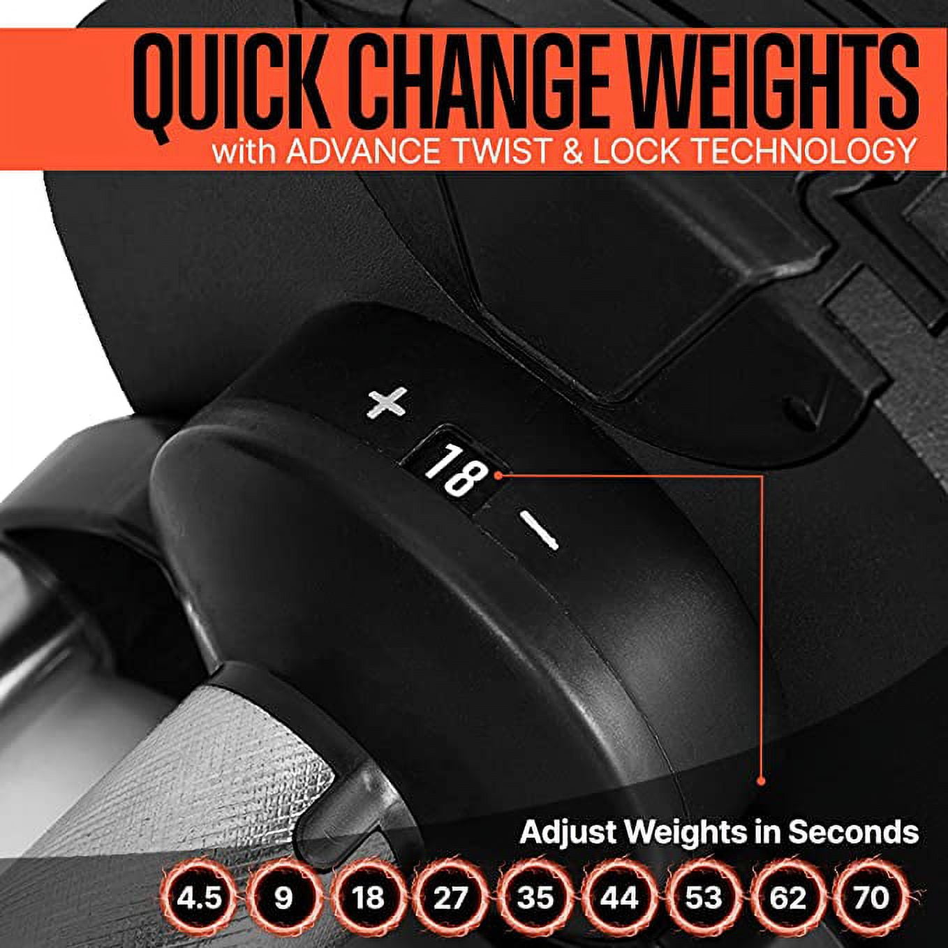SQUATZ Adjustable Dumbbells, Black, 70 lb 70 lbs Dumbbell: Achieve a total-body workout with our adjustable 70-pound dumbbell, perfect for shrugs, lunges, curls, and raises Premium Build Quality: Easily adjust weights from 4.5, 9, 18, 27, 35, 44, 53, 62, to 70 lbs, providing a full gym experience at home Perfect for Exercising: Ideal for anyone looking to gain muscle or tone arms and back, complete with a digital body transformation workout program Perfect for anyone looking to build muscle or tone their arms and back, this dumbbell allows you to perform a variety of exercises, including shrugs, lunges, curls and raises Elevate your fitness routine with this essential tool for effective weightlifting and exercise