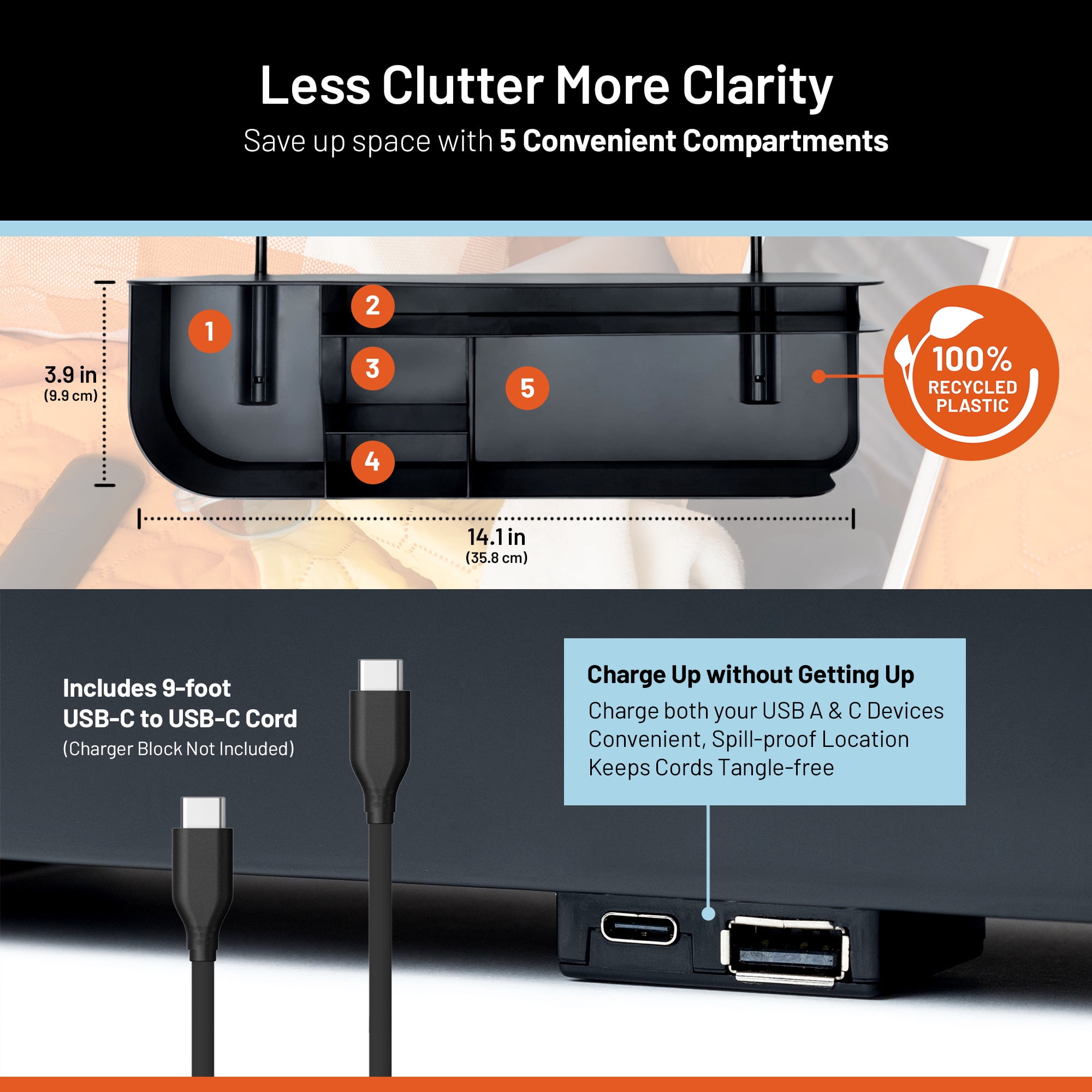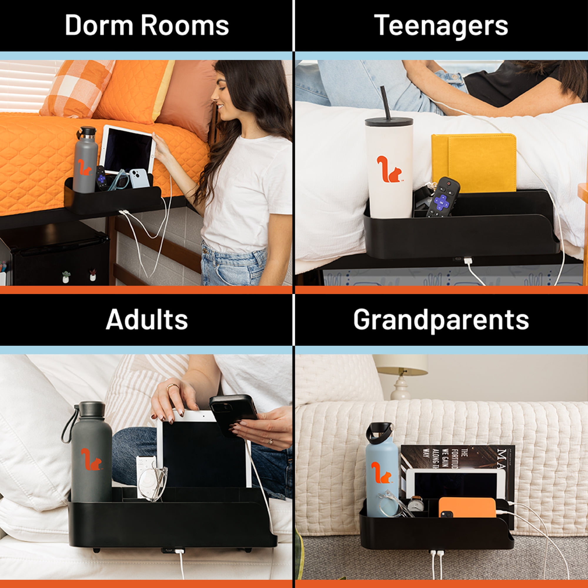 LESS CLUTTER, MORE CLARITY: Don’t let disorganization drive you nuts. The Bedside Perch conveniently organizes your essentials so everything you need is always within reach. When you’re looking for your phone, book, or wallet, you can guarantee it’s right where you left it. ONLY CADDY WITH USB-C & USB-A PORTS: No more stretching for far-away devices! Our two built-in charging ports for USB-C and USB-A iPhone, Android, & other devices keep your electronics fully charged and always in grabbing distance. Wall charger block sold separately. For optimal results and faster charging, use an Apple or Android branded wall block. SUSTAINABLY MADE WITH 100% RECYCLED PLASTIC: We’re not just clearing clutter. We’re reusing it. Squirrel’s commitment to helping the environment is in our DNA. Made with 100% post-consumer plastic, our bedside shelf organizer allows you to save space and save the earth at the same time. QUICK & EASY SET UP IN 30 SECONDS: In just 30 seconds, this bedside caddy and bed tray table gives you five different compartments designed to hold it all. Find the perfect home for your 32 oz. water bottle, remote, phone, tablet, and magazines. No tools required! Dimensions: 14.1 x 3.9 X 4.7 inches. SMALL SPACE & DORM ROOM FRIENDLY: When you’re looking for college essentials, put Squirrel at the top of your list. The Bedside Perch is perfect for small or shared spaces and it’s not just for beds! Whether your dorm room needs a bunk bed caddy or your couch needs an organization buddy, we got you covered. ULTIMATE COLLEGE DORM GIFT FOR GIRLS AND BOYS: Looking for a thoughtful gift for college girls or college boys? This bedside caddy is the ideal college dorm gift, perfect for keeping essentials organized in dorm rooms, apartments, or RVs. A versatile gift idea for college freshmen girls and boys, it offers a convenient solution for small spaces, making it a great choice for girl college dorm room gift ideas or boy college dorm room gift ideas. All ages. COOL CADDY GIFT-SET – PERFECT FOR COLLEGE STUDENTS AND SECRET SANTA: This caddy is a practical gift for college guys and college girls, making it one of the best 50 Secret Santa gift ideas this season. Great for Halloween gifts for college students or college gifts for guys, it’s a unique addition to any dorm, apartment, or shared space, making life easier for students who need to keep their essentials within reach. THE PERFECT GIFT FOR ANY OCCASION: Delight your loved ones with the Squirrel Bedside Perch—a stylish and functional USB charging bedside caddy and bed table tray organizer. Ideal for birthdays, Christmas, Hanukkah, Valentine’s Day, Mother’s Day, Father’s Day, Easter, weddings, housewarmings, and more, this versatile accessory enhances any bedroom decor while keeping essentials within reach. It’s a thoughtful present for students, parents, newlyweds, and anyone who enjoys a clutter-free space!