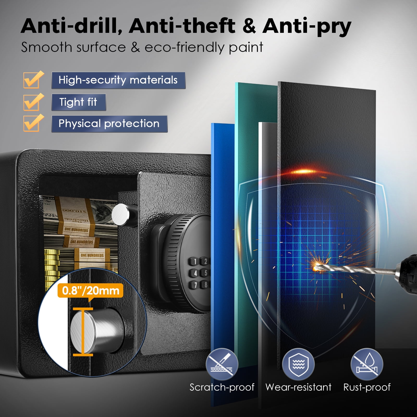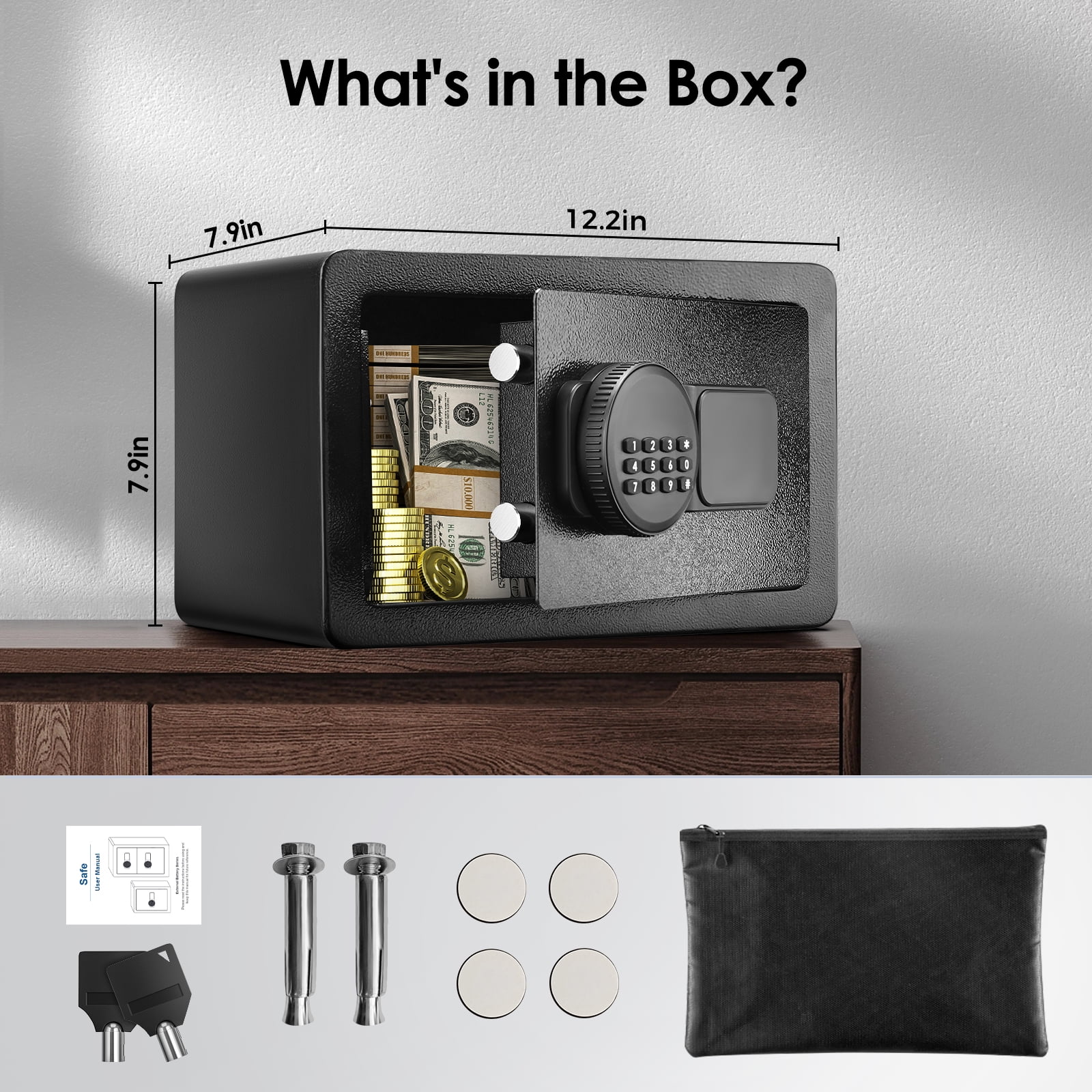 SRWTRCHRY 0.6 Cu. ft. Safe Box, Lock Box with Fireproof Safe Bag, Cash Box, Money Box with Key, Small Safe, Digital Keypad Lock, Wall-Mount Safe SRWTRCHRY is a leading brand specializing in the production of security safes. Together with thousands of dedicated employees, SRWTRCHRY is committed to providing durable safes to customers. Today, SRWTRCHRY has captured markets in over 200 countries and boasts over 10 million global members. Why Choose SRWTRCHRY? 1. Stringent Quality Assurance 2. Unbeatable Low Prices 3. Swift and Secure Delivery 4. 30-Day Free Returns 5. 24/7 Professional Customer Service