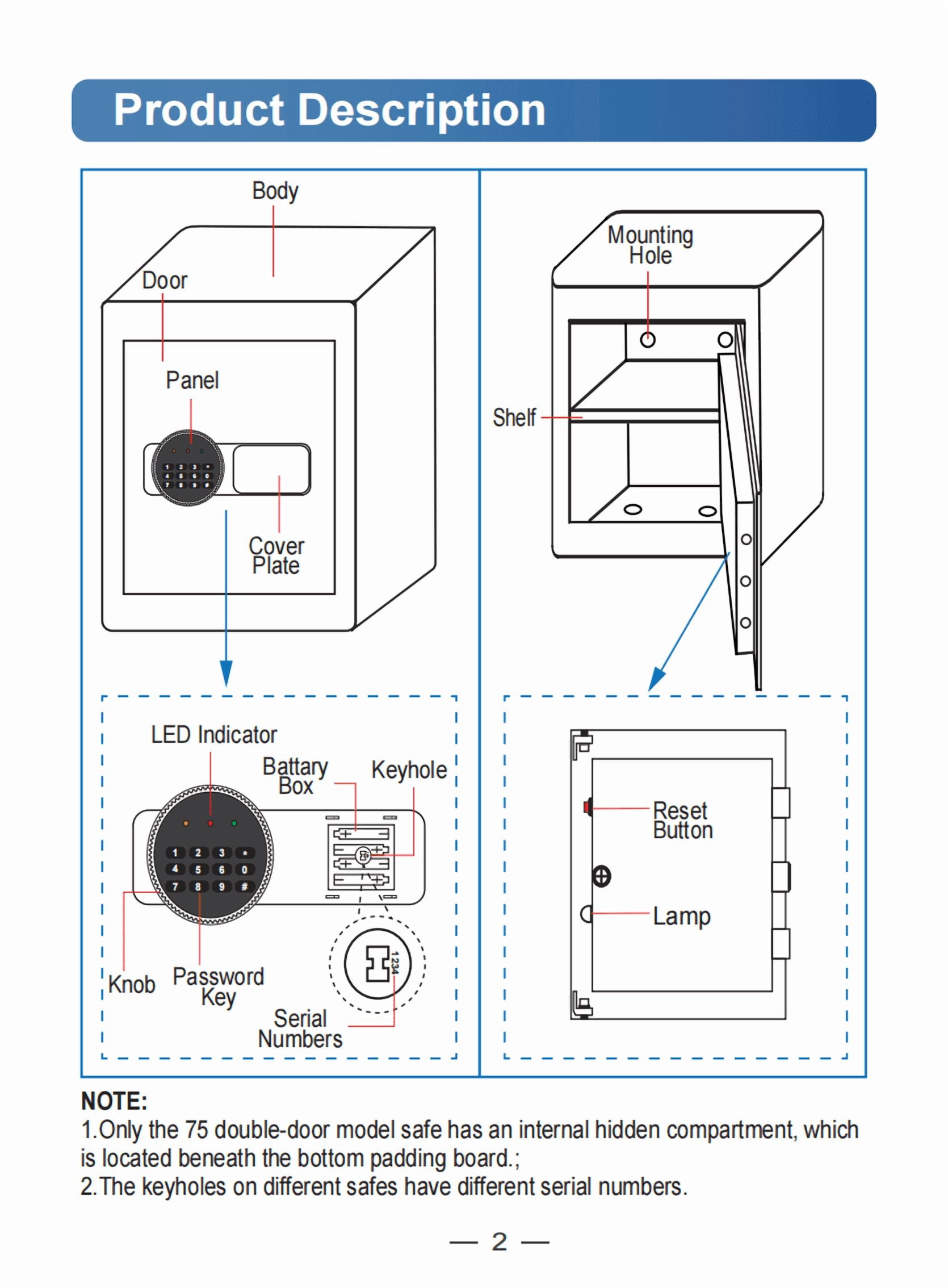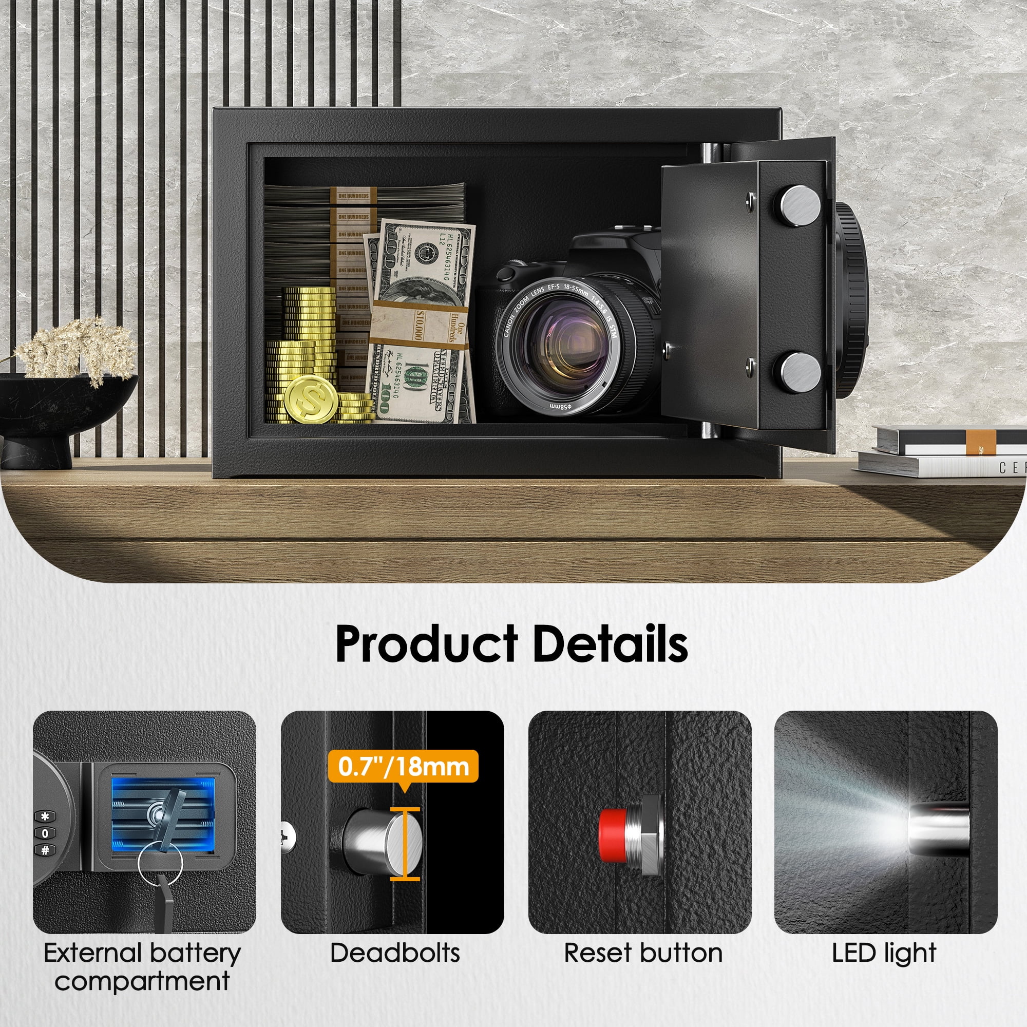 【High Quality & Safe and Durable】Our safe box is designed with 2*18mm solid locking bolts, built-in hinges, anti-collision, and anti-pry micro slits, with excellent anti-prying and anti-theft performance. External dimensions of our safes: 12.2″*7.9″*7.9″. With an additional fireproof and waterproof money pocket (9.36×13.65 inches), the combination safe and fireproof bag will protect your valuables from fire, hurricanes, and earthquakes. 【External battery box & LED Indicator 】External battery box is a breakthrough in the market, if the battery dies without you noticing, you can open the external battery compartment to replace it, so you won’t be troubled by the fact that you can’t unlock small safe without the emergency key. If the red and green lights are on, this indicates that the battery has been depleted and needs to be replaced as soon as possible. 【Two Unlocking Methods】① password + rotary button, ② emergency key + rotary button. You can set a 3-digit combination for your safe. If you forget the password or the battery is dead, you can use the hidden emergency key to open the sentry safe fireproof waterproof box. (please keep the emergency key out of the safe). The default password is “159”. 【Double Alarm Design】Three times to enter the wrong password safe fire waterproof will sound a warning beep lasting 60 seconds, enter the correct password to stop the alarm. Violent knocking will also trigger the alarm system. 【Easy to install】If needed, the fireproof safe boxes for home have pre-assembled holes in the back so you can easily secure them to keep your valuables safe. Also, the compact size of 0.6 cubic feet is easy to conceal in a drawer, cabinet, closet, or nightstand. 【365 Day Free Key Replacement】If you lose your key, we can send you a new one. We have a 24-hour online customer service. If you have any questions or have any questions, please contact me at the first time. SPECIFICATIONS: Brand: SRWTRCHRY Material: Steel plate Color: Black Product Size: 12.2*7.9*7.9 inches Product Weight: 11.6lbs. Power supply: 4*AA batteries (not included in the product) Capacity: 0.6 Cu. ft. Package Include: 1*Electronic Digital Safe Box, 4*Expansion screw, 2*Emergency key, 1*Pad blanket, 1*Fireproof Bag, 1*Manual