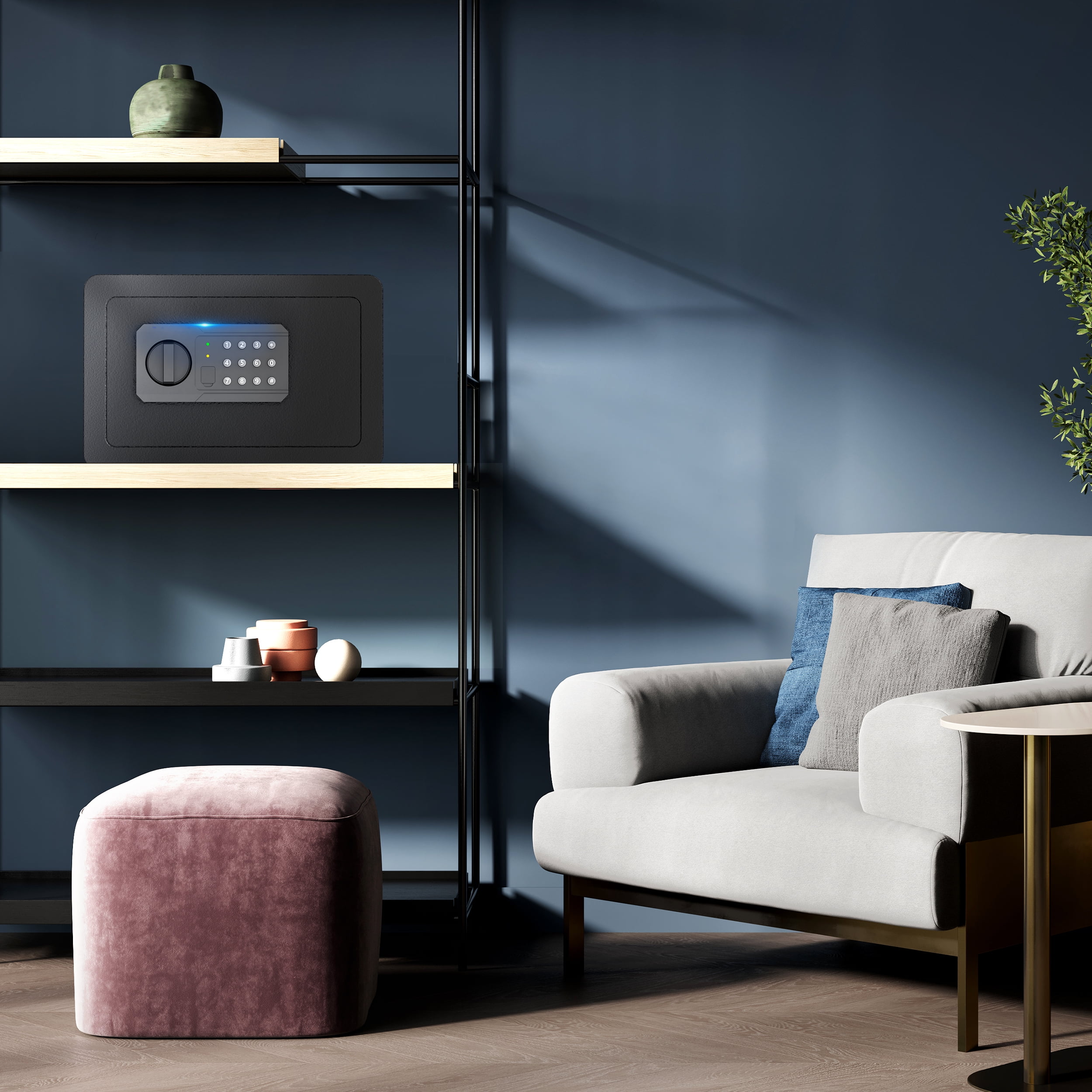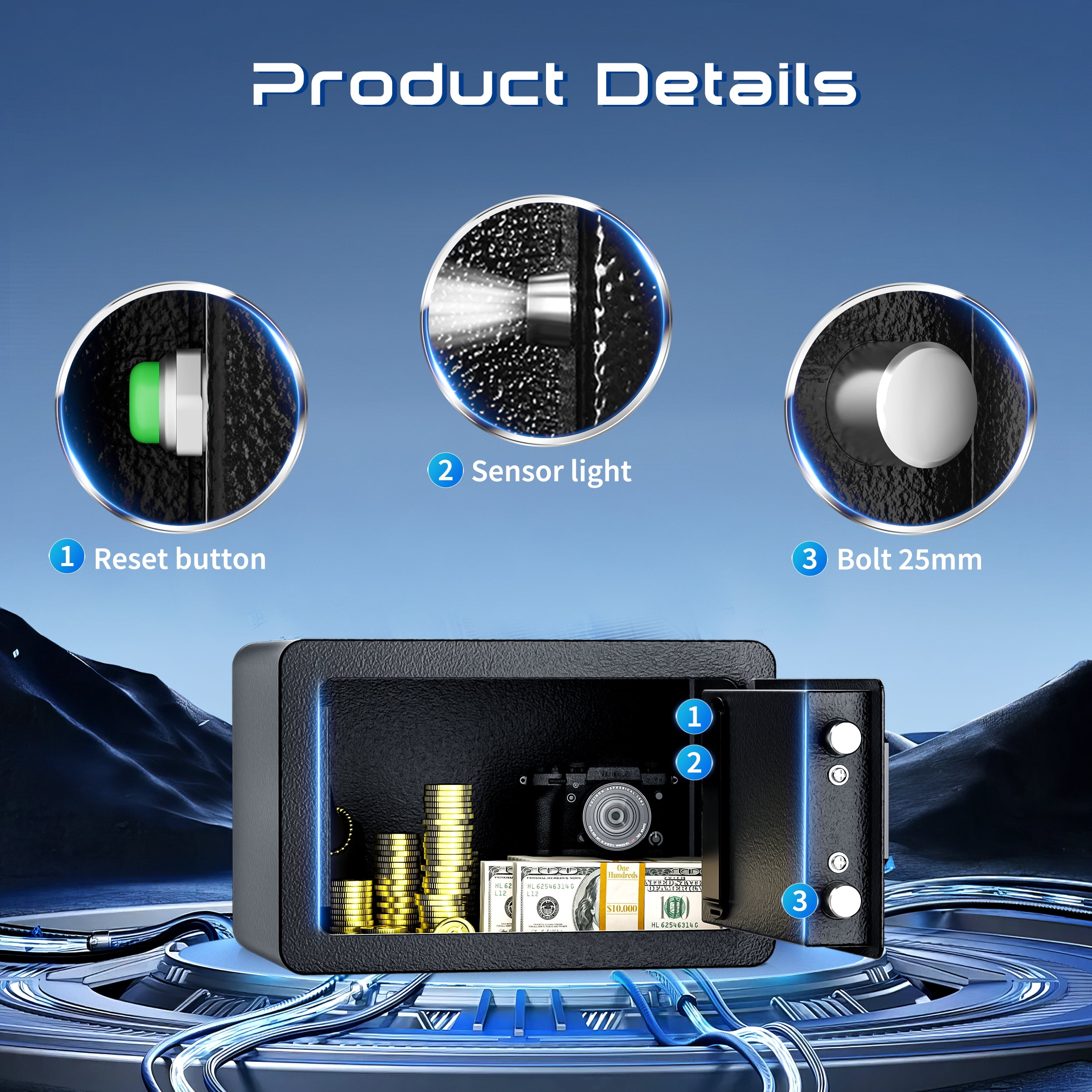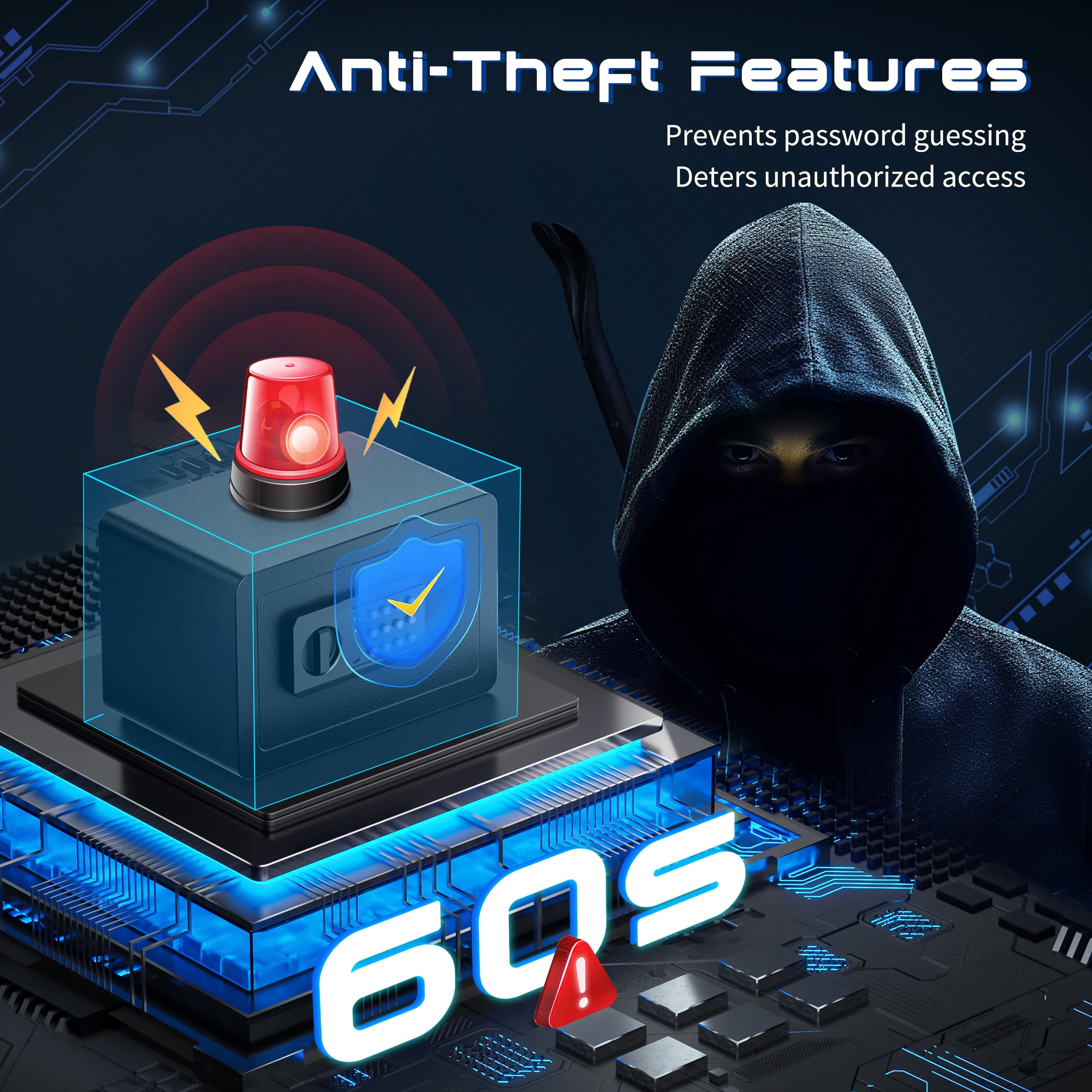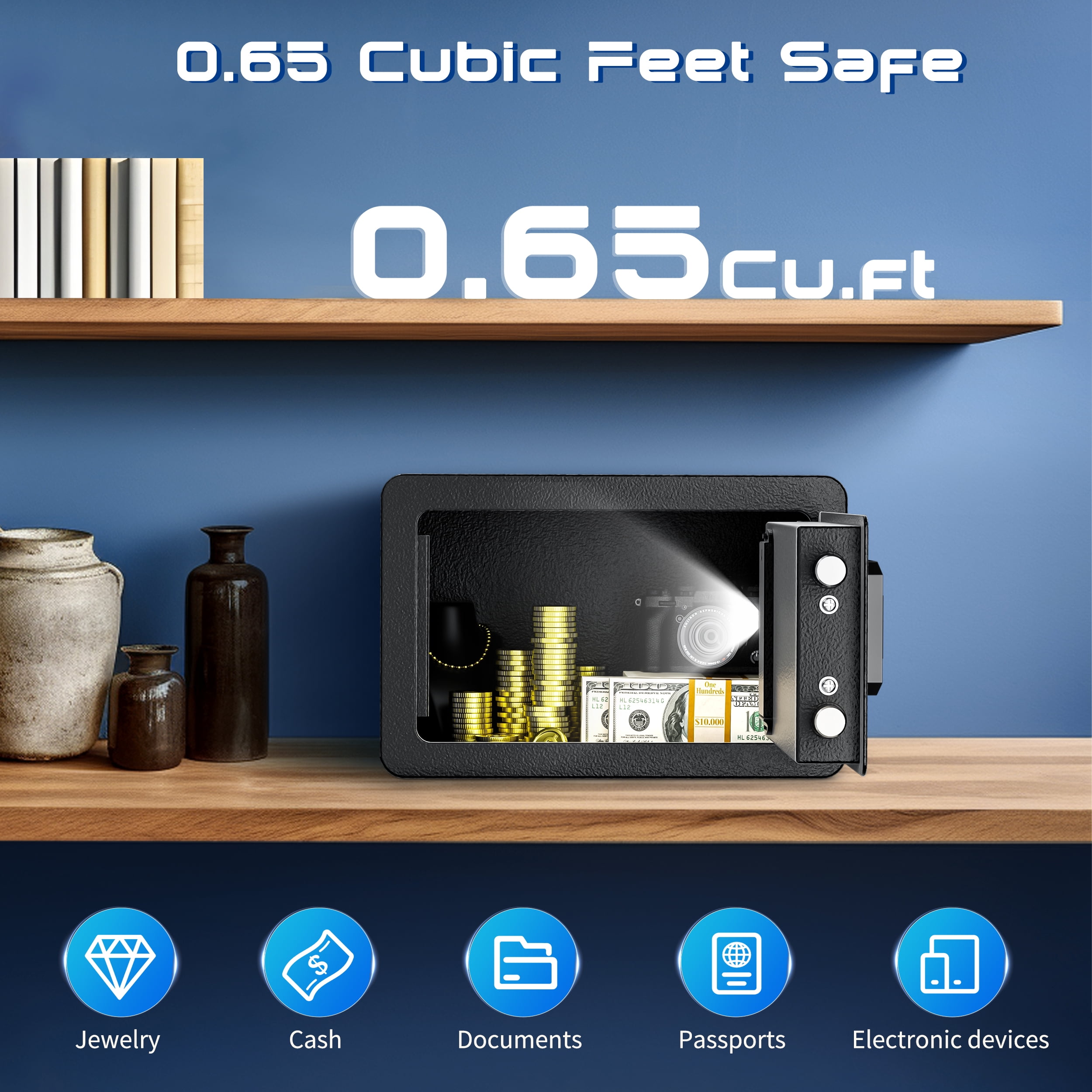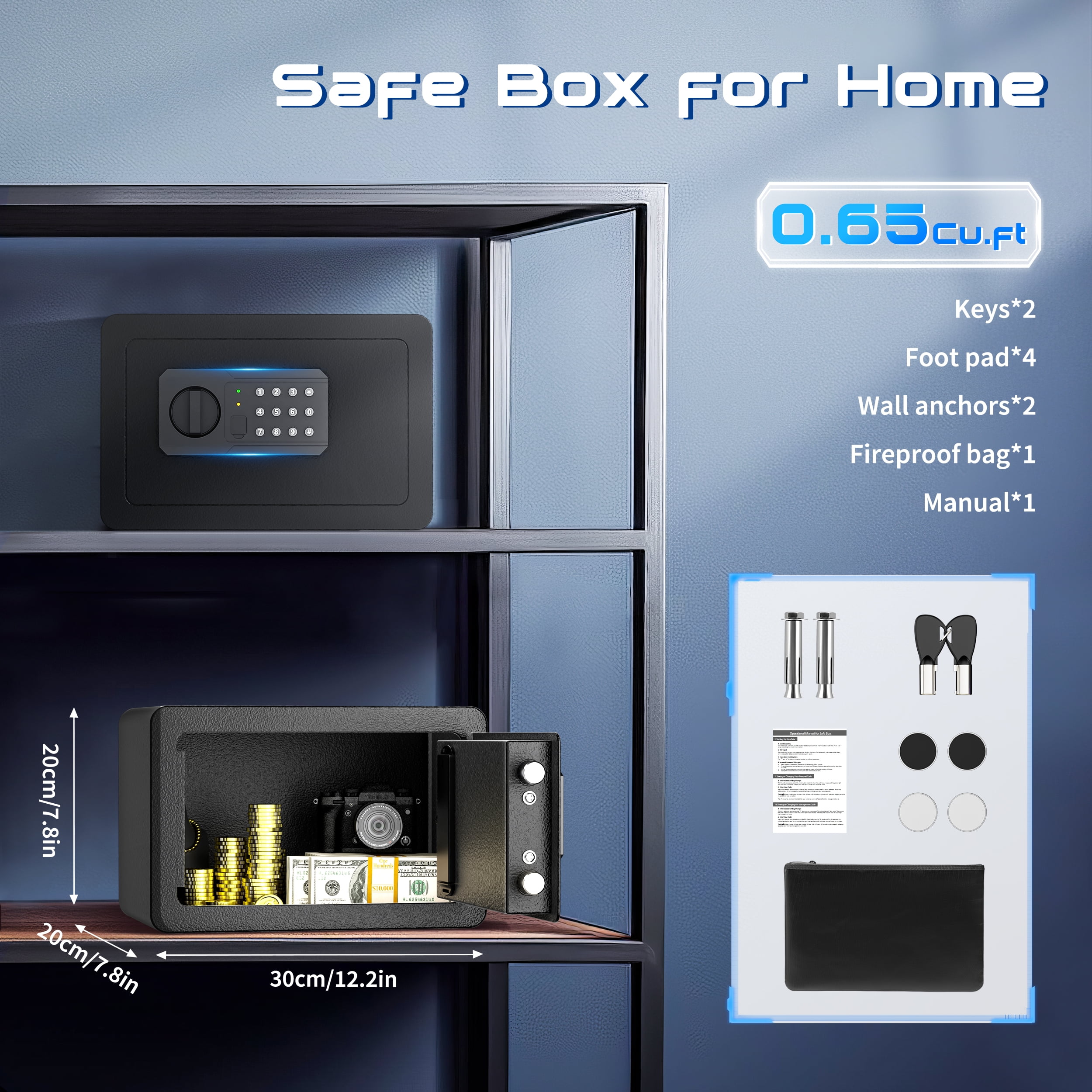 SRWTRCHRY 0.65 Cu. ft. Safe Box, Keys & Digital Keypad Lock, Home Safe for Money, Wall Mountable, Black The SRWTRCHRY safe features a dual alarm system that prioritizes security, ensuring peace of mind at home or in the office. It uses high-density alloy bolts with anti-drill and anti-pry capabilities and includes multiple alarms for low battery, tamper vibrations, and misoperations. The SRWTRCHRY safe also boasts a seamless door edge design for comprehensive theft protection and a smart interior layout for efficient organization of items.