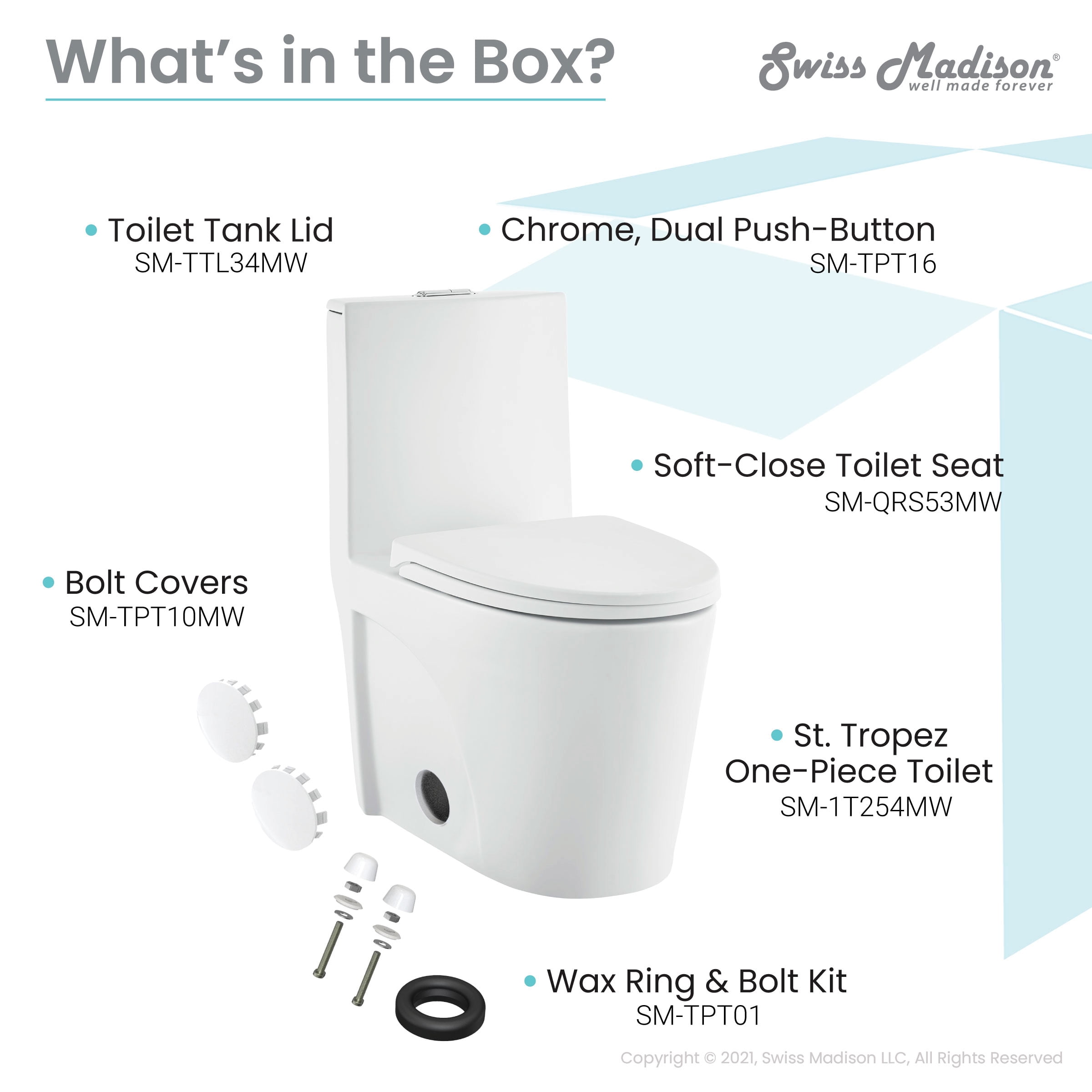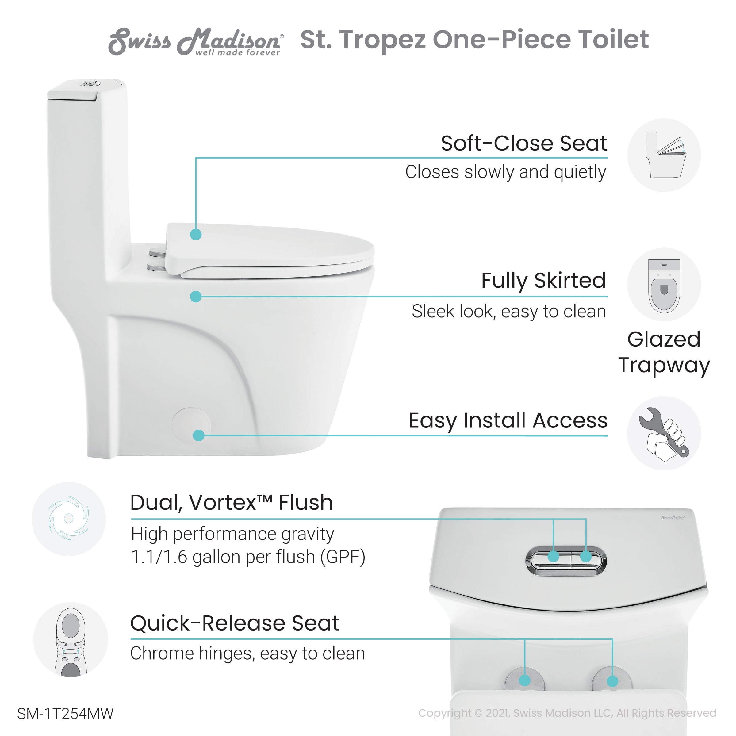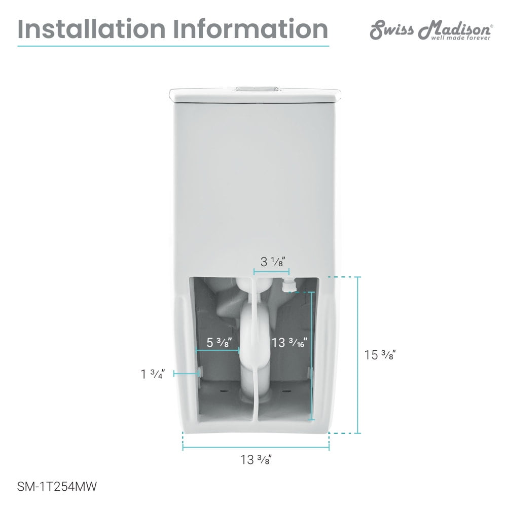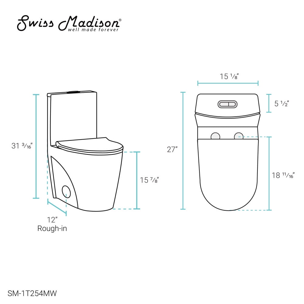 Dual Flush: The buttons for dual flush allow you to choose between a low 1.1 GPF light flush or a high 1.6 GPF full flush. Rough-In: Standard 12″ Rough-In Standard Elongated Bowl: The elongated bowl provides extra room and comfort. Between 15-17 inches, the standard height toilet is designed with ergonomic considerations, offering optimal comfort to users of all ages and body types. Durable Non-Porous Scratch Resistant Ceramic: Developed from ceramic, that is scratch-resistant and non-porous, providing a durable and reliable option that can withstand routine use. Fully Glazed and Skirted Trapway: The skirted trapway offers hidden plumbing creating an elevated and luxurious design with a smooth finish for easy cleaning. The fully glazed trapway prevents clogs and keeps water flowing freely. Access Hole: 3″ Diameter access holes for installation. Soft Close and Quick Release Seat: Provides a silent and gentle closing mechanism for added convenience and safety. With just the push of a button, the seat detaches completely for a thorough cleaning. Collection: Part of the St. Tropez Collection, explore additional products in this collection to complete the room.