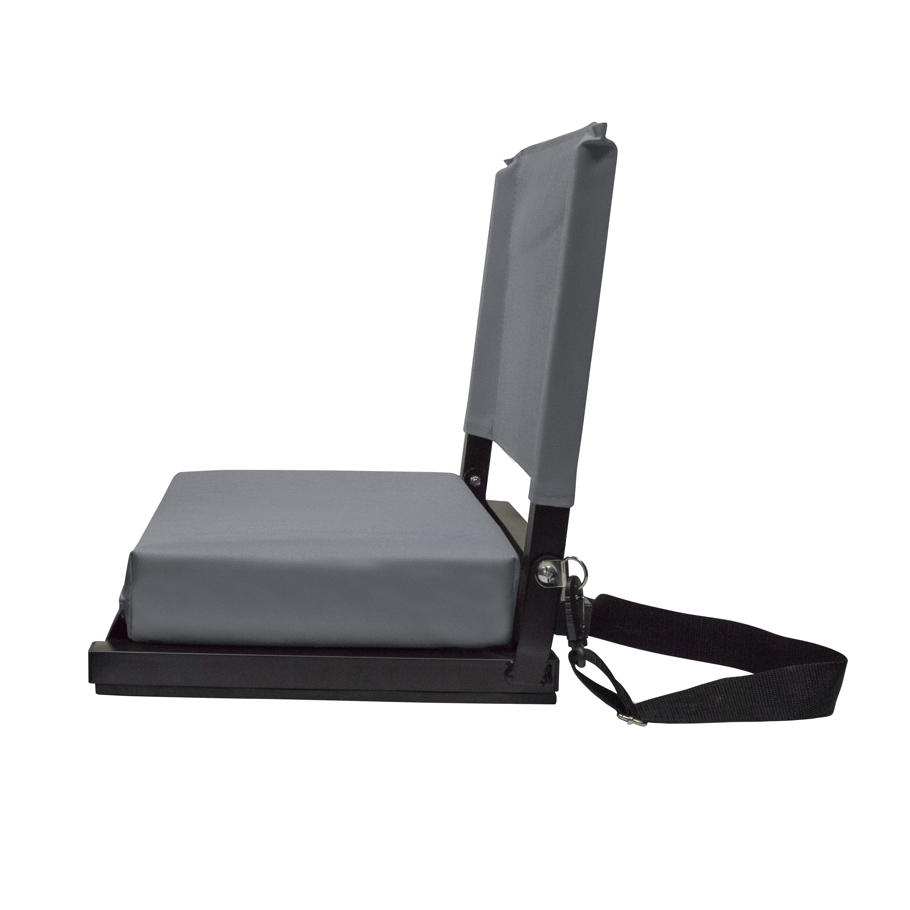 This Large size ultra-comfortable Stadium Chair has 3” thick padded seat that provides all day comfort on any surface for dedicated fans while watching your favorite events. Constructed with a quality steel frame and powder coated finish that makes these chairs durable for years of comfort. Portable and easy to carry, these chairs fold in half with a built in handle and adjustable shoulder strap that makes it easy to transport to and from each event. Bleacher hooks secure the seat to bench style seating along with solid rubber treads that provide additional grip to prevent sliding for a worry free seating experience.