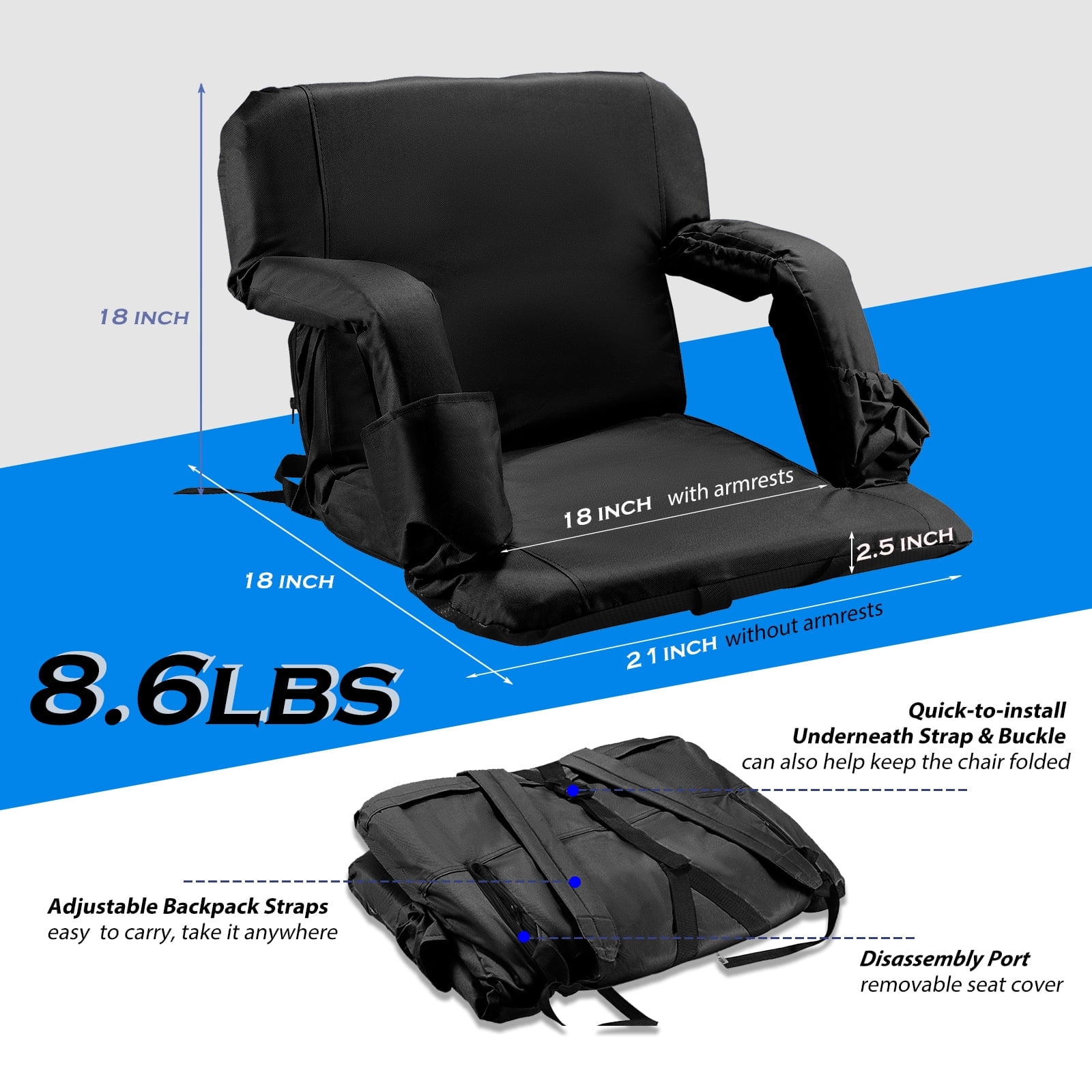 comfortable and safe:Built with sturdy steel frame, the seats are padded with 1.2 inch thickness foam and covered with durable fabric, providing you with pillow-like coziness. The bottom is made of non-slip waterproof rubber, and the bottom strap can be securely attached to the bench preventing slipping off. collapsible and portable: The stadium seat can be easily folded up. Two shoulder straps and 8.8lbs light weight allow you to carry it like a backpack, perfect for fishing, picnics, beach, stadium bleachers, outdoor concerts and other outdoor events. 6 reclining positions and 2 width positions:The backrest can be adjusted in 6 different angles, providing the most comfortable and suitable position. You can use it with handrails to rest arms comfortably, or lower the armrests to get more spacious seating. Convenient chair pockets: Always keep your possessions within reach. Two front pockets can hold water bottles ,drinks and snack. Side pockets holds valuable phones, keys, wallets etc. The large back zipper pocket are made for extra storage.