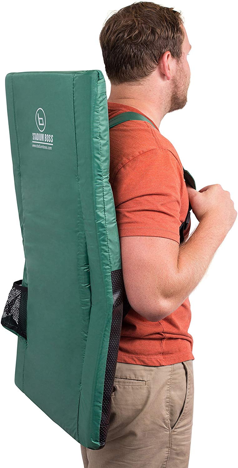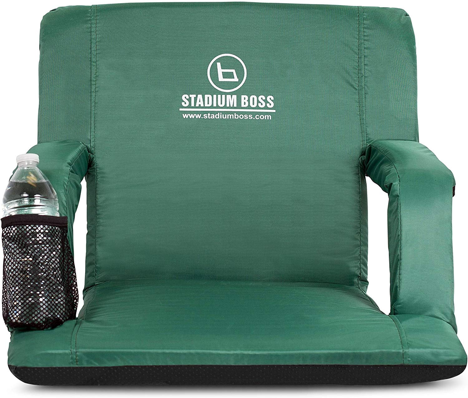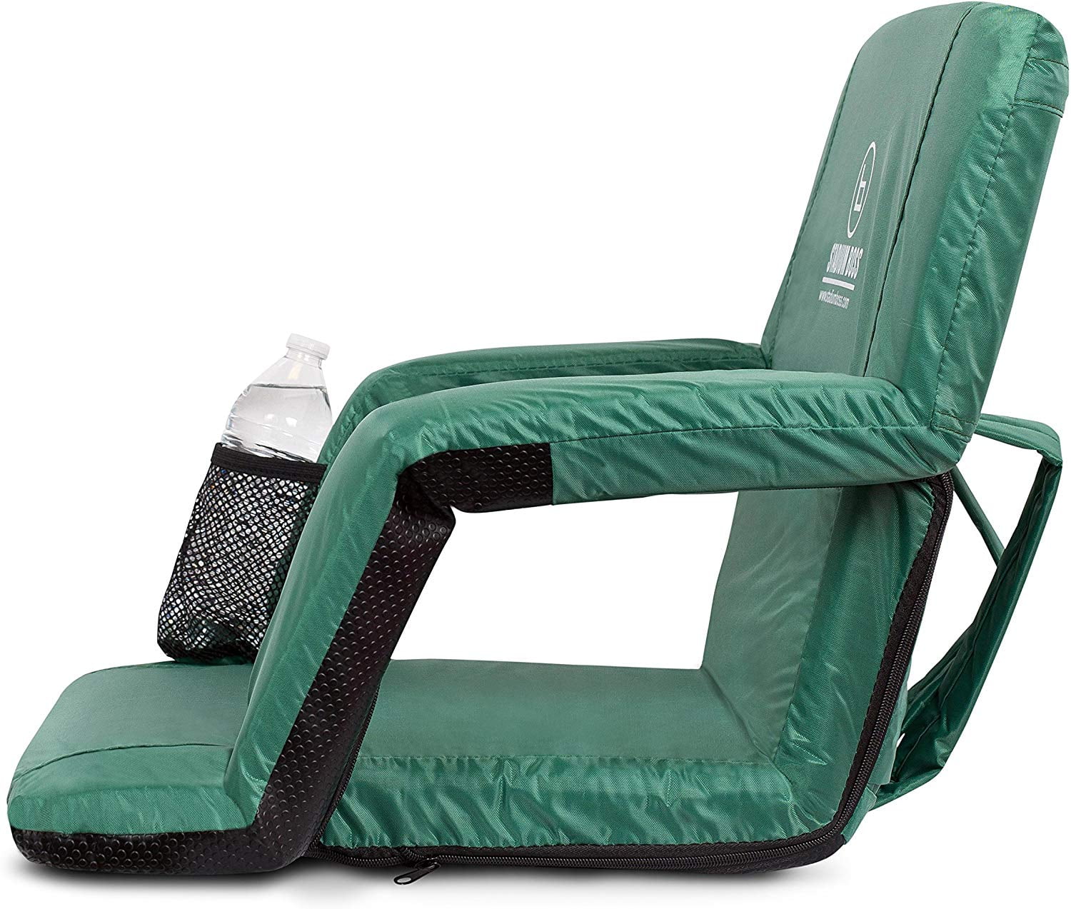 DURABLE CUSHIONED CHAIR: Each stadium seat is equipped with a polyester-covered padded cushion attached to a durable steel frame for optimal comfort. The bottom of each seat is built with a water resistant material allowing for your underside to remain dry,6 RECLINING POSITIONS: The sports chair is built to recline to 6 different positions to adjust to your unique fit. Folds flat for ease of storage.,ARMREST, STORAGE POCKET, CUP HOLDER & CARRY STRAPS: The stadium seat features comfortably padded armrests, a cup holder on one armrest and a zipper storage pocket for stowing away extra accessories. When carrying to and from the game, the chair is equipped with backpack-style shoulder straps for ease of transport.,2 WIDTH POSITIONS: The sports chair may be set with armrests up fitting a width of 15 . Set the chair with no armrests to reach a maximum width of 20.5 . OVERALL DIMENSIONS: 20.5 Width x 32 Length x 2 Height