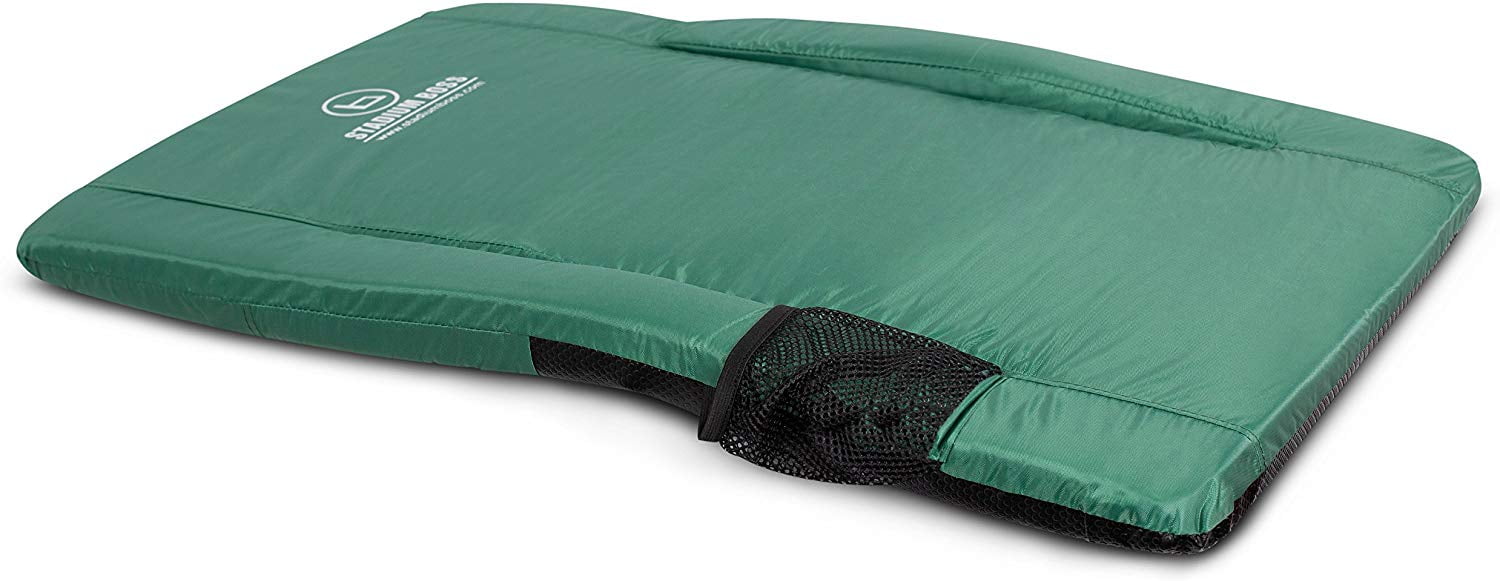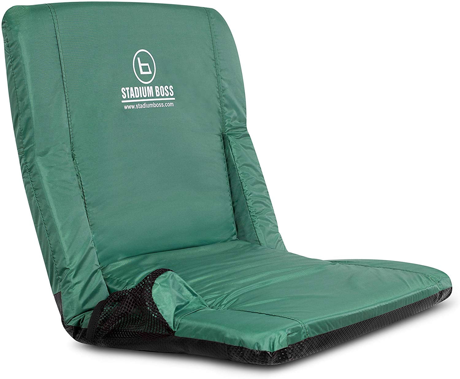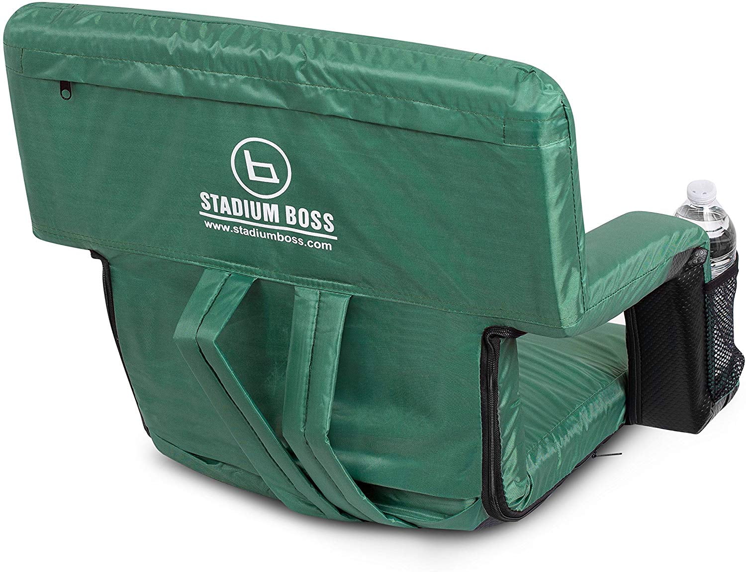 Stadium Boss Recliner Stadium Seat is the perfect comfortable chair for your next sporting event, backyard hangout or beach vacation. Each stadium seat is equipped with a polyester-covered padded cushion attached to a durable steel frame for optimal comfort. The bottom of each seat is built with a water resistant material allowing for your underside to remain dry. The sports chair is built to recline to 6 different positions to adjust to your unique fit. The chair also folds flat for ease of storage. The stadium seat features comfortably padded armrests, a cup holder on one armrest and a zipper storage pocket for stowing away extra accessories. When carrying to and from the game, the chair is equipped with backpack-style shoulder straps for ease of transport. DIMENSIONS WITH ARMREST IN USE 15″ Width x 32″ Length x 2″ Height DIMENSIONS ARMREST FOLDED DOWN 20.5″ Width x 32″ Length x 2″ Height