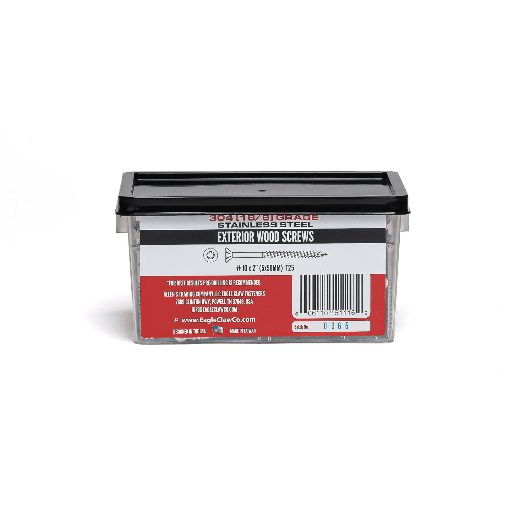 STAINLESS STEEL WOOD SCREWS FOR DECKING, FENCING AND ALL OUTDOOR APPLICATIONS. NO MORE UGLY STAINING OF YOUR TIMBER!#10 X 2″, STAR DRIVE T25 TORX (BOX OF 350)ADVANTAGES OF EAGLE CLAW STAINLESS STEEL WOOD SCREWS: No Corrosion with stainless steel screws, as is the case with coated or plated screwsNo more ugly staining of the timber caused by corroding screws or nails.No working loose over time as is the case with nails and staples.Can be safely used in Redwood, Cedar and pressure treated timber without corrosion or chemical reaction.Top Quality: We design our own screws, and get them manufactured to precise specifications by a reputable company in Taiwan that has worked with us for many years.Long Lasting: Ideal for use in all Outdoor, Coastal and Wet Area applications. ADVANTAGES OF STAR DRIVE (T25 TORX):Star Drive Screws can handle far higher torque than Square and Phillips Drive, therefore reducing cam-out and protecting the screw while prolonging driver bit life.