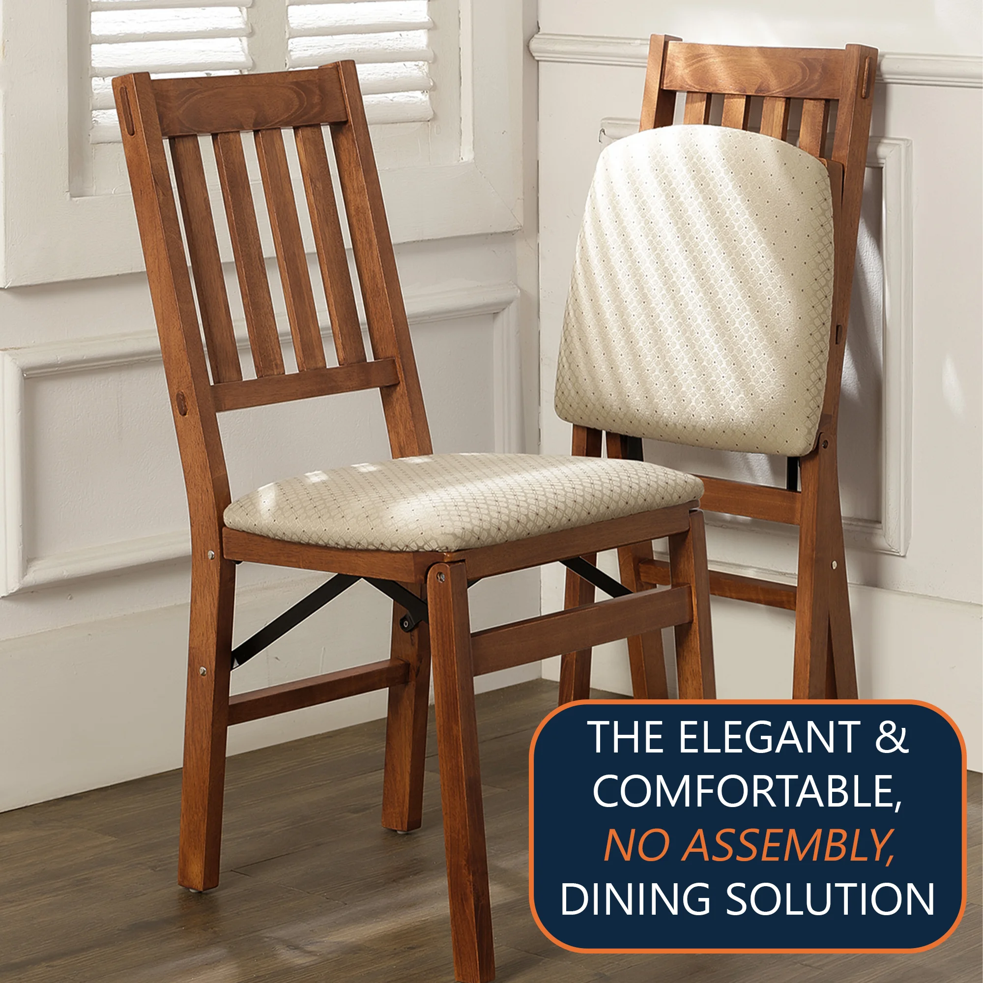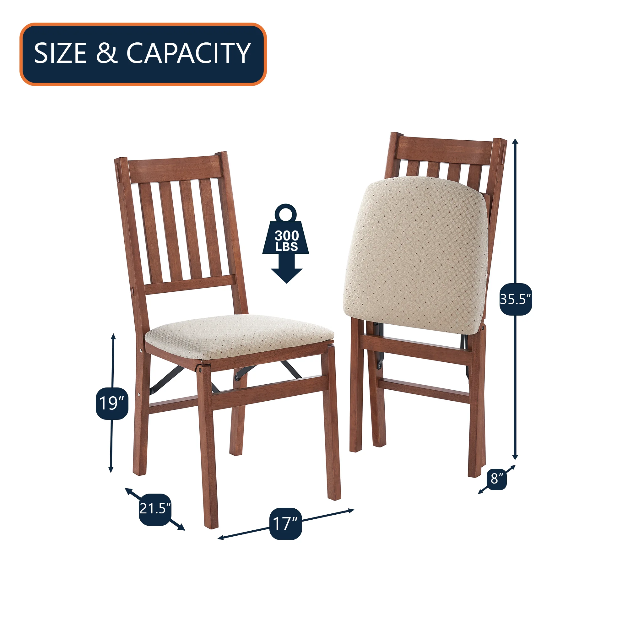 Ships in sets of 2 only. Available in Cherry, Fruitwood and Oak finish Premium solid wood construction Steel folding mechanism Blush fabric upholstered seat Folds to 8″ deep for storage No assembly required Seat Height: 19″ Overall Dimensions: 35.5″ H x 17″ W x 8″ D Closed – 21.5″ D Open Unit Weight: 12.7 Lbs. Weight Capacity: 300 Lbs. Product Warranty: 5 Years Can seat adults or Children