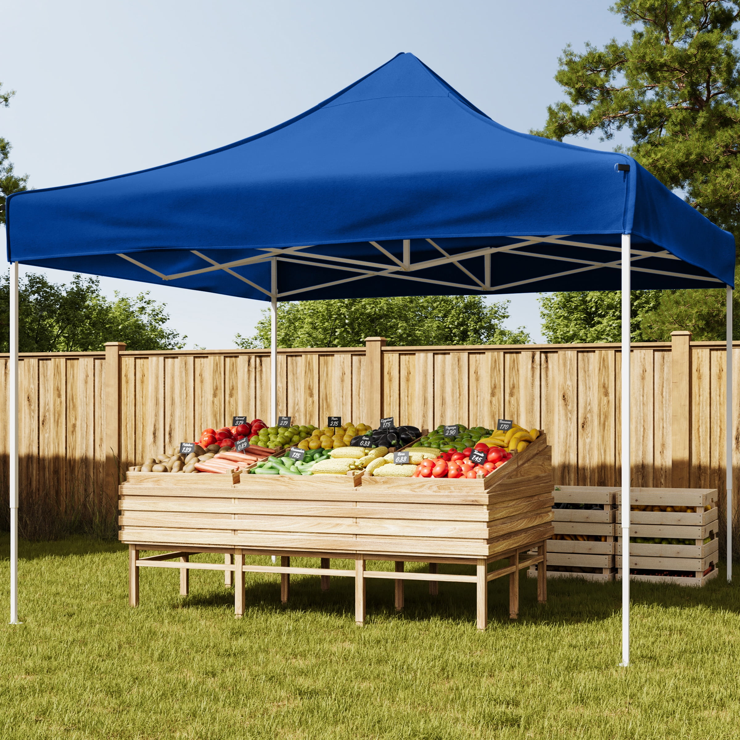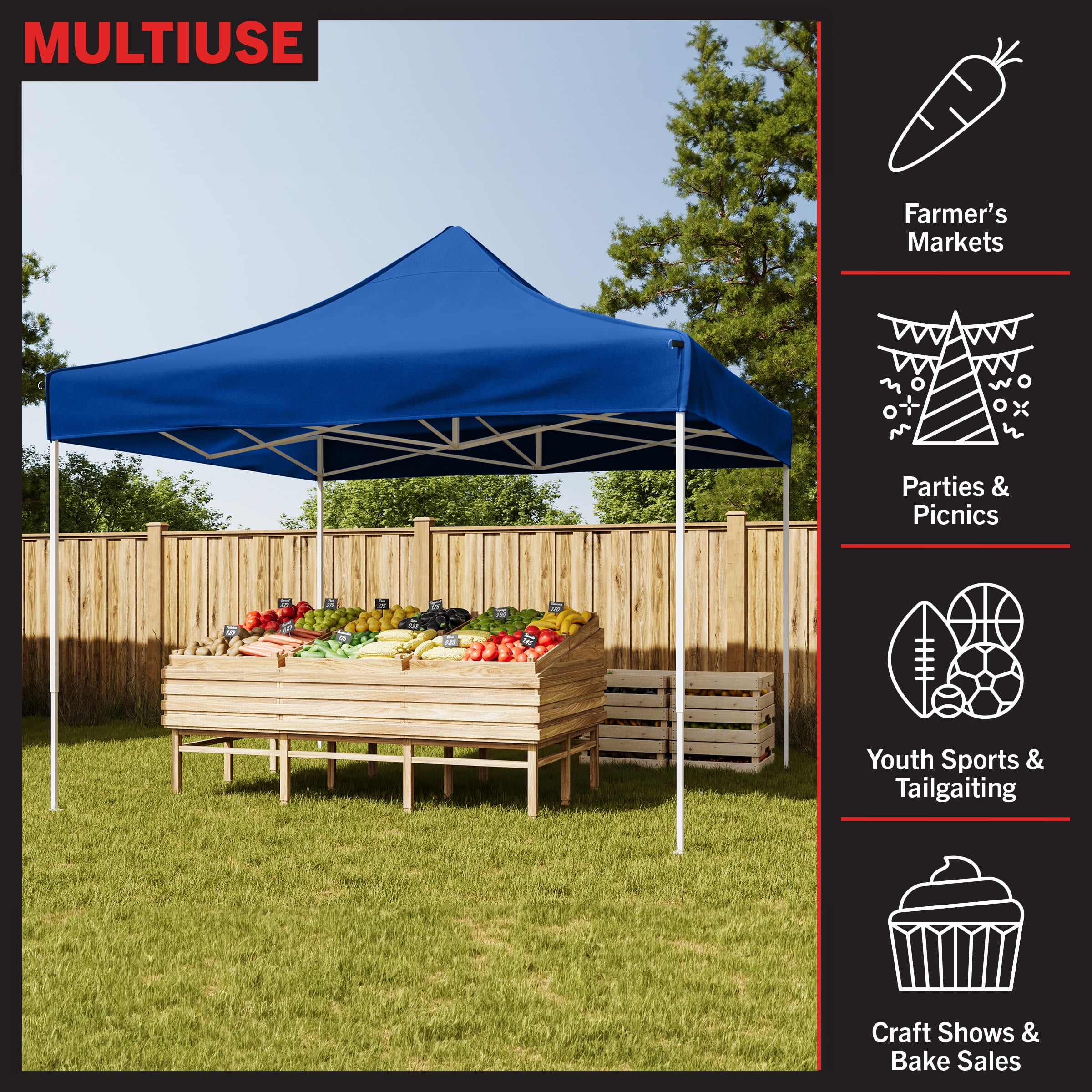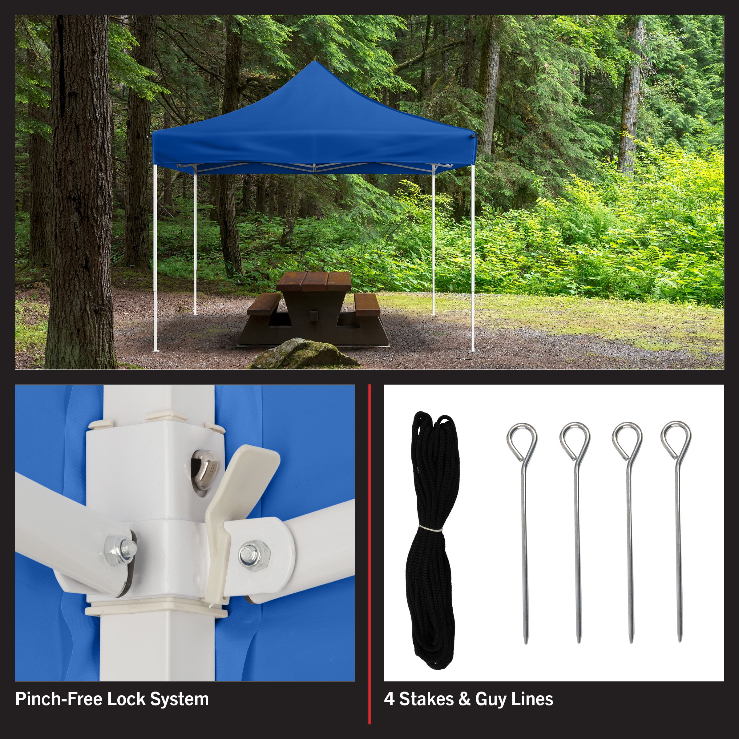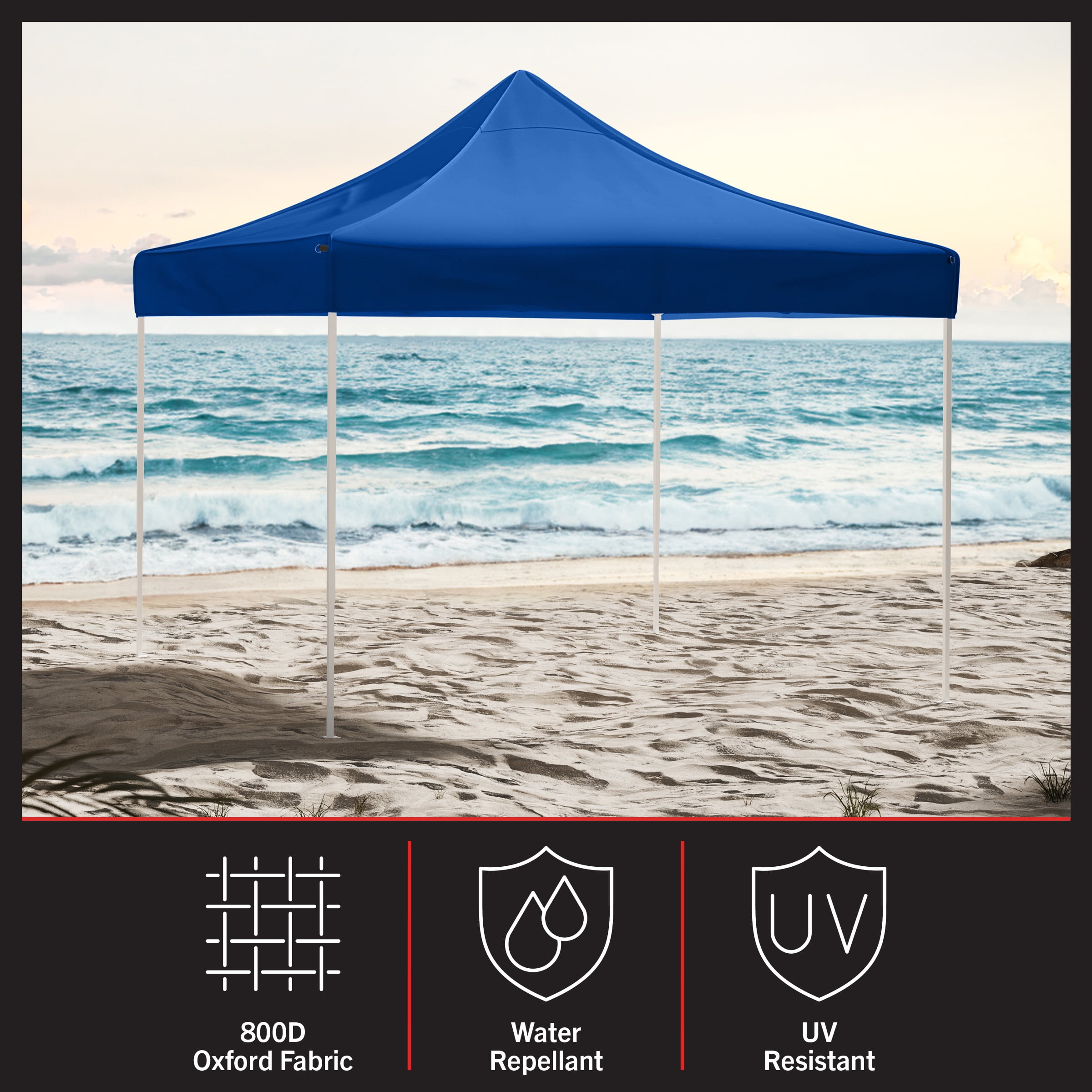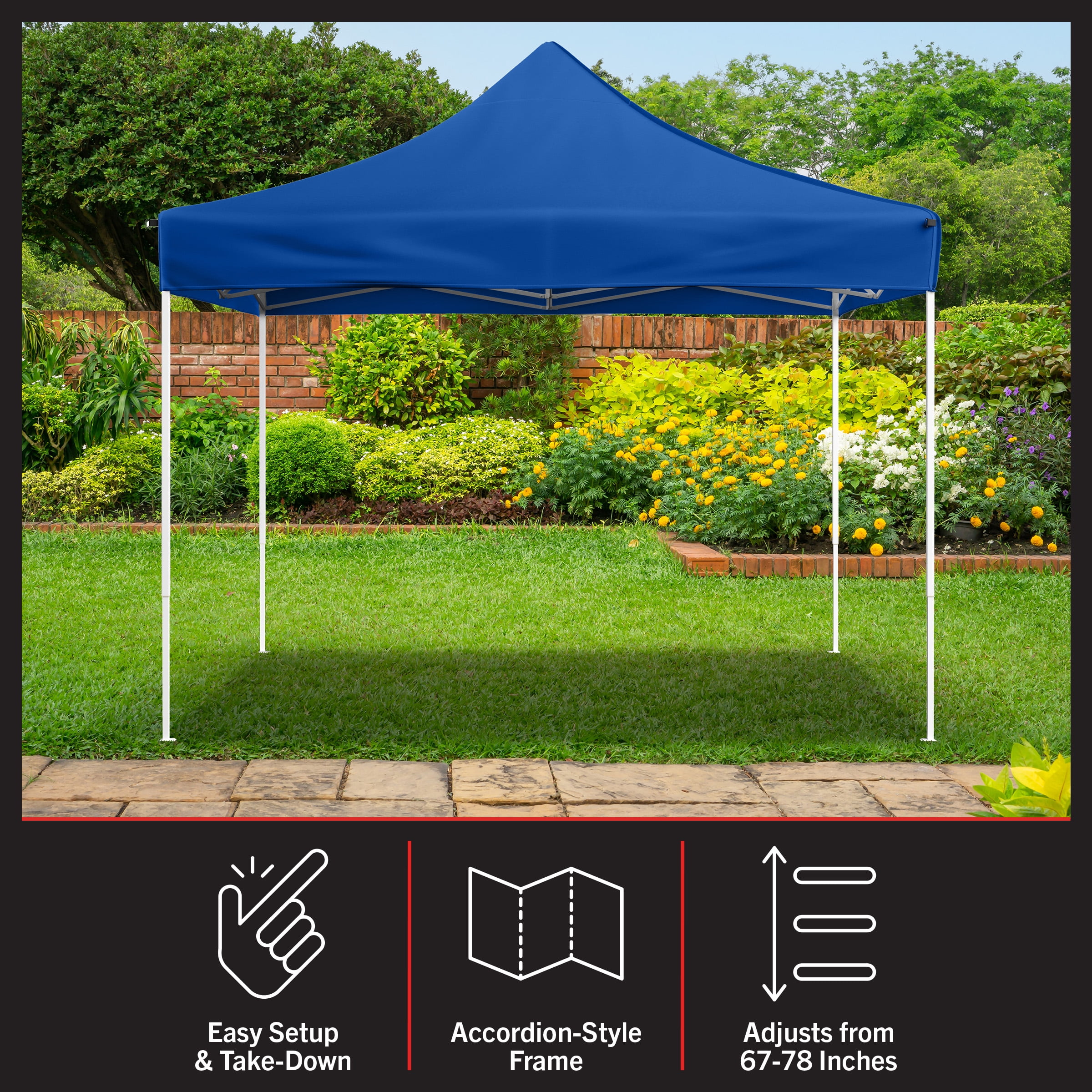 10×10 POP UP CANOPY – This canopy tent 10×10 ft shelter is made of 800D Oxford fabric that is both UPF30 UV-resistant and water-repellent. SETS UP IN SECONDS – The party tent features an accordion-style frame that allows for easy setup and take-down, and a carrying bag is included for easy storage and transport of the outdoor gazebo. CONVENIENT FEATURES – This blue canopy tent features a pinch-free lock system and comes with 4 stakes and guy lines to secure the pop up canopy tent on windy days. MULTIUSE SHELTER – The 10×10 canopy adjusts from 67 to 78-inches-tall for extra versatility, so you can use it as a beach canopy, tailgate tent, camping canopy, for fundraisers, or as an outdoor party tent. MATERIALS – Water-Repellent 800D Oxford Fabric and Steel. DIMENSIONS – (L) 120″ x (W) 120″ x (H) 120″; Collapsed: (L) 57″ x (W) 6.75″ x (H) 7″; Shade Canopy with 4 Stakes, Ropes, and Carrying Bag. COLOR – Blue.