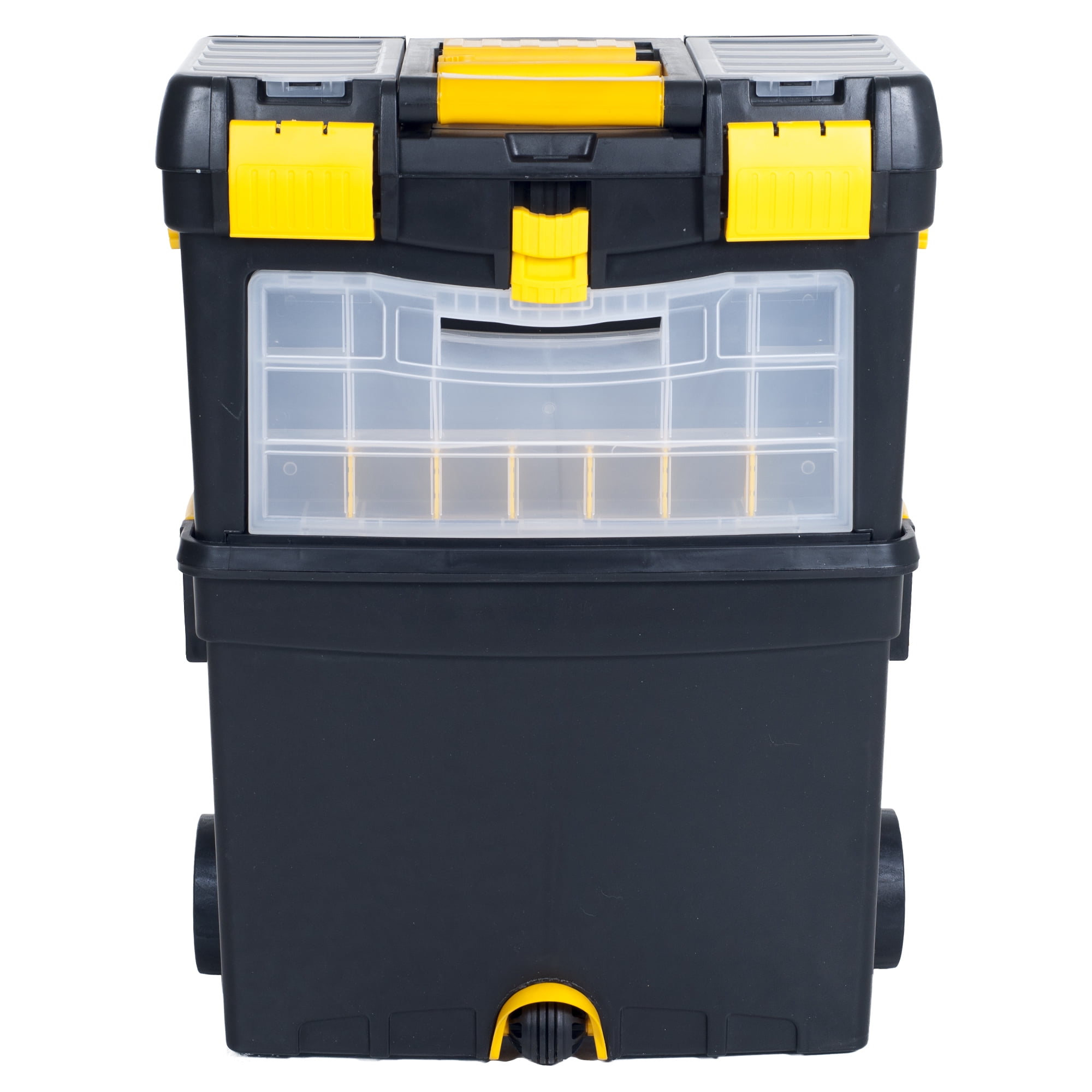 MOBILE TOOL BOX WITH WHEELS – This set of stackable tool boxes includes 24 small parts compartments, 2 removable trays, cable hooks, and a spacious deep bottom compartment. ROLLING TOOL STORAGE – The rolling toolbox has two 4.2-inch-tall nylon wheels that are 2-inches-wide to ensure easy, quiet movement of all your equipment between job sites. FOLD-DOWN HANDLE – The rolling cart has a fold-down handle with comfort grip that is attached to both tool bins to maneuver it around the garage or a workshop effortlessly. RUGGED DESIGN – This tool storage box is made of durable polypropylene and metal to keep your power and hand tools secure during travel or moving around rough construction sites. MATERIALS – Polypropylene and Metal. DIMENSIONS – (L) 17.5″ x (W) 10″ x (H) 24.5″; Top Compartment: (L) 17.5″ x (W) 7″ x (H) 9″; Bottom Compartment: (L) 16.25″ x (W) 9″ x (H) 12.5″. COLOR – Black and Yellow.