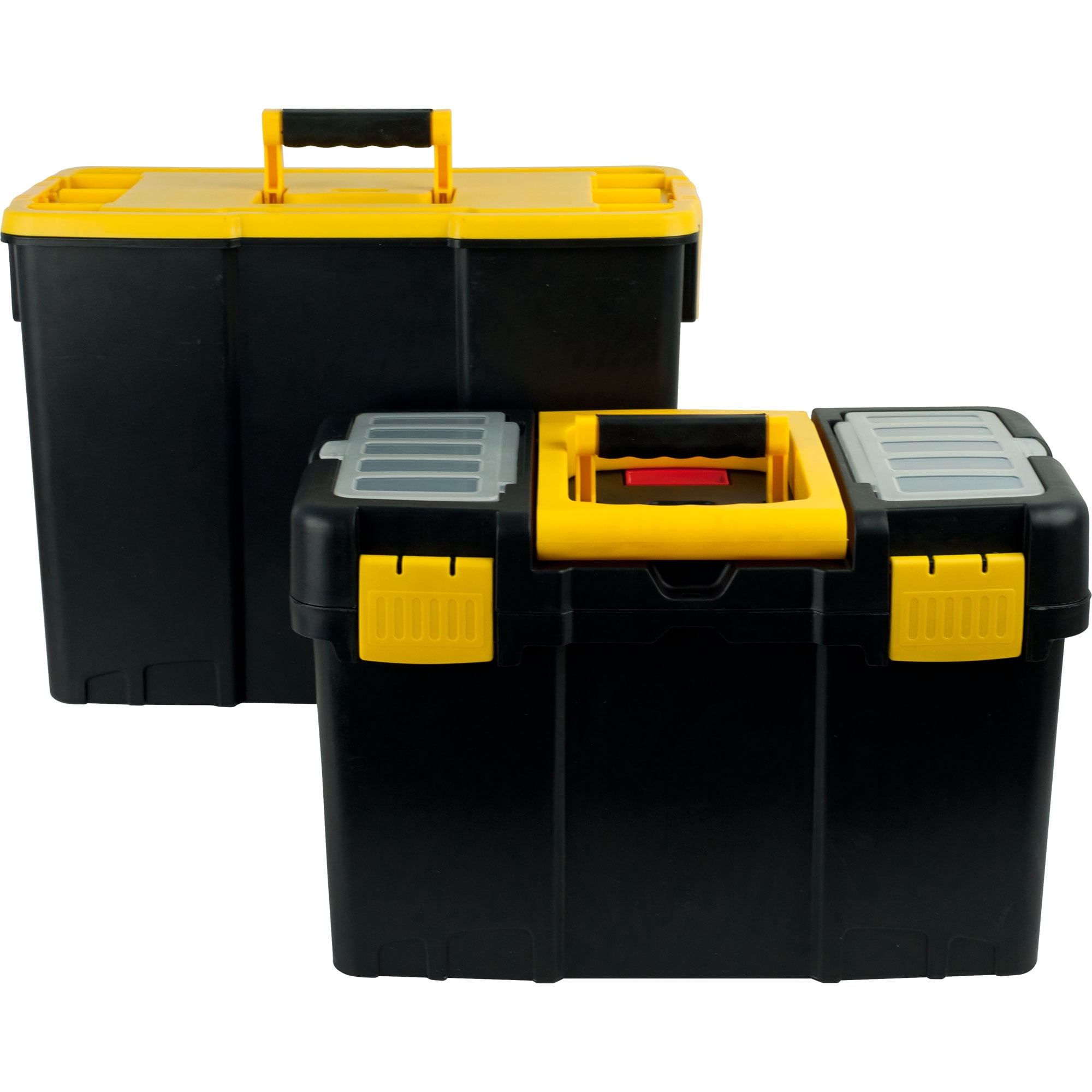 PLASTIC TOOL BOX ON WHEELS – This set of two tool boxes includes a traditional tool chest and a deep-bottomed storage compartment that latch together or can be used separately. ROLLING TOOL CART – This portable tool box features two wheels measuring 5.75-inch-tall and 2-inch-wide that roll smoothly to easily transport everything you need to off-site jobs. FOLD-DOWN HANDLE – A fold-down handle featuring a comfort grip is attached to both tool organizers letting you comfortably maneuver this tool chest around the garage or workshop. RUGGED DESIGN – Each tool box is lockable and made from durable plastic to keep your power and hand tools safe and secure during travel or moving around rough construction sites. MATERIALS – Plastic. DIMENSIONS – (L) 10″ x (W) 17.875″ x (H) 24.125″; Top Tool Organizer: (L) 9.875″ x (W) 17.75″ x (H) 11.5″; Bottom Storage Compartment: (L) 10.25″ x (W) 17.75″ x (H) 12.75″. COLOR – Black and Yellow. Spacious Main Compartment Measures: 9.875 x 17.75 x 11.5 inches Locking Latch Lid with Carrying Handle Easy Rolling Wheels Spacious Compartment: 10.25 x 17.75 x 12.75 inches