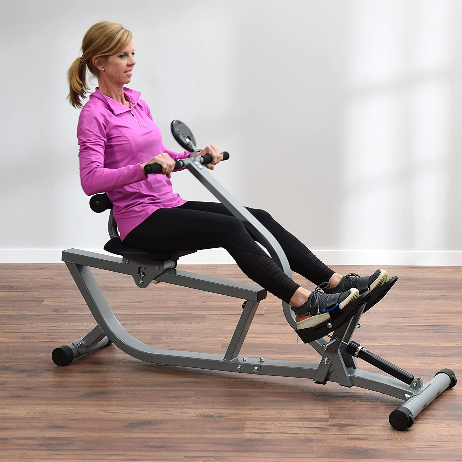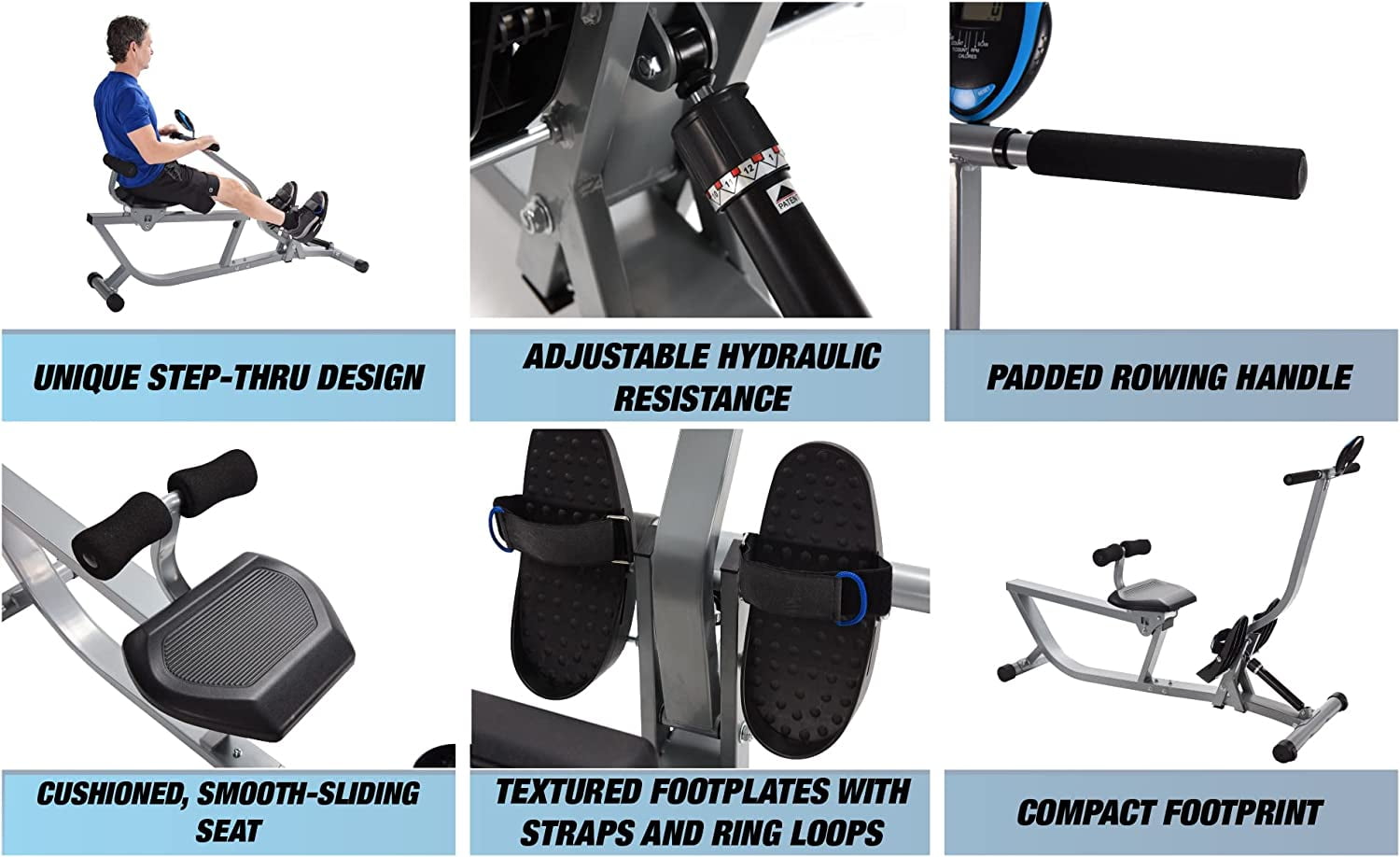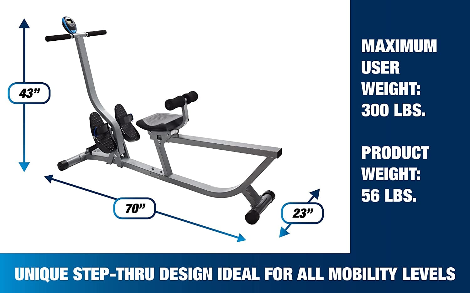 Stamina Active Aging Easy Row Rower: Ideal for users of all mobility levels Only step-thru design rowing machine on the market Instructional video included* Adjustable hydraulic resistance LCD monitor tracks time, count, total count and calories Large textured foot plates with adjustable straps Molded, cushioned seat and padded back rest Slightly angled rail for a gentle return Anti-skid endcaps Built-in transport wheels Internet access required to view instructional videos 300 lb Weight Limit
