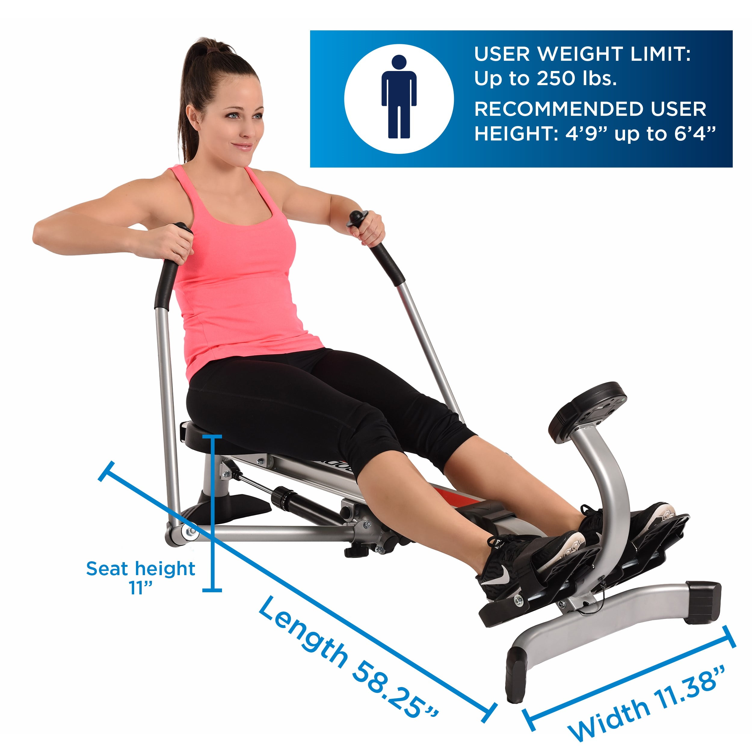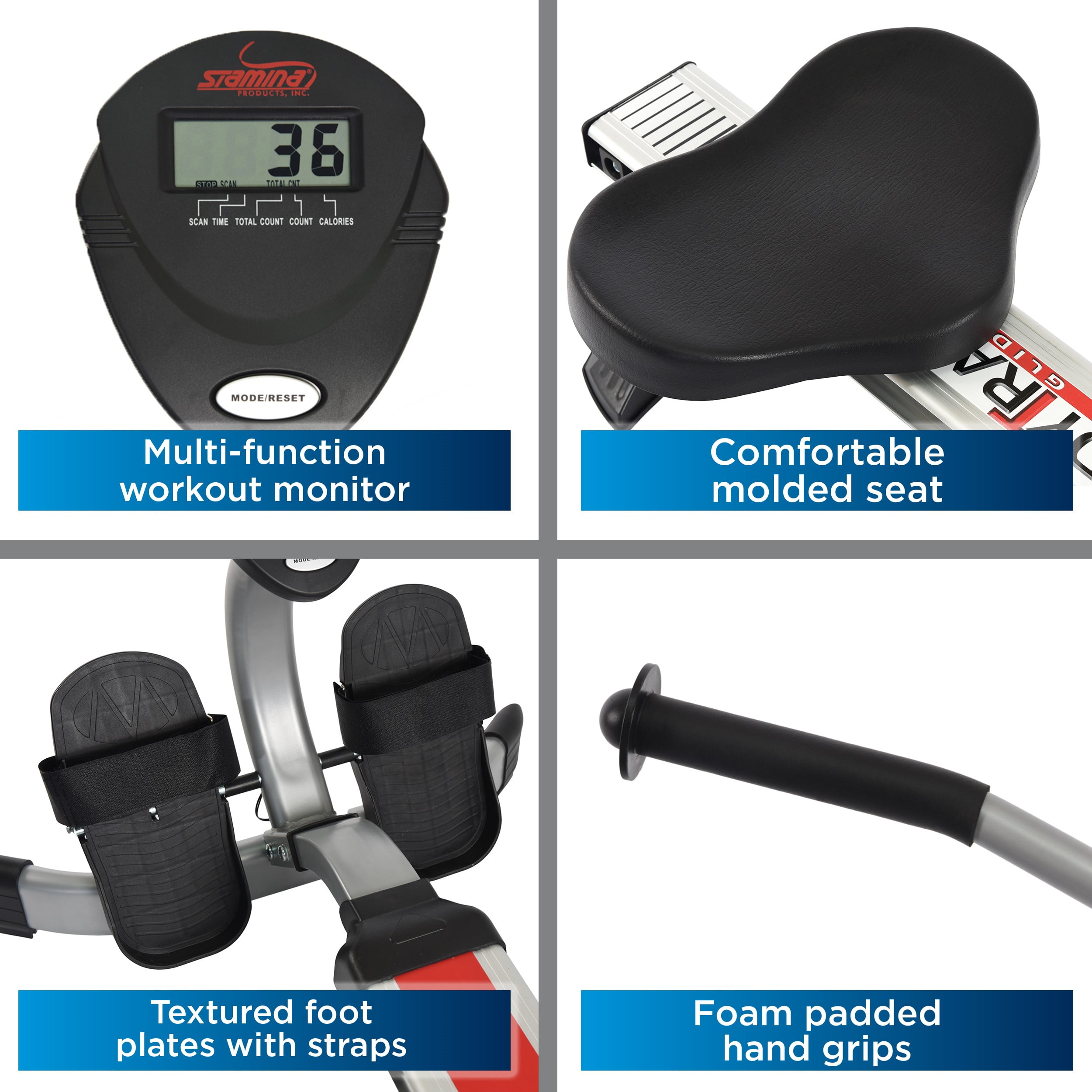 Stamina Body Trac Glider 35-1050 Gas Shock Rowing Machine, Black and Gray Innovative Design: full range of motion for effective rowing experience Durable Construction: sturdy steel frame and aluminum center beam for stability Smooth Operation: gas shock resistance for effortless rowing Progress Tracking: multifunction electronic monitor displays essential workout data Convenient Storage: folds easily for spacesaving storage Effective Workout: engages multiple muscle groups for comprehensive fitness LowMaintenance: easy to assemble and maintain Perfect for Home Gyms: compact, durable, and spaceefficient design Optimize Performance: electronic monitor helps you stay on track with fitness goals