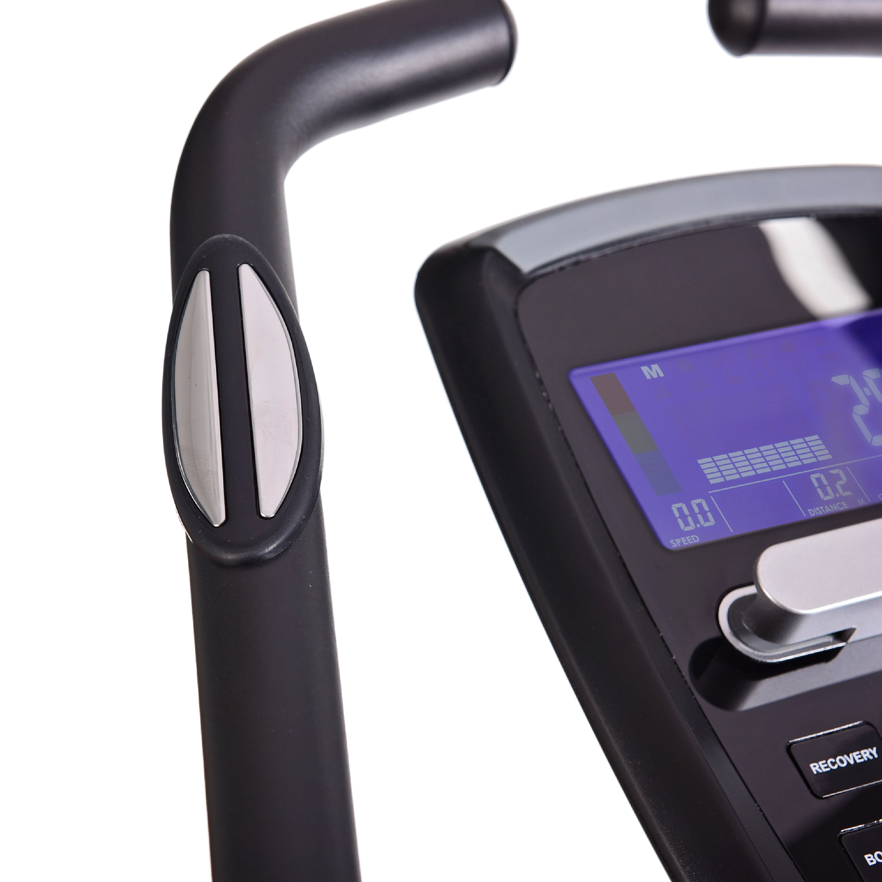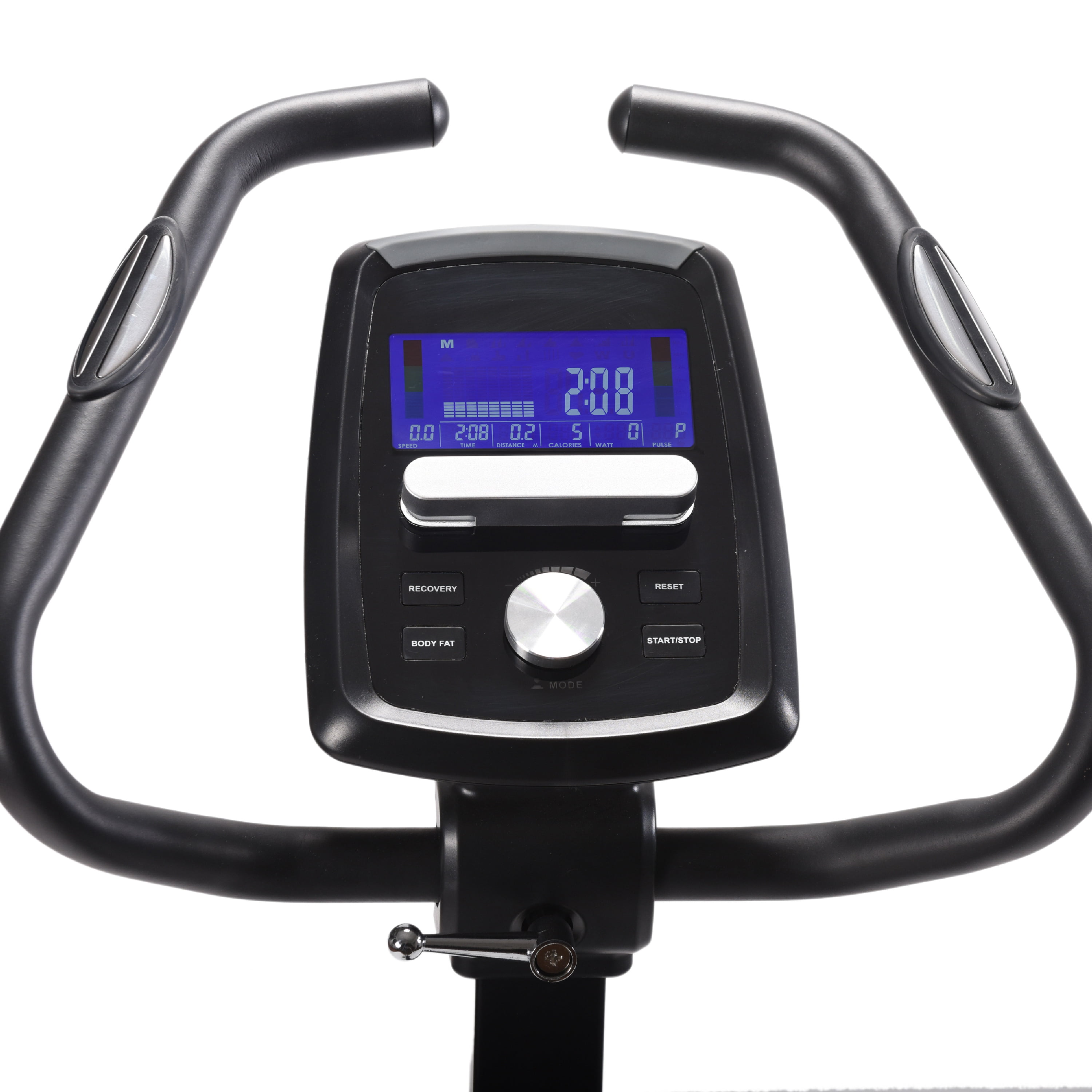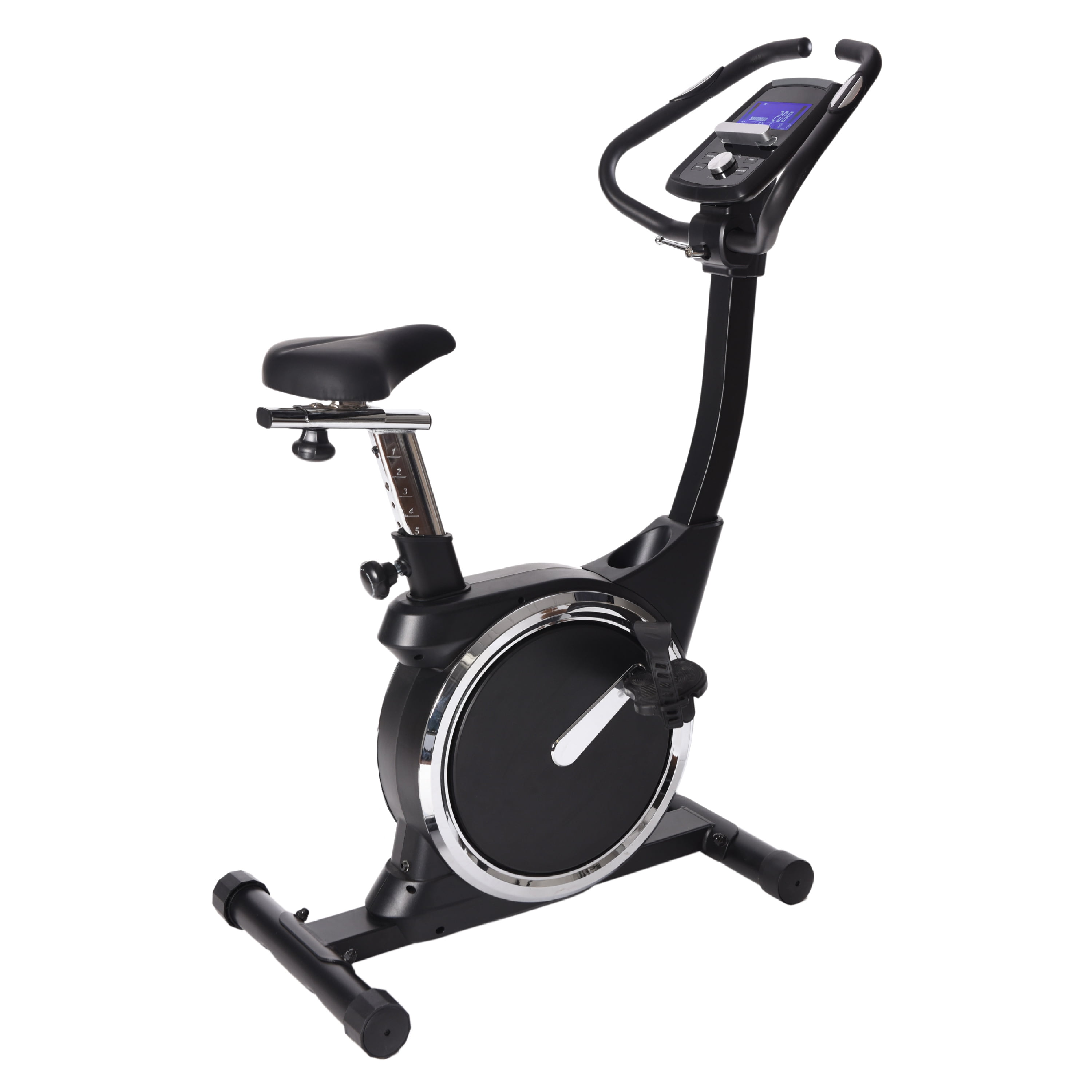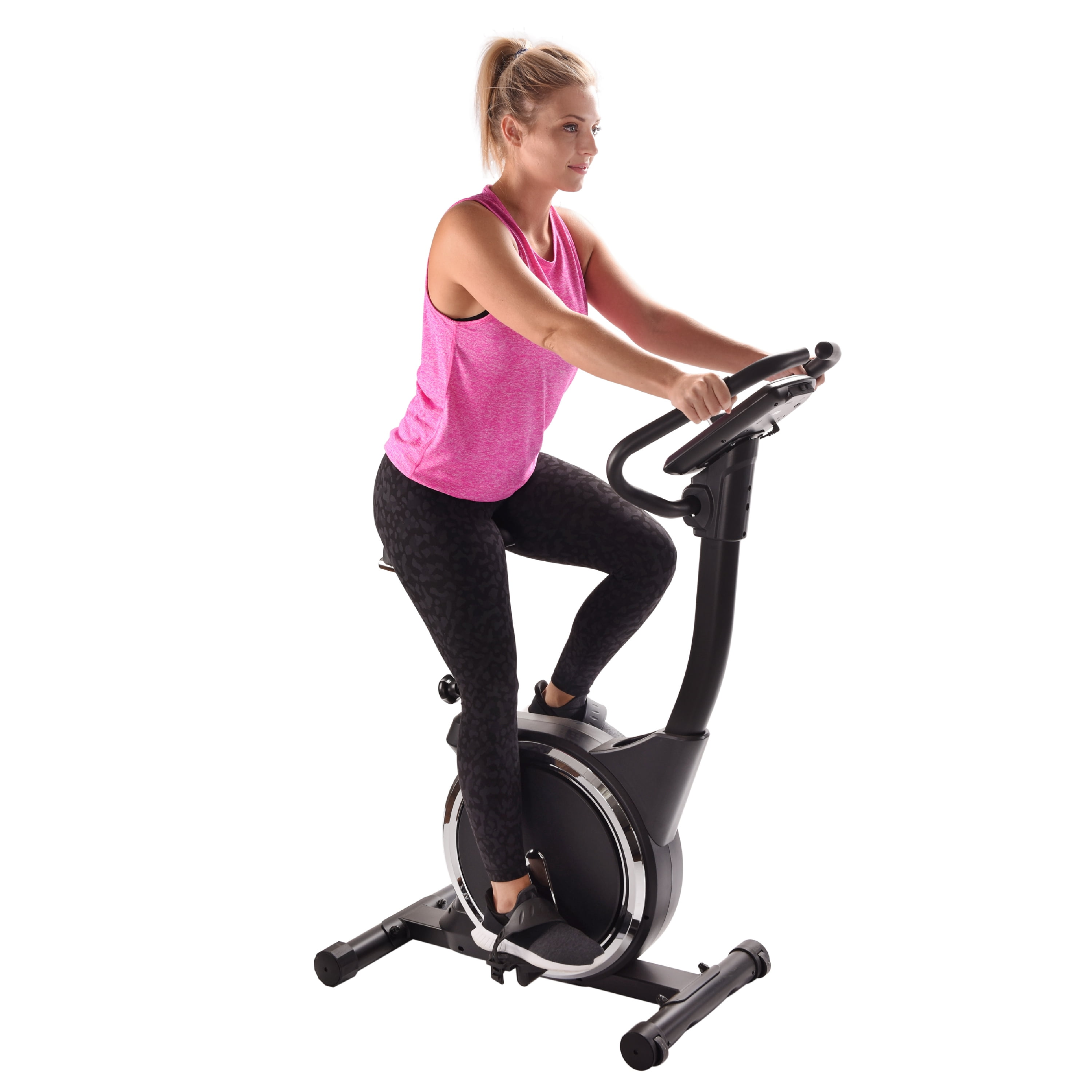 Stamina Deluxe Magnetic Upright Exercise Bike 345, 250 lb. Weight Limit Smooth, quiet, and adjustable magnetic resistance Track speed, time, distance, calories, RPM (rotations per minute), watts, and pulse with an easy-to-operate LCD monitor Customizable interval-based and metric-specific workouts Monitor body-fat percentage Padded handlebars with integrated heart rate sensors Textured pedals with adjustable straps Adjustable, molded padded bike seat Device tray for easy access during workouts Built-in drink holder Durable, premium construction Built-in wheels for easy transport