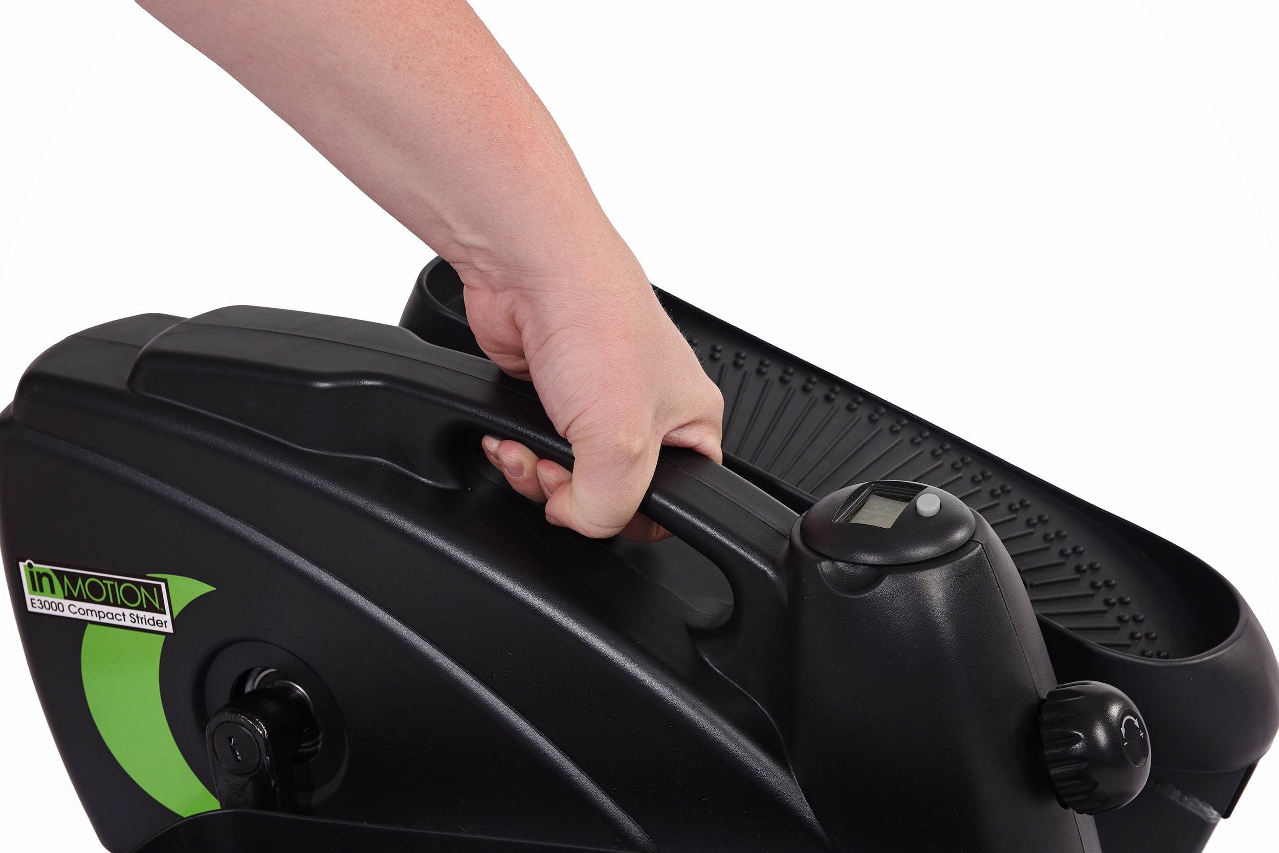 Stamina In Motion Compact Elliptical Strider with Resistance Tubes: Adjustable tension to control the workout intensity level Use while seated or while standing The foot pedals can be worked in a forward or reverse direction to target your lower body in different ways Convenient handle for easy portability Electronic fitness monitor displays the number of strides per minute, the total number of strides, exercise time, and calories burned or scan all stats Medium resistance tubes with padded, adjustable handles Includes workout DVD Magnetic Resistance Sturdy steel construction, non-slip pedals Footprint: 24″ x 18″ Stride Length: 7 inches Model# 55-1621 portable elliptical Weight Limit: 205 lbs.