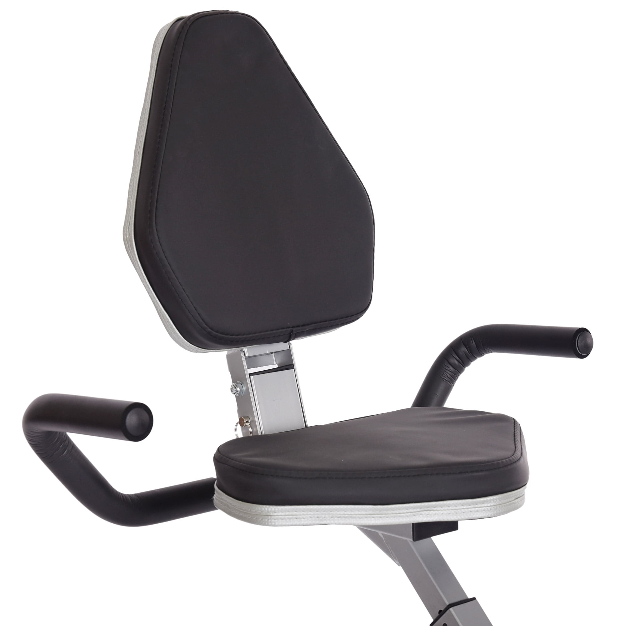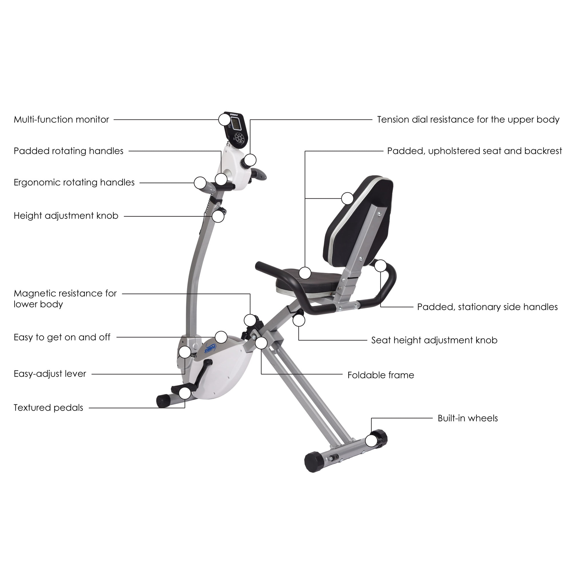 Stamina Recumbent Exercise Bike with Upper Body Exerciser, 250 lb. Weight Limit Easy to get on and off Scanning, multi-function monitor 8 levels of quiet, magnetic resistance for the lower body Tension dial resistance for the upper body Multiple grip positions for upper body: padded handles and ergonomic handles Padded, stationary side handles for more stability during lower body work Textured pedals to reduce slippage Padded, upholstered seat and backrest Easy-adjust lever for the upper body handles Height adjustment knob for upper body handles Seat height adjustment knob Built-in wheels for transport Foldable frame for easy storage