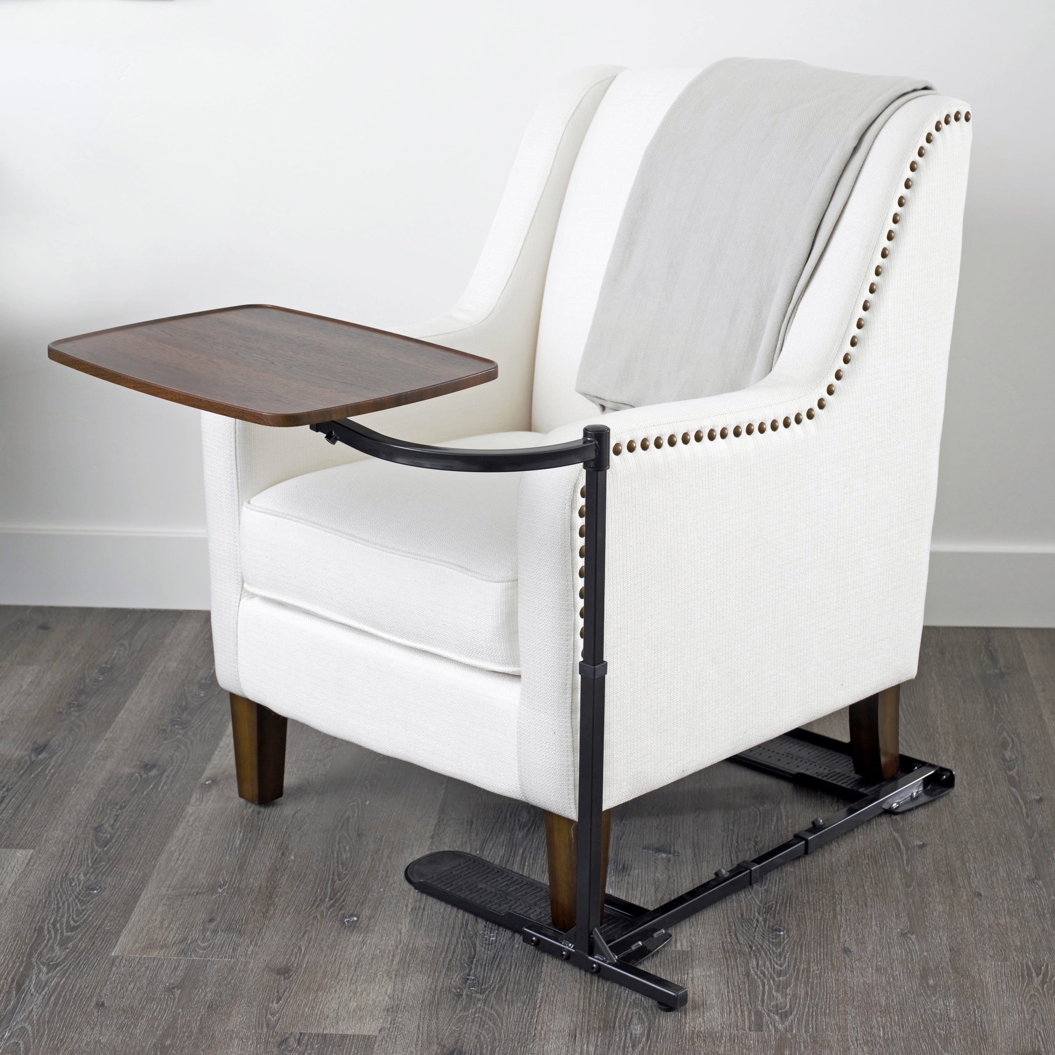 Large, oversized TV tray table for eating, working, or gaming; supports 20 lbs Arm pivots and tray swivels 360 degrees Curved arm puts tray right where you need it Table top extends in height from 20 to 30 inches tall Adjust base from 20 to 32 inches wide to sit underneath furniture Compatible with most any couches, chairs, lift chairs, and recliners