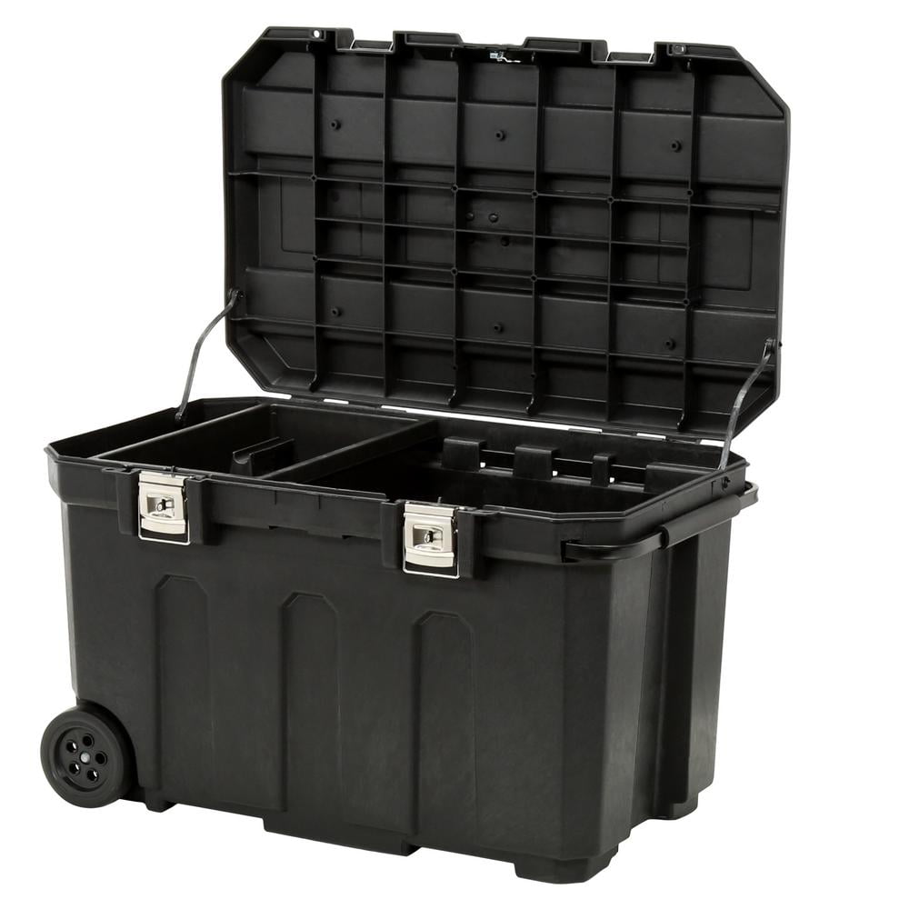 Stanley 037025H 50-Gallon Mobile Chest: Wide work surface on lid that includes a pair of 2″ x 4″ saw grooves Pull-out steel handle with soft grip for easy maneuverability Large, nickel-plated metal latches Lock and keys included with Stanley 50-gallon mobile chest Wide, heavy-duty rubber-coated wheels