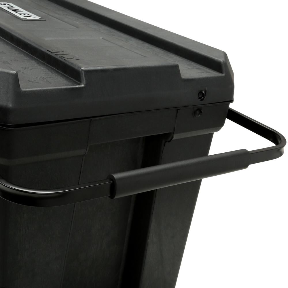 Transport tools and equipment in the Stanley 037025H 50 Gallon Mobile Chest, keeping them nearby and within reach at all times. The large capacity accommodates a variety of items and the high-density structural foam construction is durable yet lightweight. Nickel-plated metal latches keep the lid firmly closed and a lock and keys add a further layer of security. On top of the Stanley 50-gallon chest are two grooves, allowing for laying a plank of wood across them and working with a saw. A pair of wheels and a pull-out steel handle with a cushioned, comfortable grip offer convenient portability. The wheels are also coated in heavy-duty rubber.