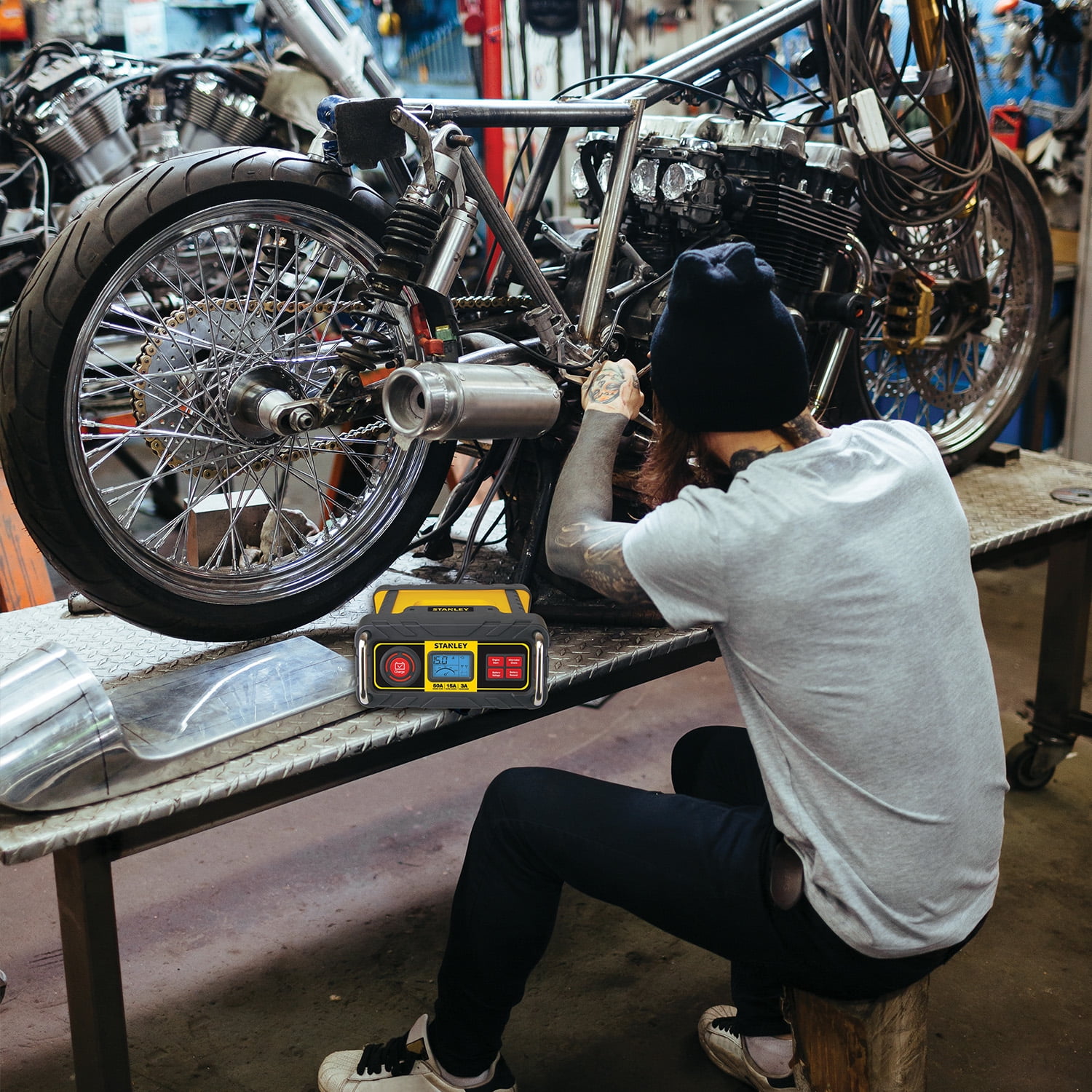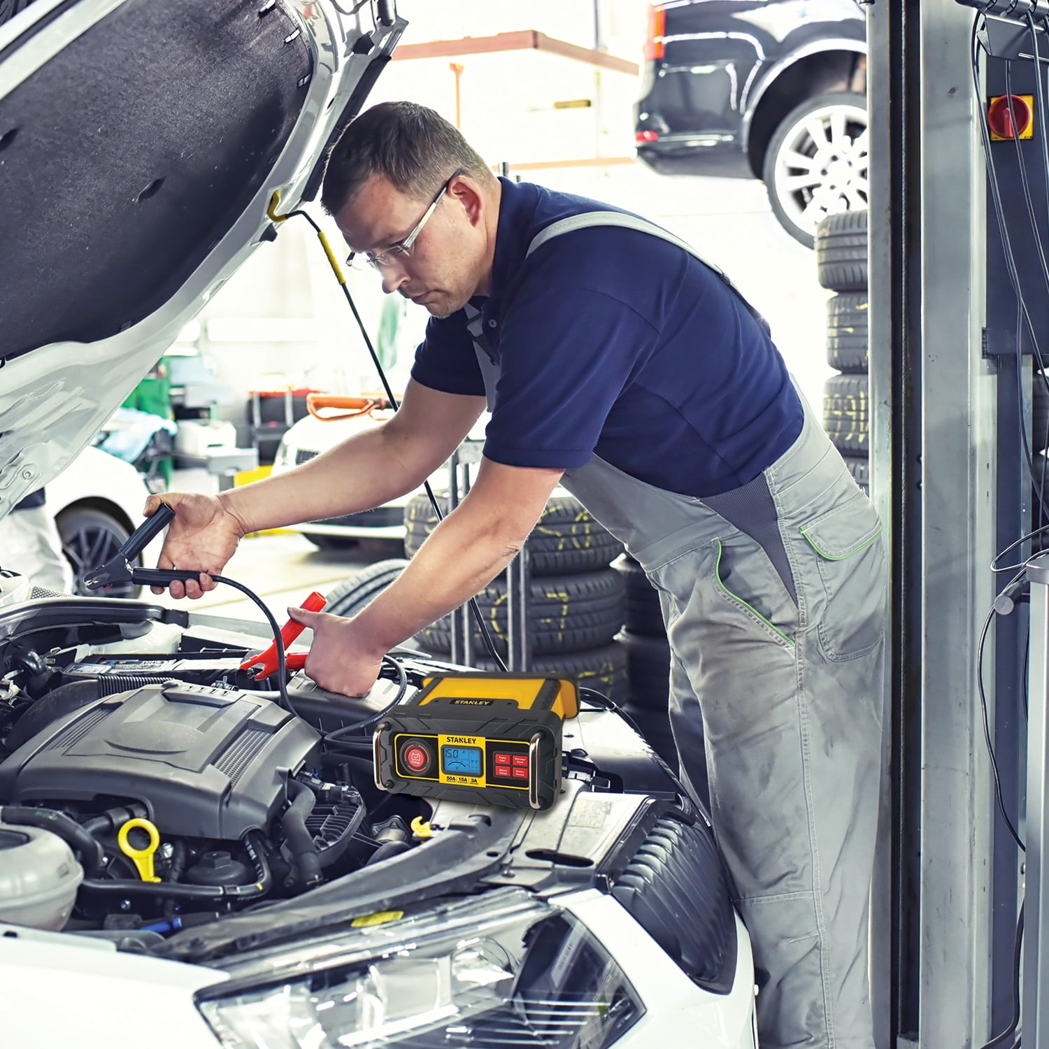 Get back on the road in minutes with the Stanley BC50BS 15 Amp car battery charger. This 12V battery charger automatically does the rest for optimum performance. With fast, high-frequency technology, it delivers 3-stage charging – automatically switching from Bulk to Absorption top off. This battery charger is also perfect for motor homes, jet skis, lawn tractors, generators, or vehicles that sit idle for months at a time. One of the most advanced chargers on the market, the Stanley Bench Charger features a digital LCD screen that displays charging status and battery status with easy-to-understand icons. It also includes a powerful 50 Amp Engine Start patented alternator check to evaluate the battery voltage under load to indicate if the alternator is maintaining battery level. Even if the cables are connected to the wrong terminal, the screen alerts you While many other battery chargers require you to select various settings like battery type and size, the Stanley BC50BS 12V battery charger is fully automatic and charges up to 40 percent faster than other conventional chargers. Need to get back on the road quickly. The charger also features a patented Engine Start Timer to boost your vehicle battery in approximately 8 minutes.