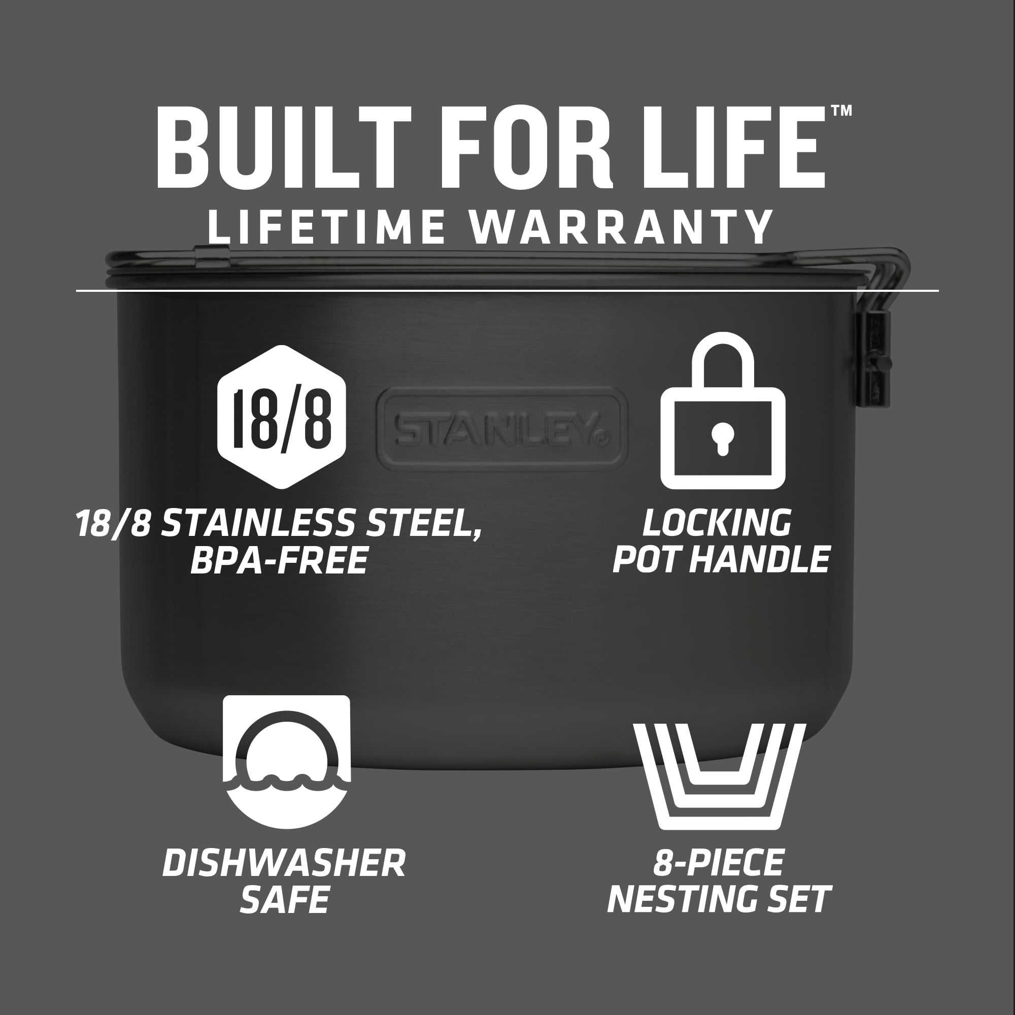 CAMP LIKE A PRO: Everything you need to whip up a hearty meal. This Stanley Adventure Two Bowl Camping Cookware Set with 8-piece camping accessories set includes (2) bowls (20 oz/591 ml, (2) bowl lids that double as cutting board, spatula with extending handle, ladle with extending handle, pot (1.58 qt / 1.5 l), and stainless steel vented pot lid. SPACE SAVING DESIGN: We’ve designed the whole set to nest together to save on space. LEGENDARY STANLEY QUALITY: Whether you’re camping, hiking, backpacking, or tailgating, these outdoor camping accessories withstand all the adventure. The dishwasher-safe pots and pans are made using 18/8 stainless steel that won’t rust or break. PERFECT GIFT: looking for the best gifts for outdoorsmen? A Father’s Day, Christmas, or birthday gift for the man obsessed with nature? This Stanley Cook Set is just what you need to celebrate the occasion. LIFETIME WARRANTY: ‘BUILT FOR LIFE’. Since 1913 we’ve promised to provide rugged, capable gear for food and drink, built to last a lifetime. It’s a promise we still keep. Stanley products purchased from Stanley Resellers come with a lifetime warranty.