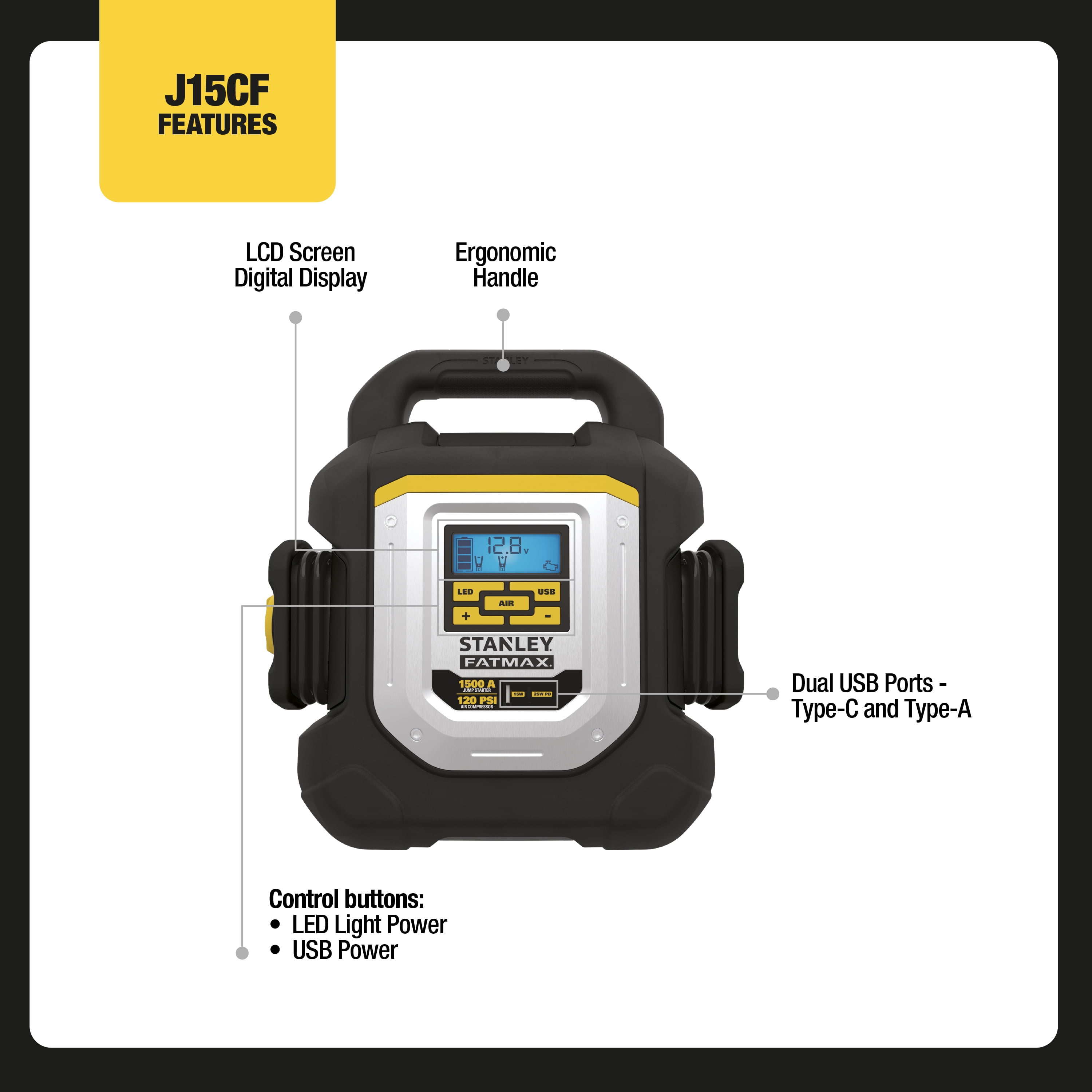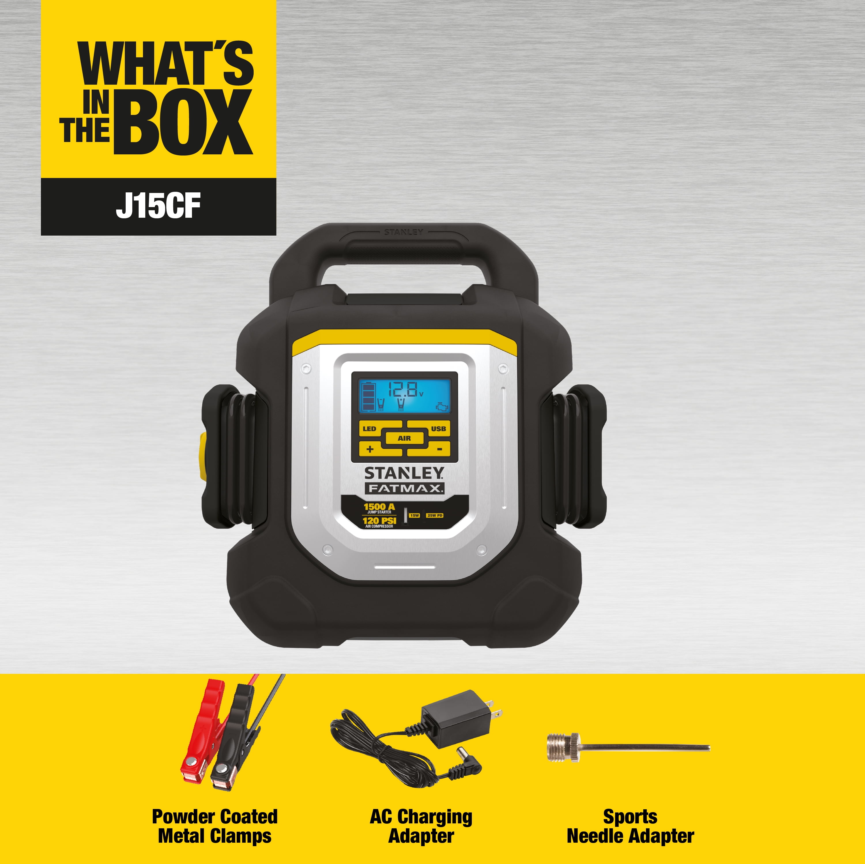 With the Stanley J15CF Jump Starter with Digital Compressor and USB Power Bank, you no longer need to dread roadside emergencies when your vehicle won’t start. This portable Jump Starter delivers serious power with 1500 peak amps. That’s enough power to jump-start a 12-Volt AGM, GEL or WET battery up to a V8 Engine; all without the need to use another vehicle. Simply connect the clamps to the battery, turn on the switch, and start your vehicle. The reverse polarity alarm will alert you when there is an improper connection. 15W USB-A and 25W USB-C power to charge devices on the go. A high-powered LED light and LCD screen readout with real-time information helps you work in the dark. This jump starter is equipped with a digital 120 PSI air compressor with AUTOSTOP technology and a Sure Fit nozzle to help inflate tires, sports equipment and more. For optimal performance, the unit should be charged every 30 days when not in use. Once used, the unit should be charged immediately overnight. Includes a limited 1-year manufacturer warranty. Metal powder-coated clamps for durability. New.