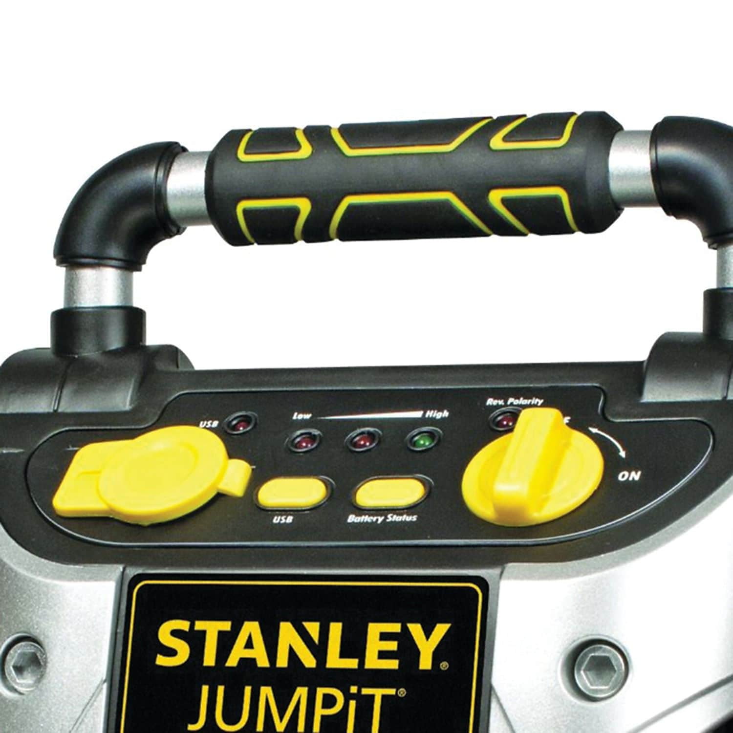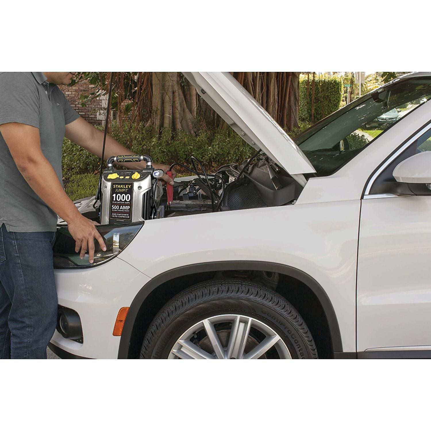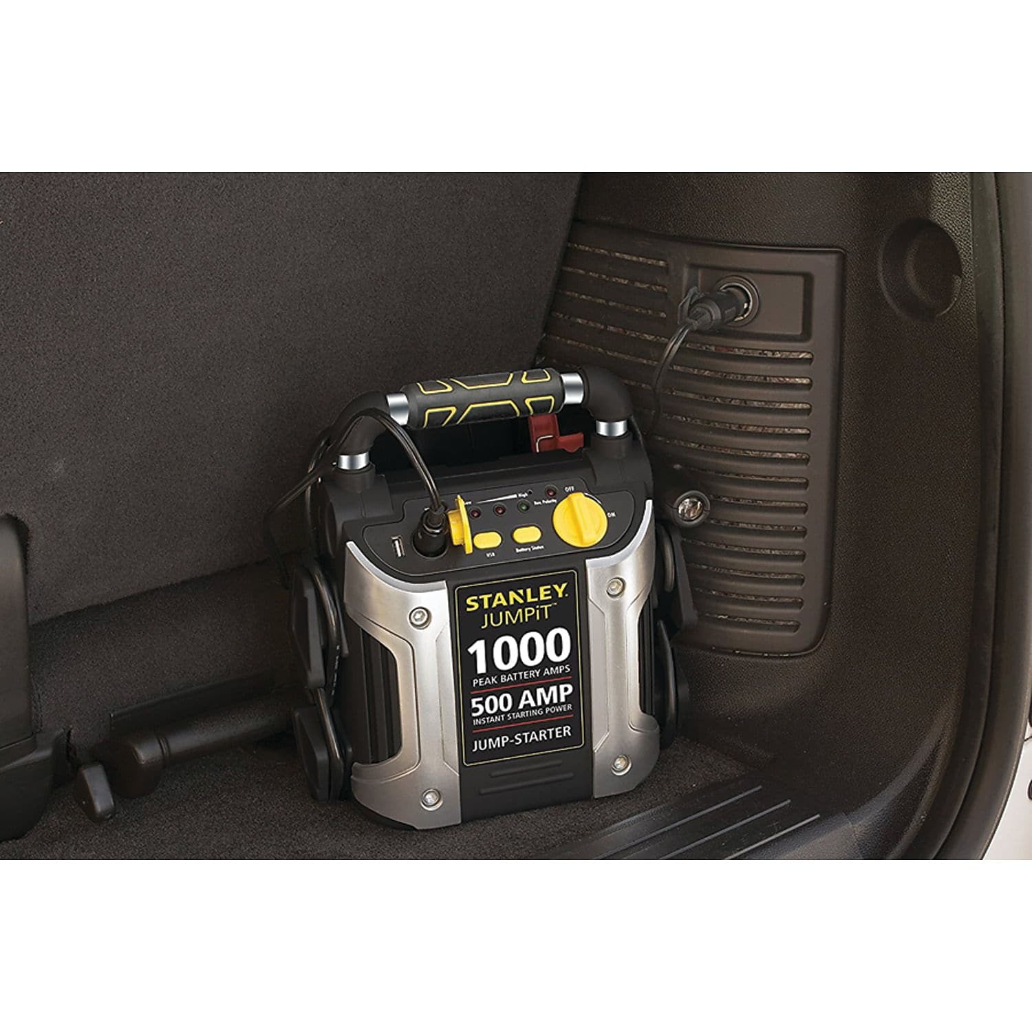 The Stanley 1000 Peak Amp Rechargeable Jump Starter with Air Compressor can jump start your car in no time. Use for a quick charge of a wide range of 12V AGM, GEL and WET batteries without the need for another vehicle. The built-in 120-volt AC charger recharges the unit with a standard household extension cord (not included.) New.