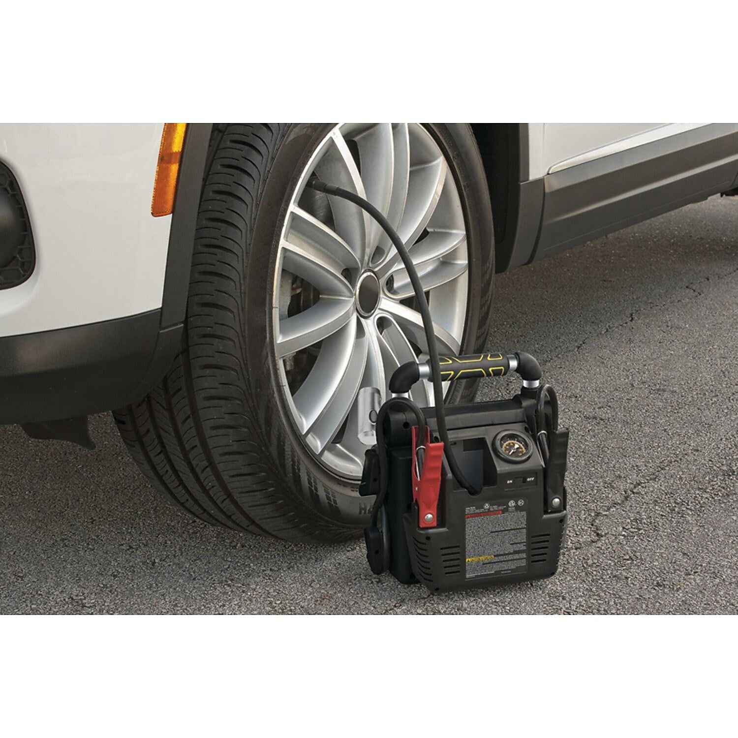 1,000 amps peak; 25-in. 6 gauge cables with all-metal, powder-coated clamps for long life 120-PSI compressor with backlit gauge; heavy-duty, brass-tipped SureFit compressor nozzle securely connects to tire valve stems Compressor can also inflate sports equipment using the sports needle adapter 12-volt accessory outlet to power other automotive accessories and 1 USB-A outlet to charge personal electronics High-powered LED rotates 270°; ideal for roadside emergencies Reverse-polarity alarm alerts when there is an improper connection Power and charge indicator Metal handle with rubber overmold grips for easy carrying Built-in 120-volt AC charger recharges unit with standard household extension cord Dimensions: 13.25 in. H x 8.125 in. W x 11.25 in. L Weight: 17.75 lbs. ETL/Intertek listed Includes AC cable, 12-volt DC charging adapter, and nozzle adapters New