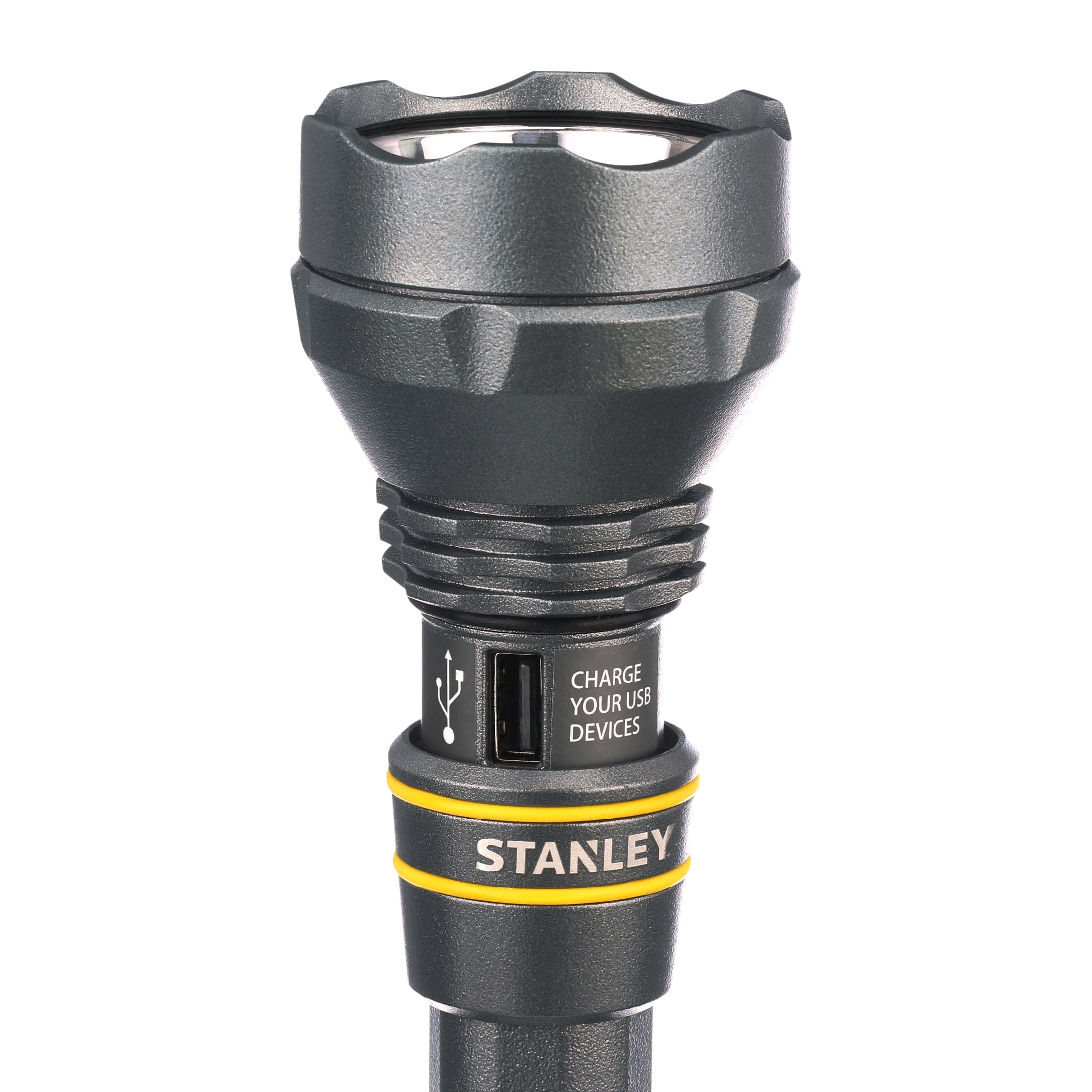 The Stanley 1000 lumen LED rechargeable flashlight is a practical solution for the campsite, the worksite, or unexpected power outages. It combines a tough, waterproof aluminum housing with high-intensity LED, and a rechargeable lithium-ion battery to provide up to 9.5 hours of continuous illumination on a single charge. It’s also got 2-way USB charging, allowing the flashlight to double as a portable power bank and charge up your smartphone or personal electronics. The integrated lithium-ion battery can hold a charge for up to 12 months in storage, making it a practical choice for emergency use. The Stanley 1000 lumen LED rechargeable flashlight.