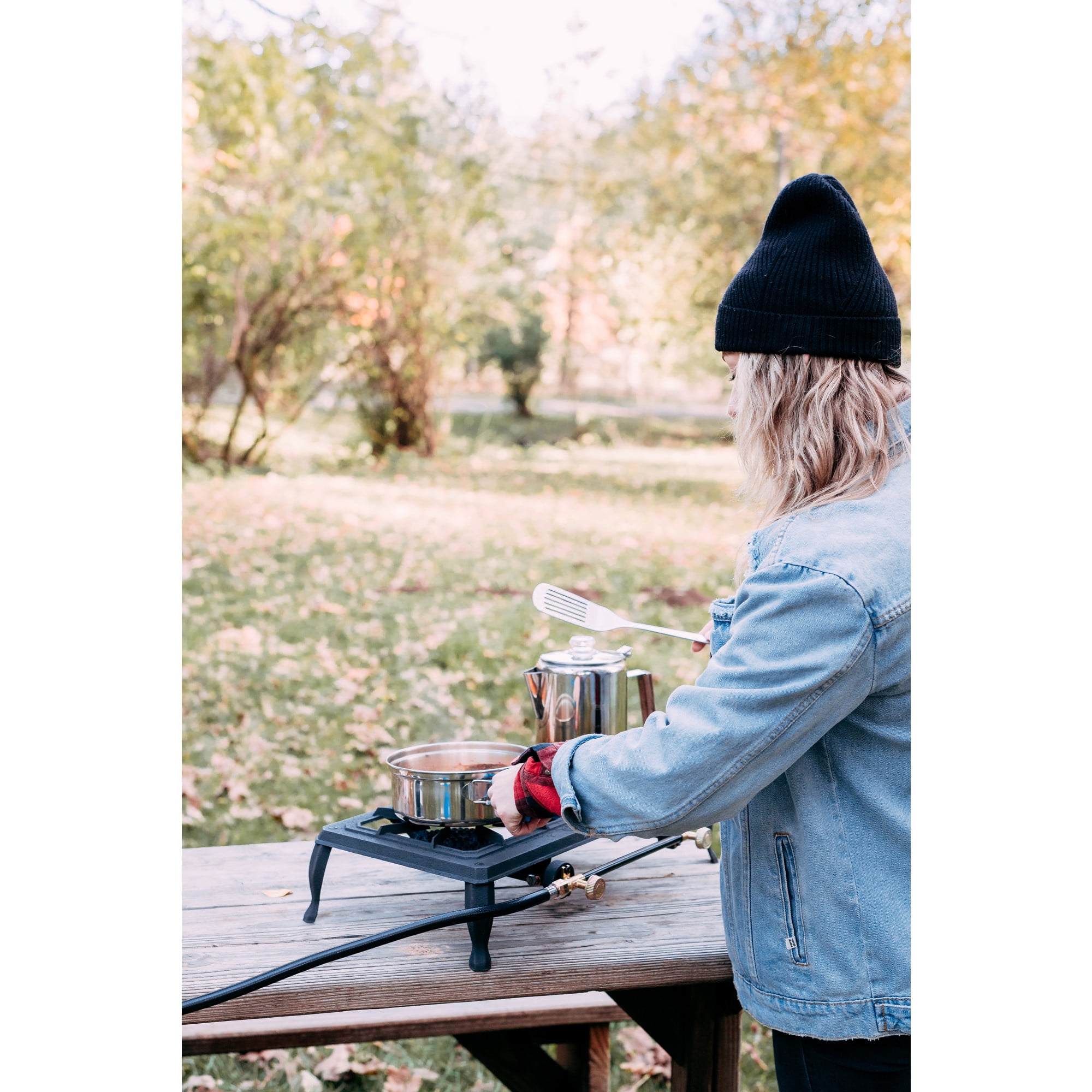 Great for cooking those special outdoor meals High output 15000 B.T.U. cast iron burner (30.000 total BTUs) Powder coated for long lasting durability Sturdy cast iron stove frame Hose with regulator included