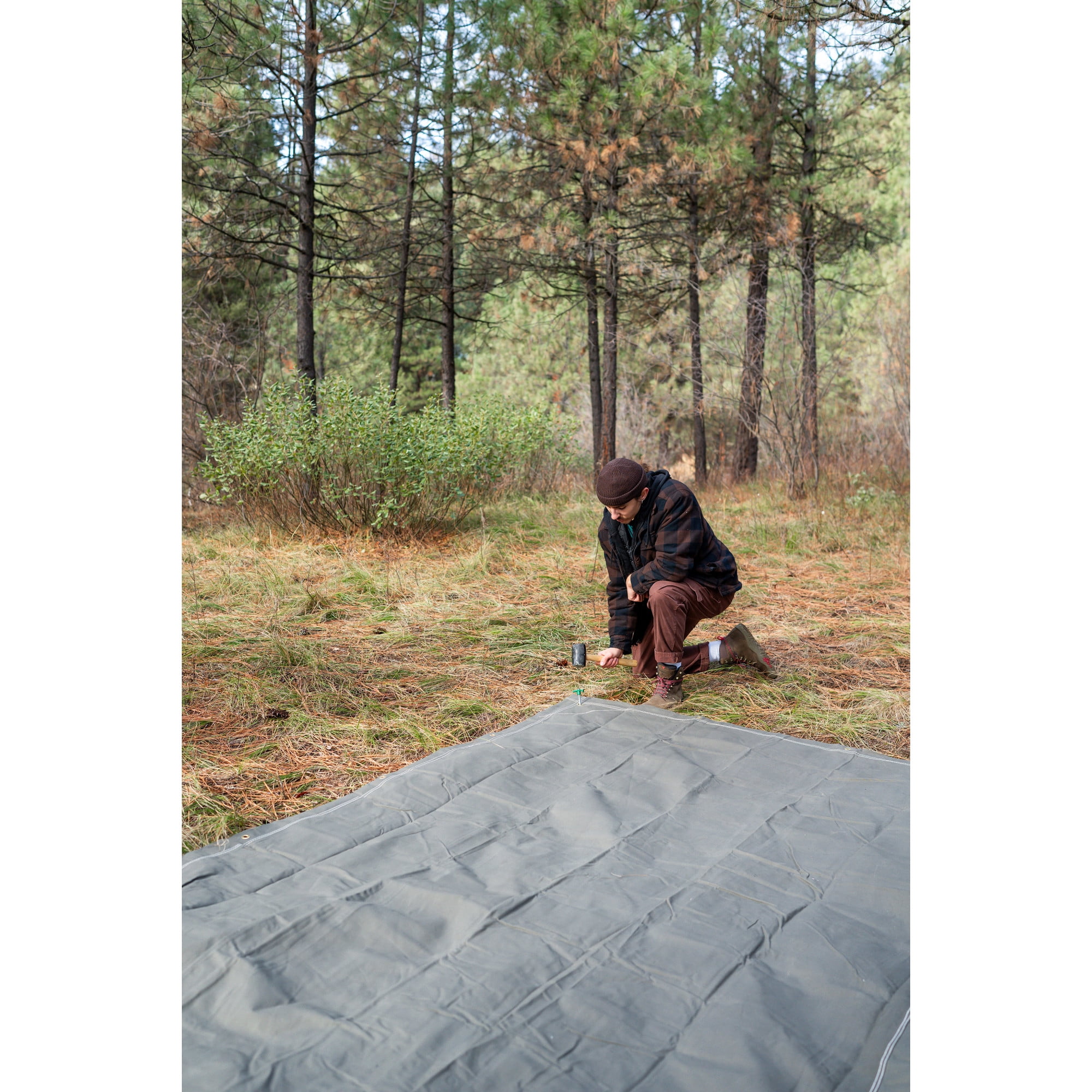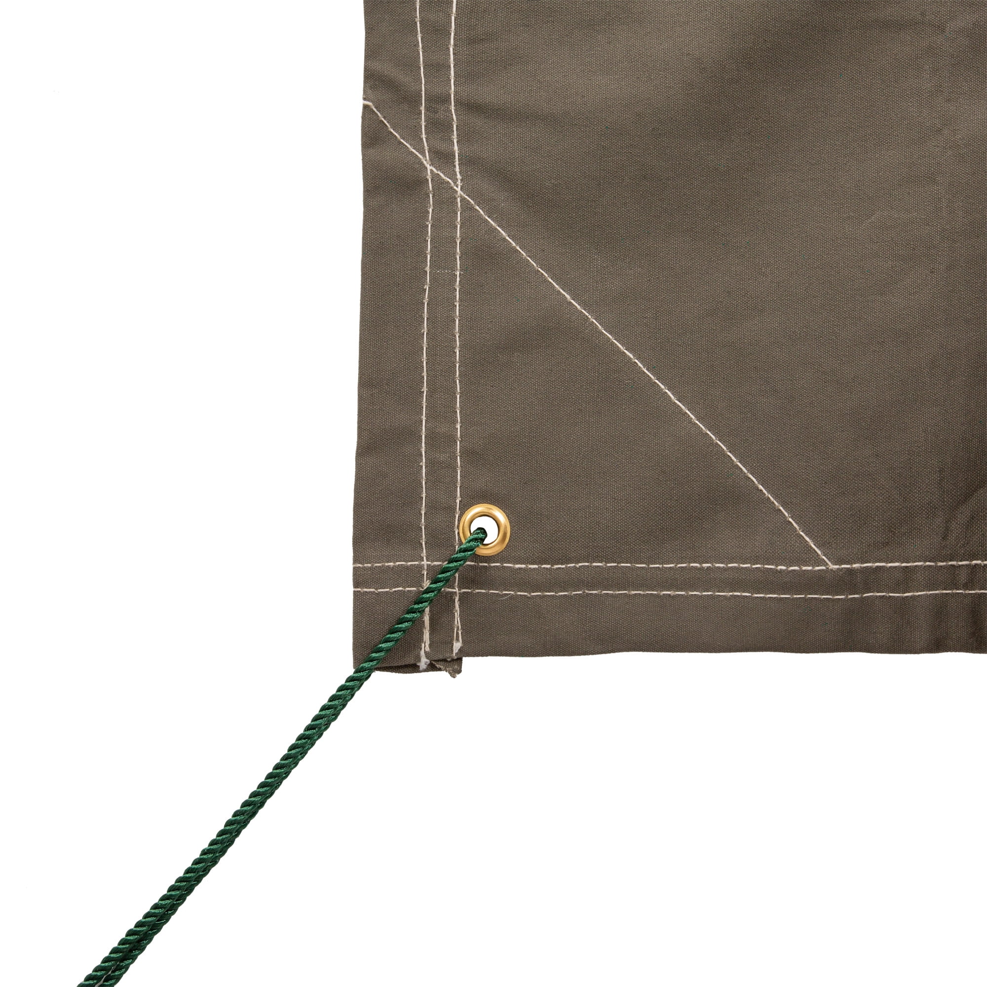 Heavy-duty cotton canvas tarp is tough, durable, and reusable. Perfect for use as a groundcloth, dropcloth, protective cover, canopy, and much more. 12 oz. cotton duck canvas is treated for water repellency. Reinforced brass grommets Cut Size: 12’ x 14’ (3.66m x 4.27m)