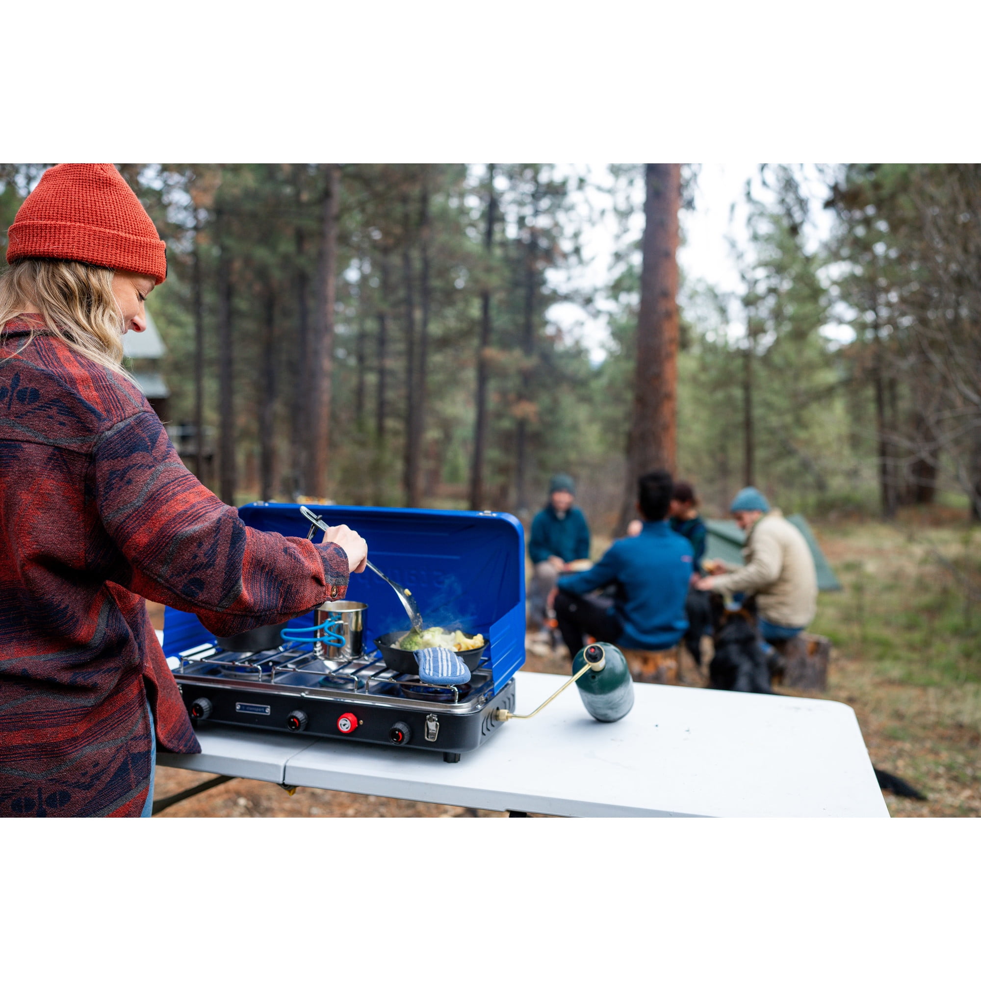 This Stansport 60,000 BTU 3-Burner Propane Stove starts with 2 oversized, stainless steel burner heads with 25,000 BTU of cooking power each. Nestled between them is a 10,000 BTU center burner-ideal for warming sauce or boiling pasta. With the included piezo electronic ignition, you don’t need matches to start cooking. It also comes with a regulator for easy control of your fuel. A steel frame and stainless-steel drip pan ensure this stove is durable and easy to clean. Total of 3 burners.