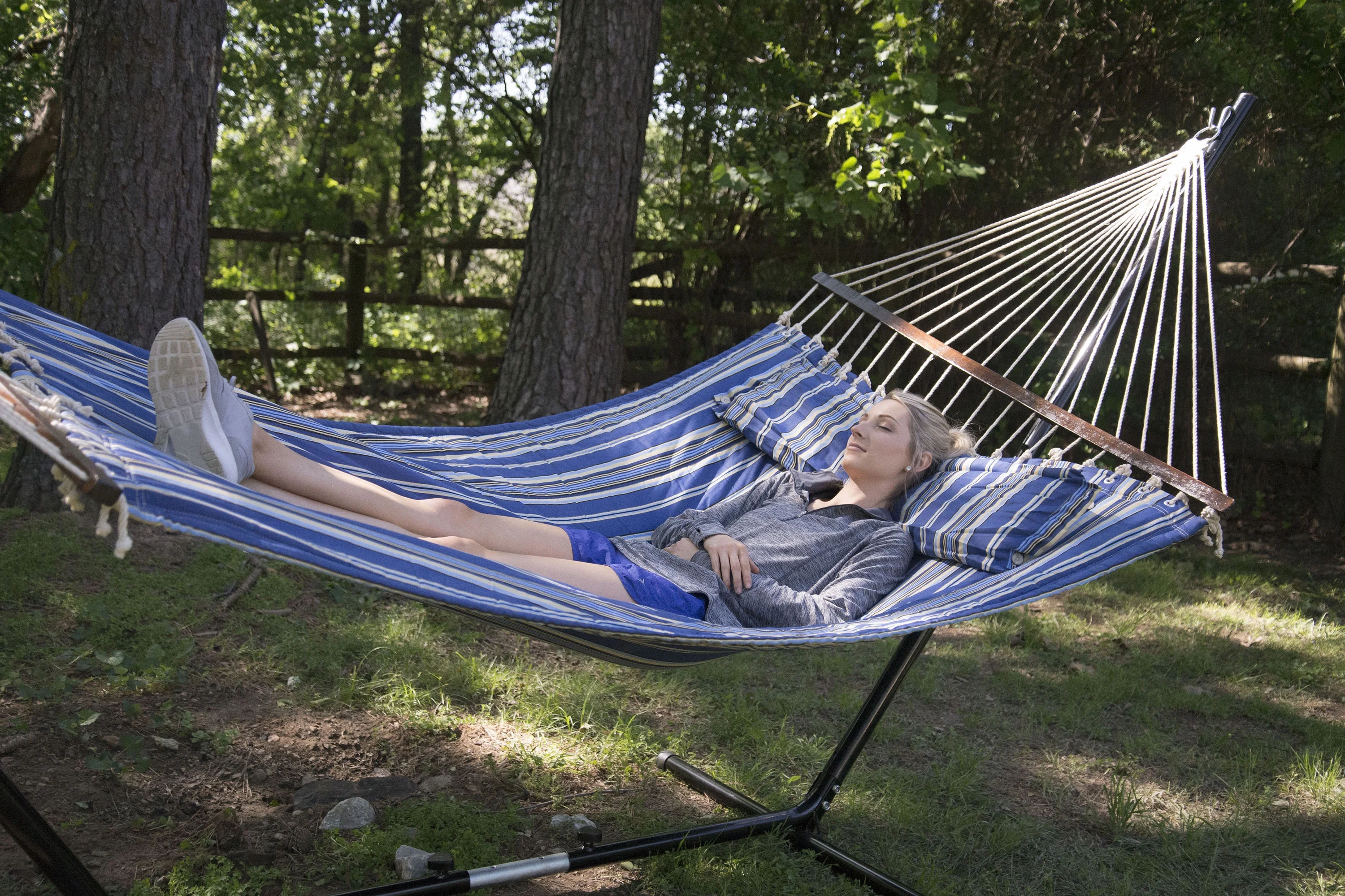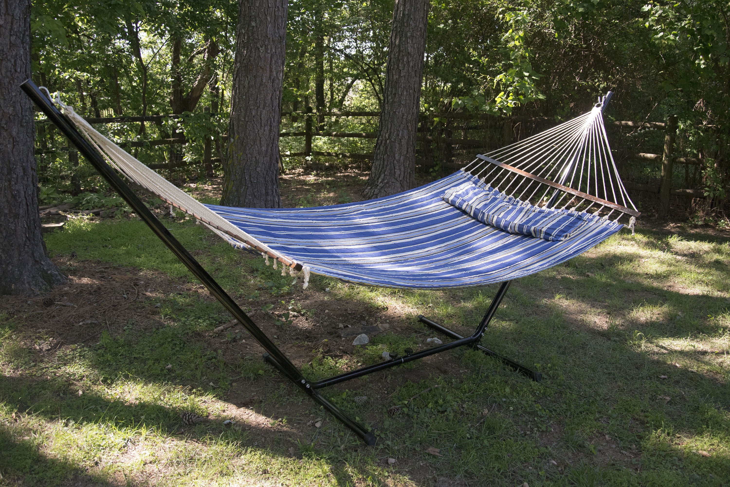 The Stansport Sunset Quilted Hammock features a ultra strong and breathable padded cotton canvas and hardwood spreader bars with strong attaching ropes with welded attaching rings. Size: 55″ X 79″. Weight limit of 400 lbs. Stand not included.